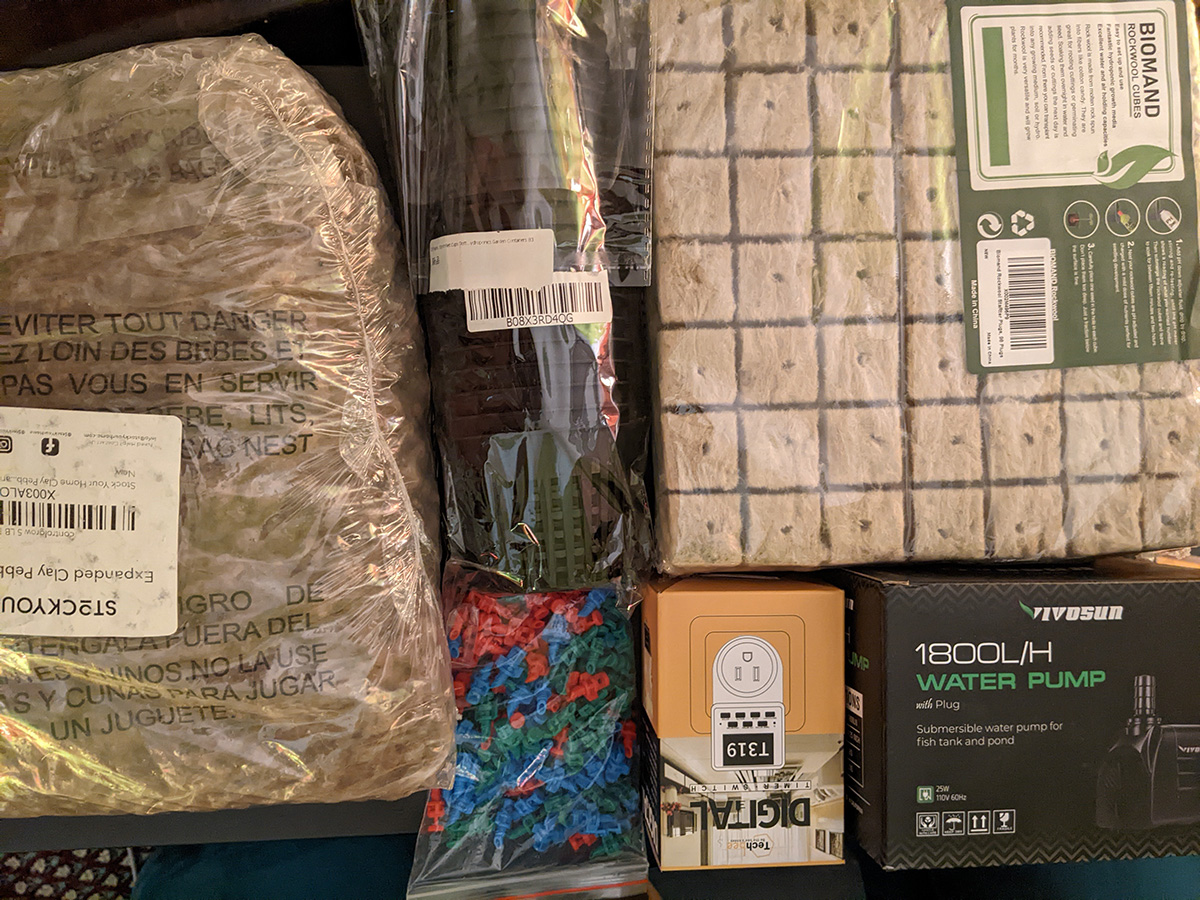 a lot of my aeroponics supplies arrived: vivosun 480gph submersible pump ($13.79), 5lbs of leca (clay aggregate) ($19.99), 90 pieces of 1.5" rockwool starter plugs ($16.49), 180 pieces of micro sprayer jets ($9.54), short interval repeat cycle timer ($12.95), and 25 3 inch net cups ($6.75). the only thing i'm missing now is the hydroponic nutrients which won't arrive until next week, and i need to get a plastic tote and PVC pipes for making the spray manifold. i will also need to get a 3 inch hole cutting drill bit.