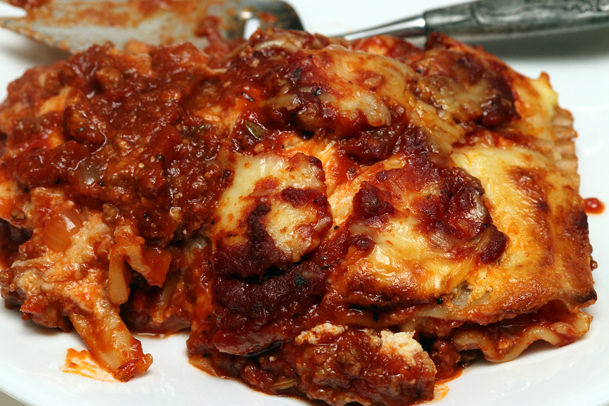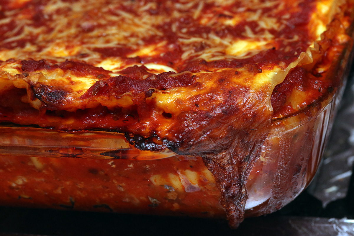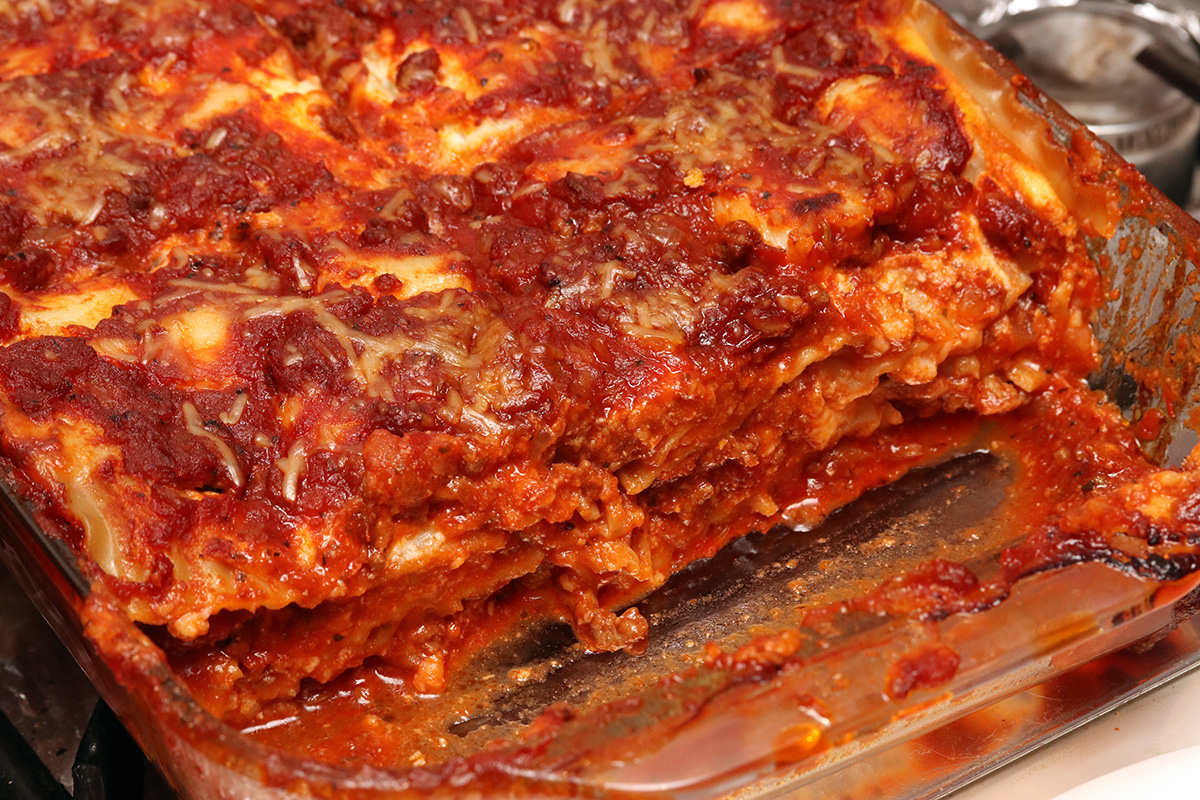 | making the sauce: cook ground beef and italian sausage. added chopped onion and garlic. add canned tomato ingredients, wine, and remaining spices. let simmer low-heat for 1-1/2 hours. assembling the lasagna: preheat oven to 375°. cook lasagna noodles. mixe ricotta cheese with egg. cube mozzarella cheese. order of layers: meat sauce, noodles, ricotta, mozzarella, meat sauce, parmesan, noodles, ricotta, mozzarella, meat sauce, parmesan. bake for 45 minutes. | |