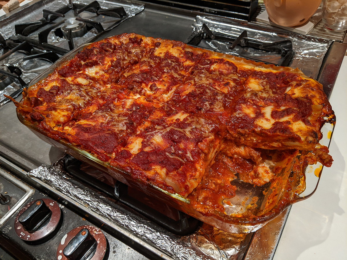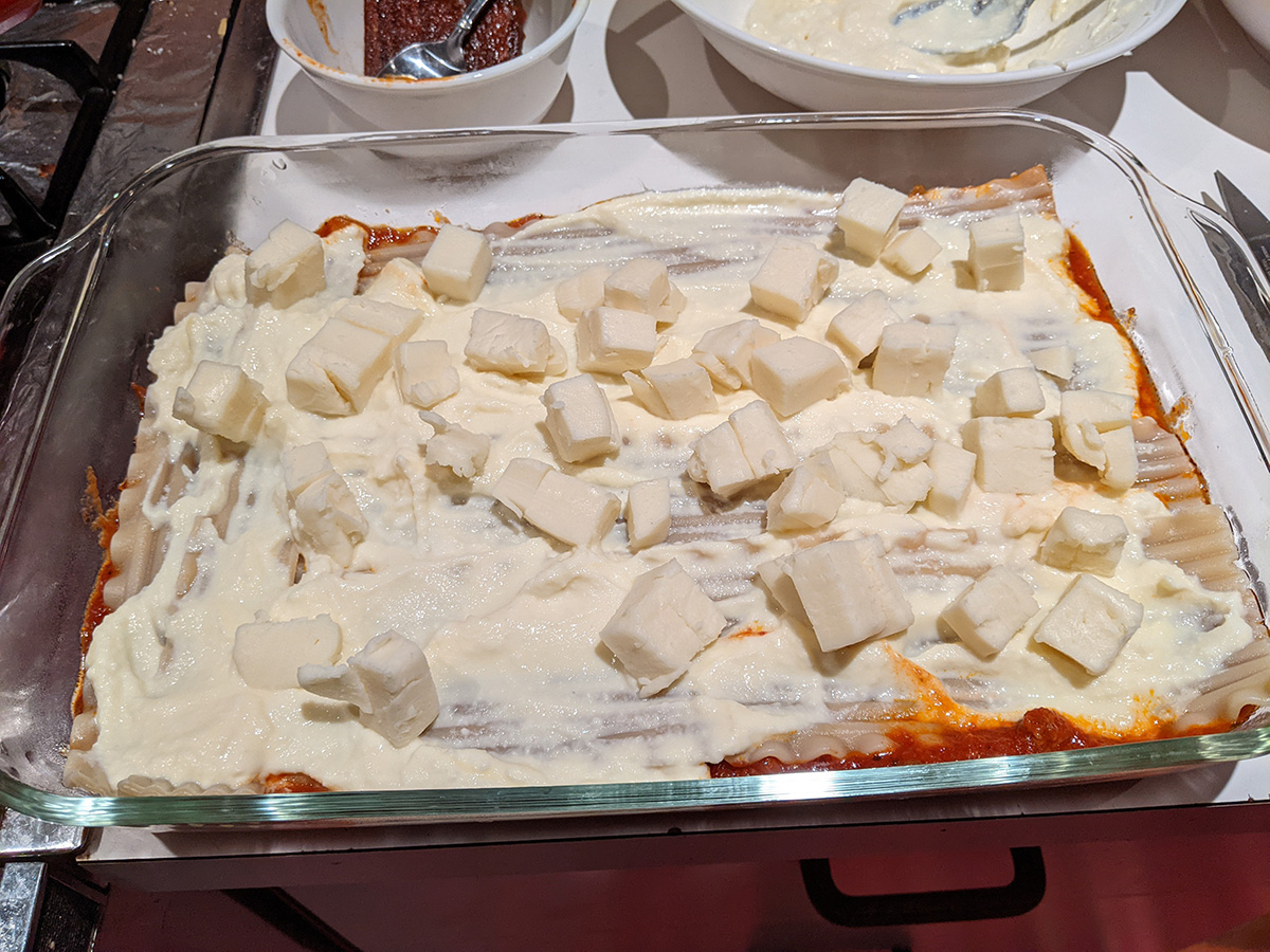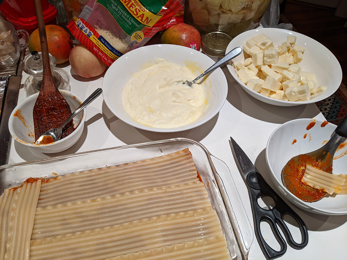the layering was a layer of meat sauce first, followed by noodles, then ricotta cheese, mozzarella cheese, then another layer of meat sauce, sprinkled with parmesan cheese, and repeated one more time for a final layer of meat sauce and parmesan. the sauce itself - after simmering - tasted really good - but combined into the lasagna, i didn't like it compared to my usual all beef lasagna. the sausage had a sweetness that i wasn't used to. i wore the gopro on a chest harness to get some cooking footage, it had a tendency to miss the action by being either too low or too high. when it was just right though, the footage looked like a first-person-shooter game, except you're cooking. i didn't eat until 9pm, had two pieces.