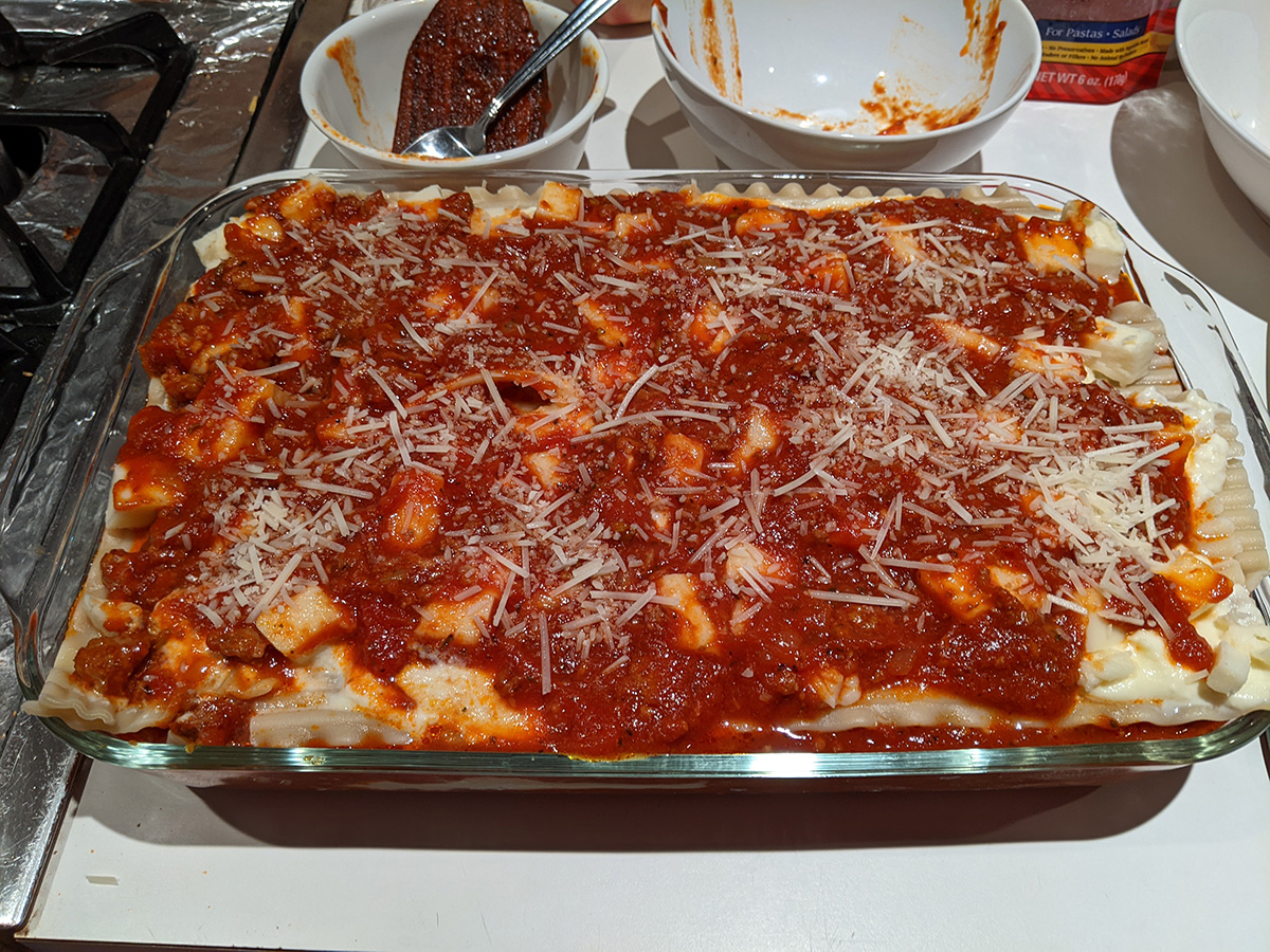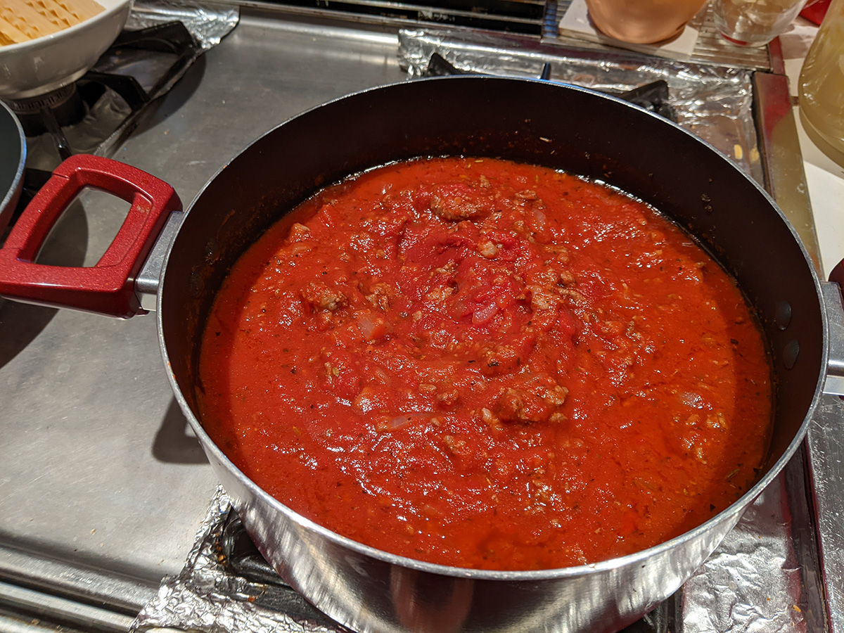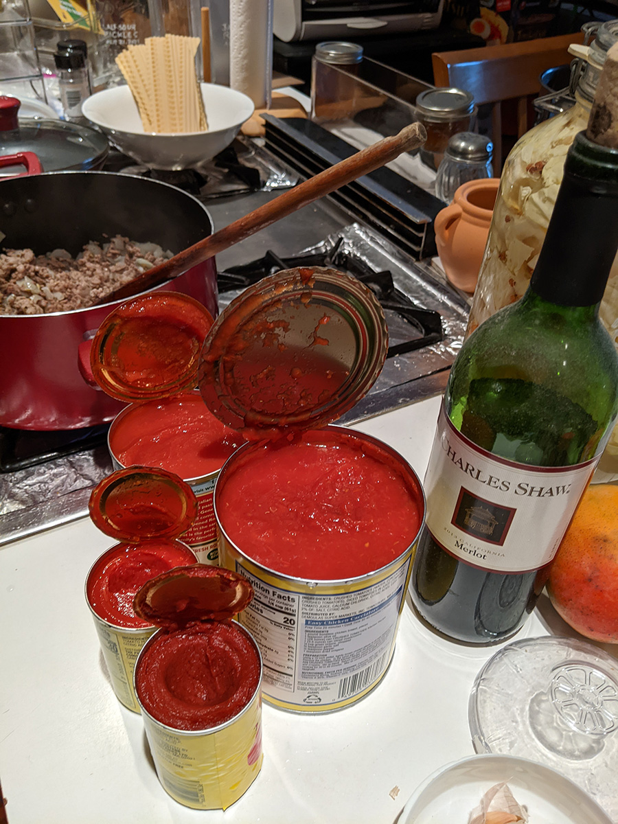 i started making the lasagna at 5:30pm. the sauce itself needed 1-1/2 hours to simmer on the stove, so even with an early start, i still wouldn't be able to eat until late. i tried a recipe i found online that used a combination of ground beef with ground sausage pork. i also added 1/2 cup of red wine for flavor and substituted brown sugar instead of white sugar.