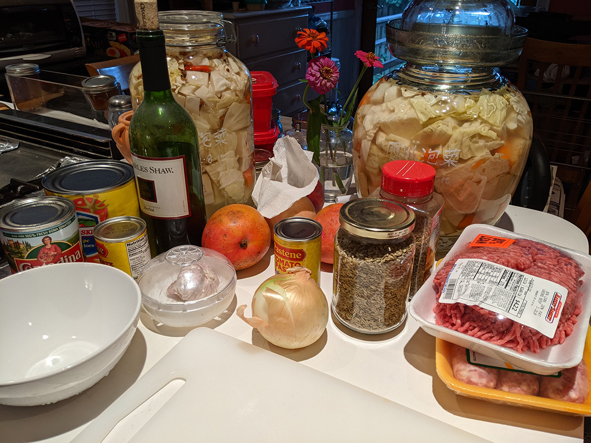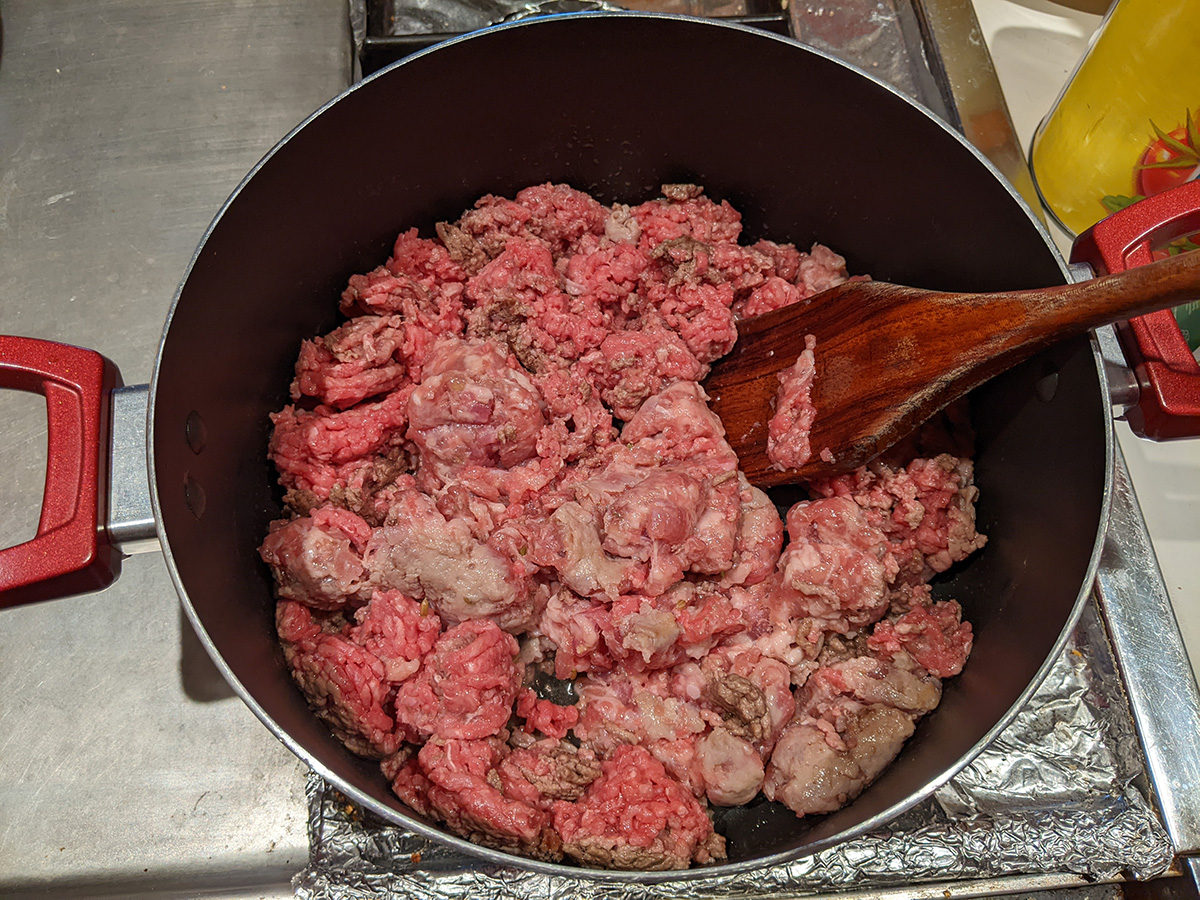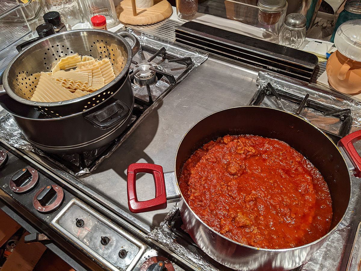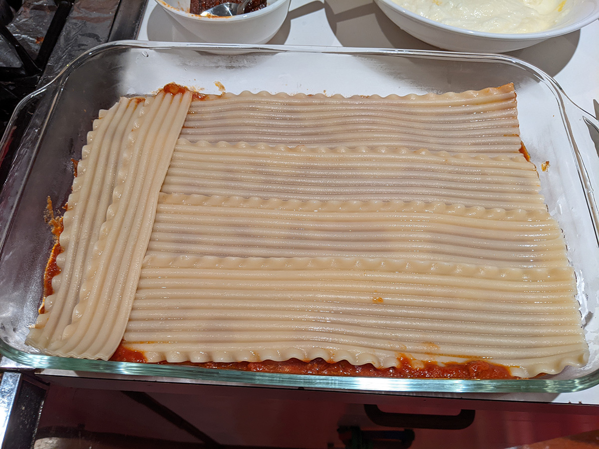 i started making the lasagna at 5:30pm. the sauce itself needed 1-1/2 hours to simmer on the stove, so even with an early start, i still wouldn't be able to eat until late. i tried a recipe i found online that used a combination of ground beef with ground sausage pork. i also added 1/2 cup of red wine for flavor and substituted brown sugar instead of white sugar.
