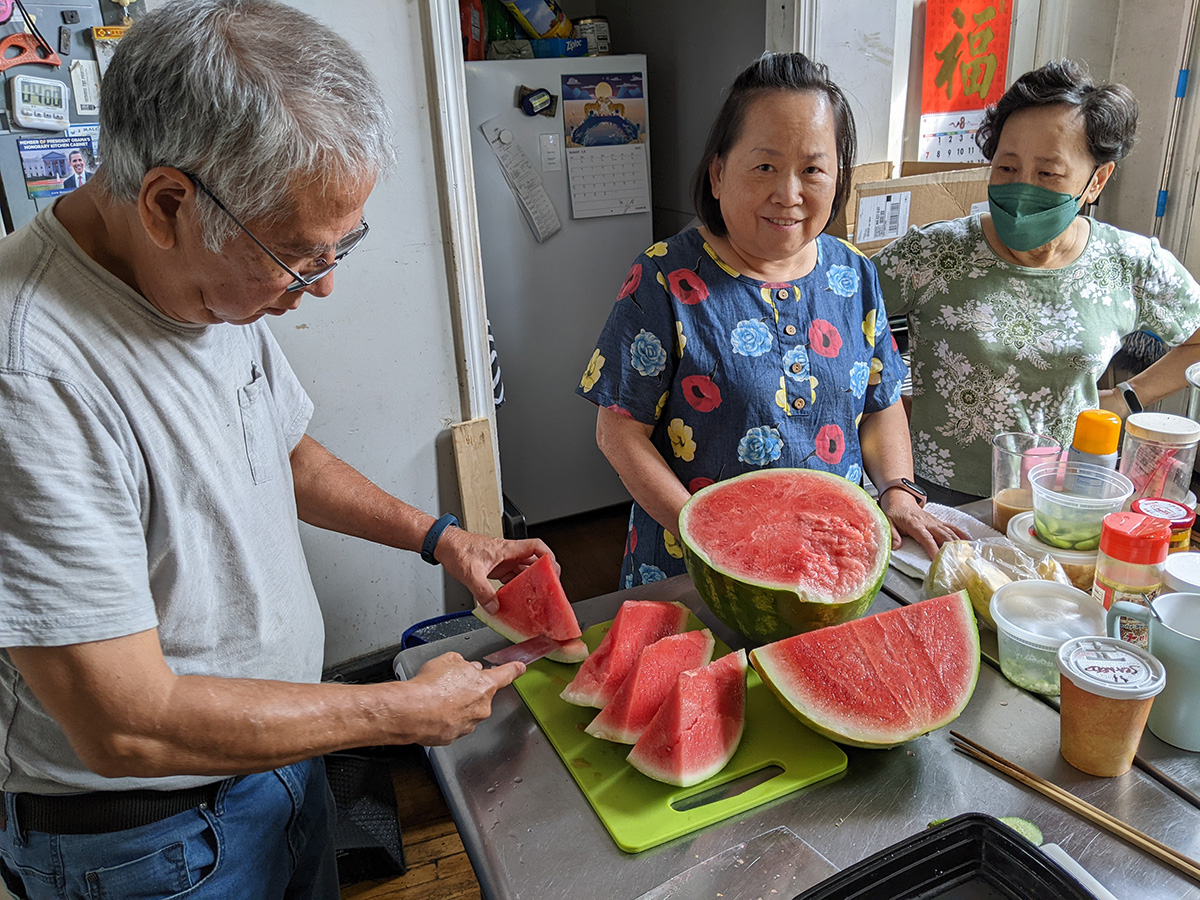 at the cafe my father and i took down the heavy old oven and then replaced it with the breville. the work table looks so empty now without that giant commercial oven. we still need to figure out a way to move the old oven down in the basement, which most likely will require a handtruck of some kind because to move it manually would be back-breaking. my mother tried the sichuan paocai, she said it was very good. everyone had their own opinion. my 2nd aunt said it wasn't sour enough. my sister said it was too sour and too salty. my godmother said it was perfect. my mother asked me to bring one of the jars tomorrow. i left the cafe with some watermelon.