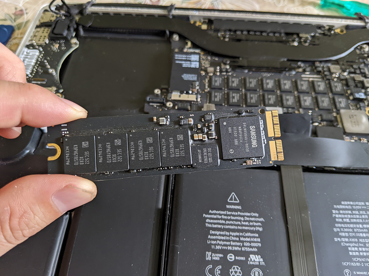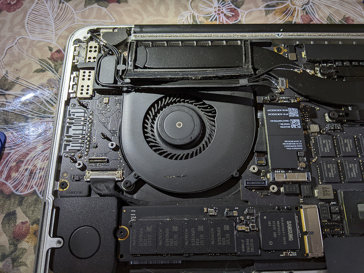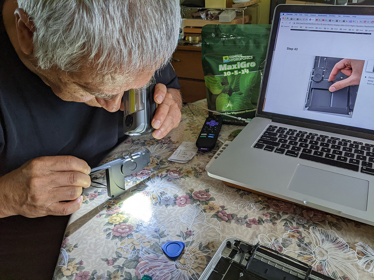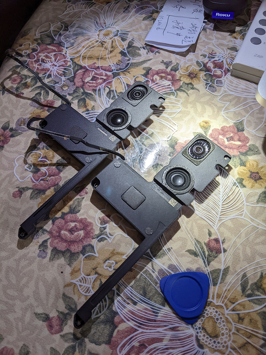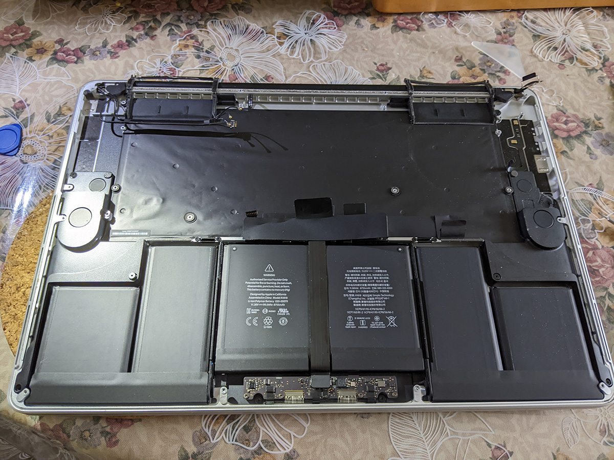 afterwards i had some free time on my hand so i decided to crack open my father's macbook pro and replace his broken right speaker. i followed the directions i found online that was basically 43 steps (and the 43 more steps to put everything back). to get to the speaker, you basically have to remove everything from the computer including the logic board. my father helped me by shining a flashlight (i should've brought my headlamp).