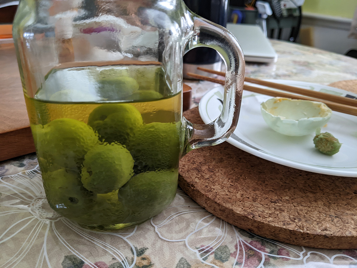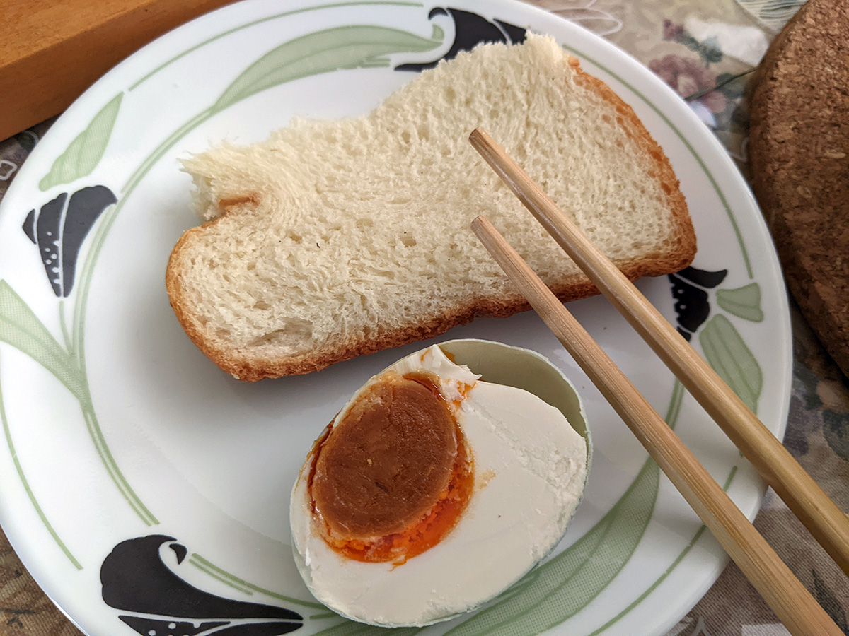 i arrived at my parents' place just in time for lunch: mung bean rice with quinoa, a slice of japanese toast, salted duck egg, and a trader joe brand taiwanese fried scallion pancake. earlier outside i noticed their next door neighbors had returned from their trip to england, and i saw a surveyor outside, measuring one of the two empty residential properties in the neighborhood.