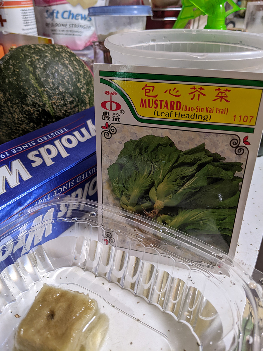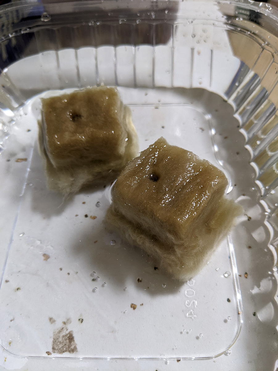 with our outdoor garden basically devastated by the drought, i'm eager to get my hydroponic projects started, just so i can do some constructive gardening. i brought two 1-quart mason jars with 3" net cups. i also brought 2 rockwool cubes (1.5") and some leca balls. after soaking the rockwool, i dropped two chinese mustard seeds into each cube. the seeds were the ones i got from chinatown; i looked at the packaging, surprised they came from taiwan. sealed inside of a small ziploc bag, i'm guessing there's about 500 tiny mustard seeds. i left the wet rockwool by the window to help the seeds germinate.