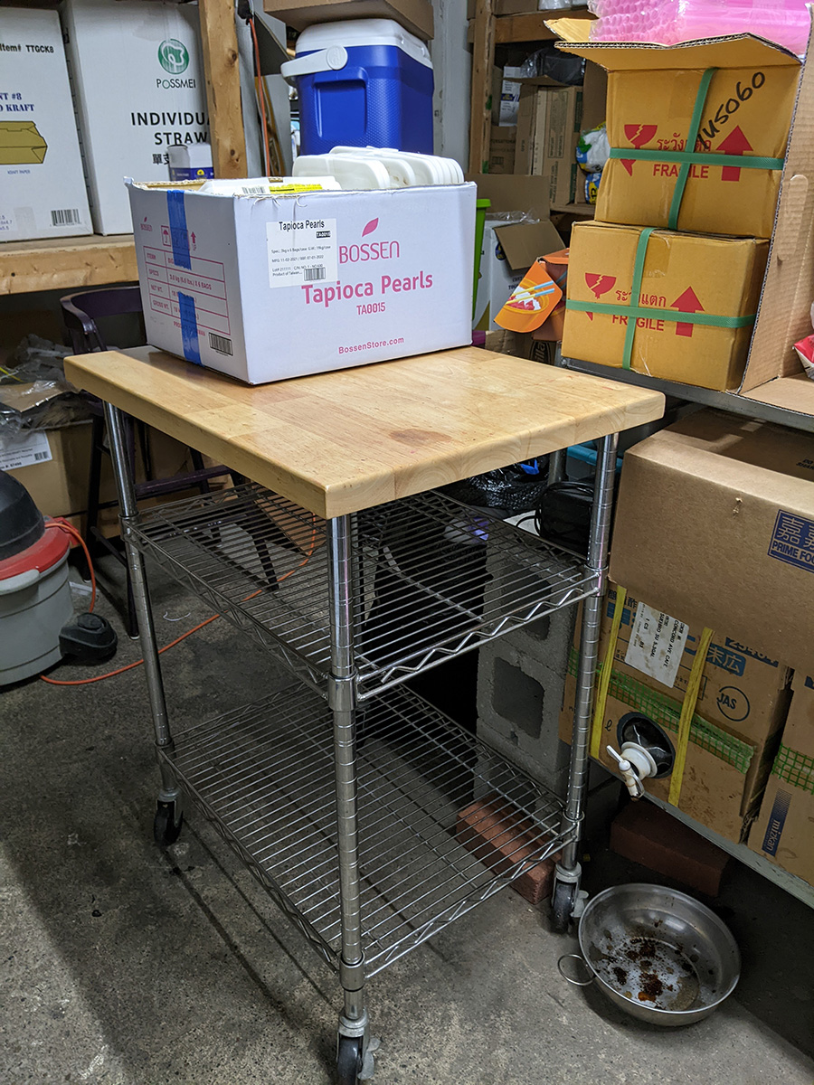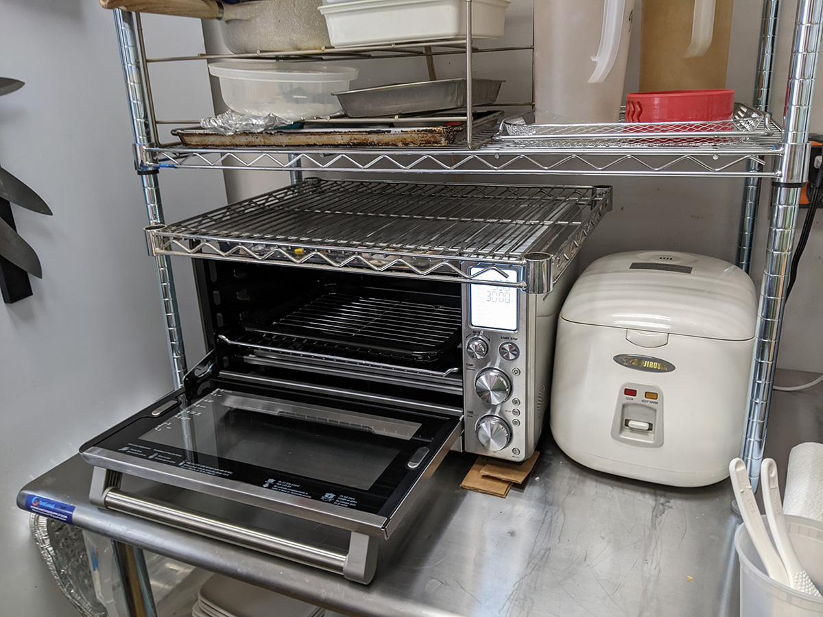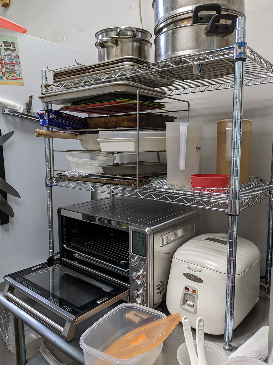 we went to the cafe to drop off the supplies. i also got a chance to see if the kitchen cart could work as shelving unit for the work table. it measured 24x18", which going my numbers alone meant the breville oven should be able to fit underneath no problem. but those numbers are accounting for the legs of the shelf, so the final tolerance is really tight, where the sides of the oven are pressed up against the chrome legs. it wasn't a good fit, and the current DIY shelving unit my father rigged up with the 3ft long adjustable chrome shelves is much better, even though it only has 2 shelves.