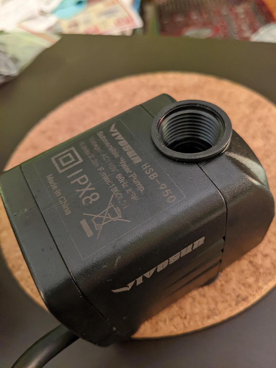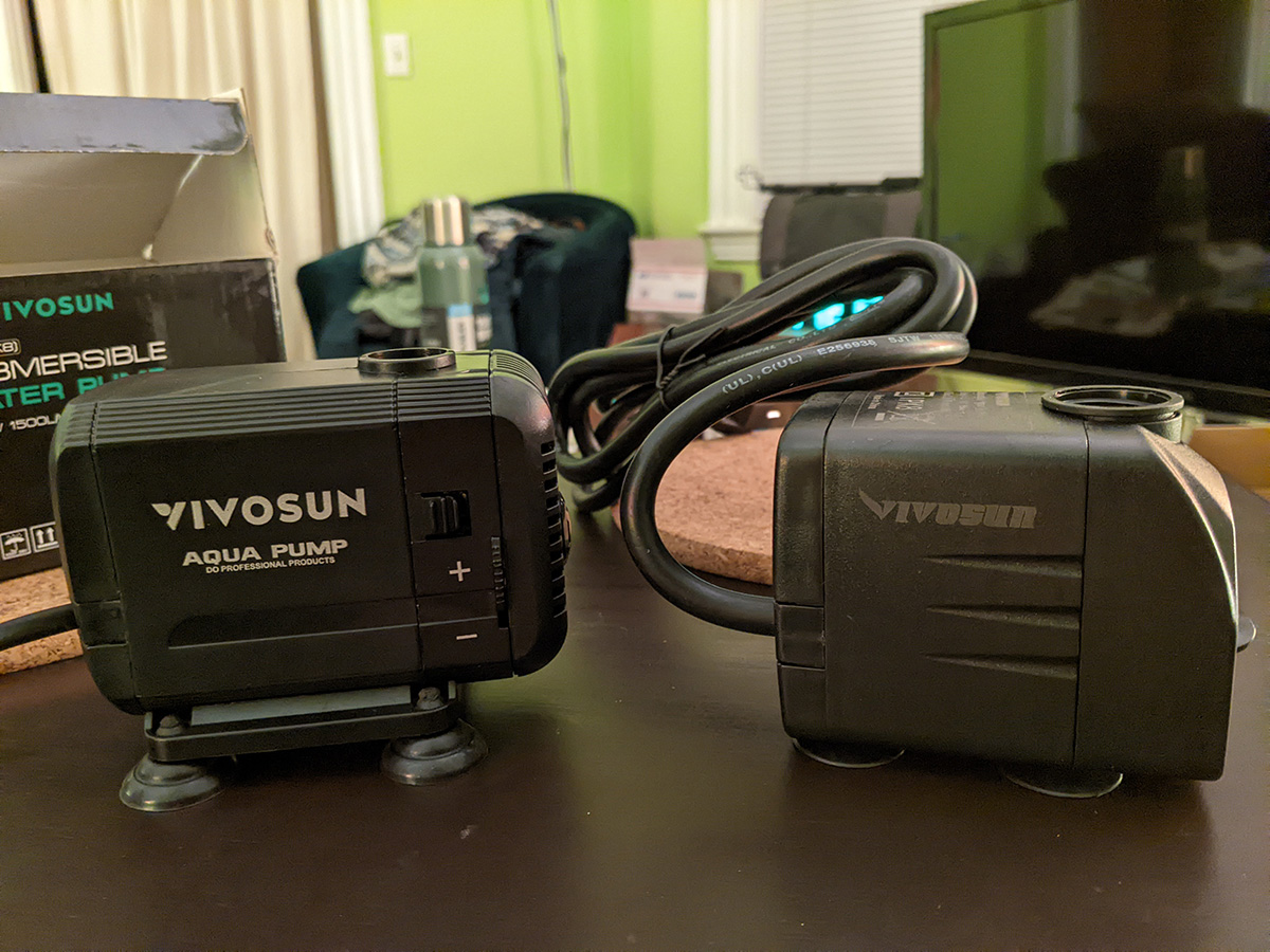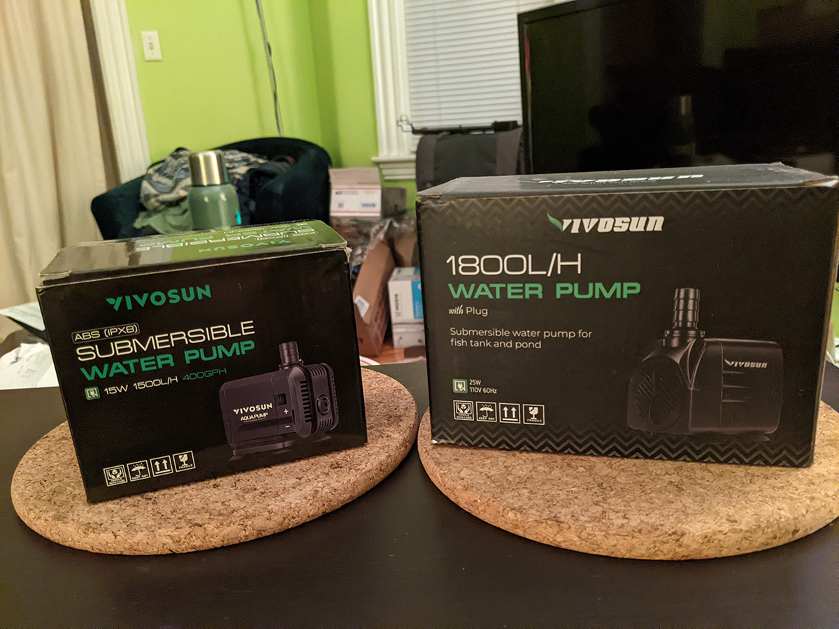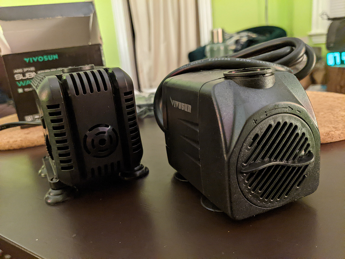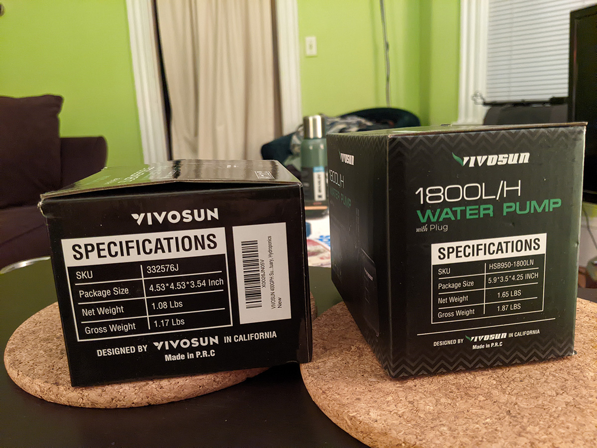 my 400GPH vivosun submersible water pump ($16) arrived today. why did i get another pump when i already have a vivosun 480GPH pump? because the 480GPH pump is too powerful, and uses 25W, when the 400GPH only uses 15W. if i need to run it 24/7, i rather have a smaller pump with enough power than an over-sized pump that wastes electricity. not sure what made me get the 480GPH, when everything i read about a low-pressure aeroponics setup uses a 400GPH pump.