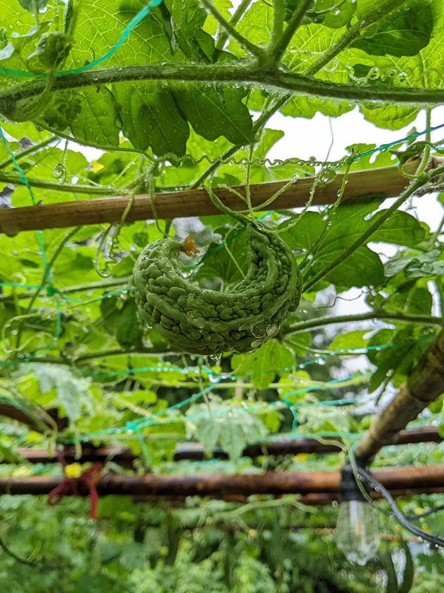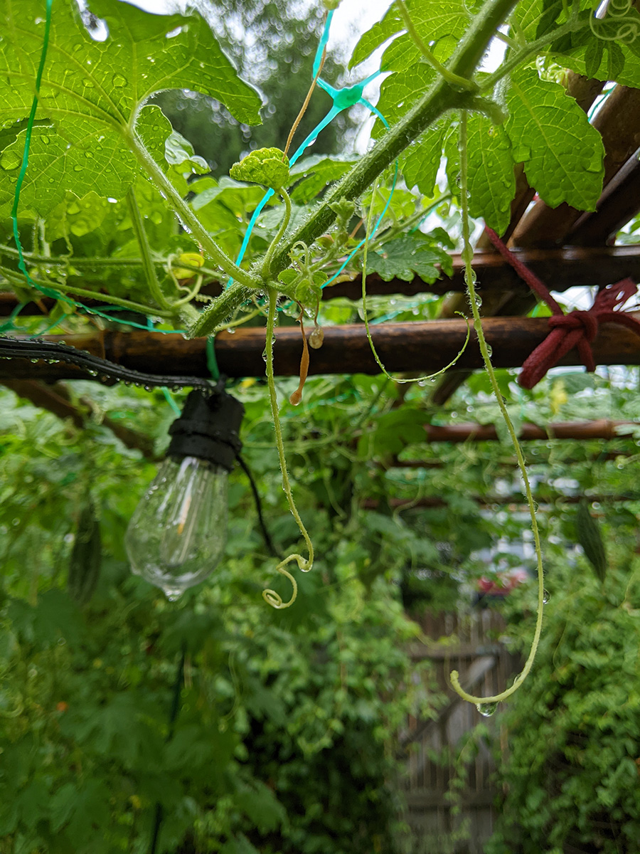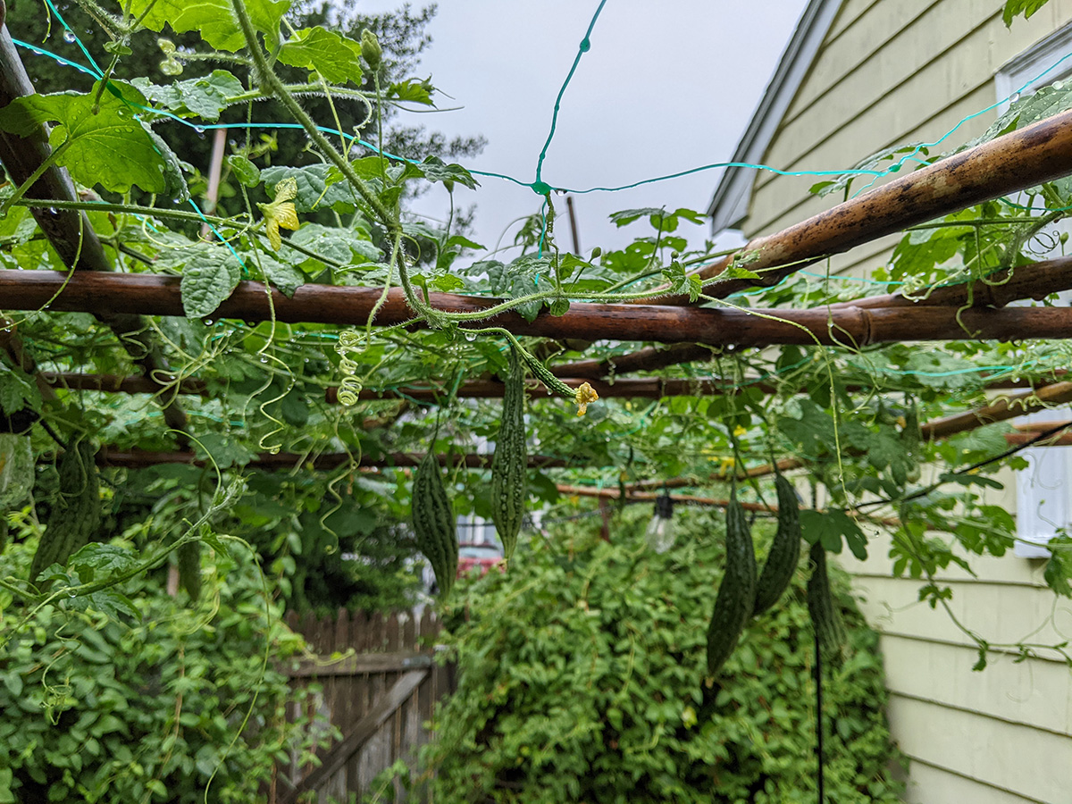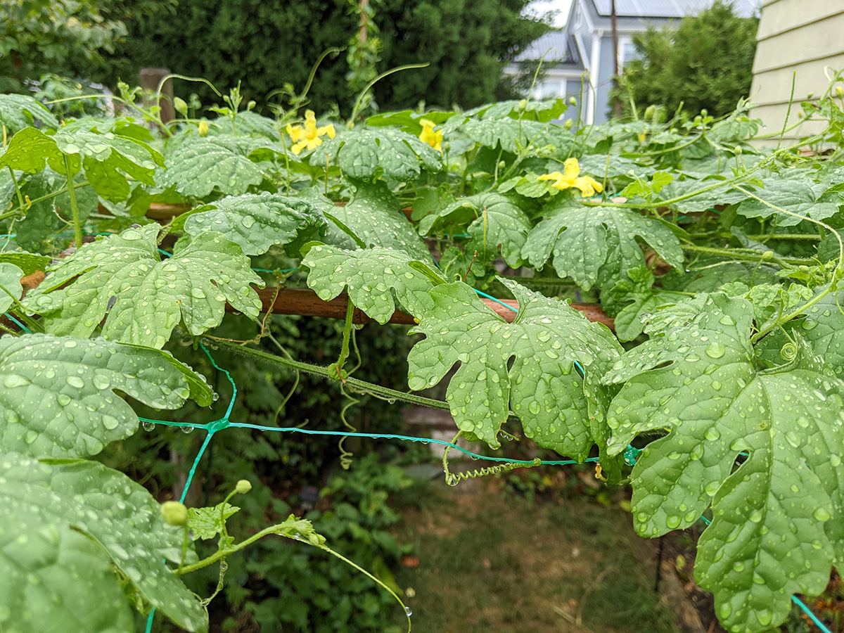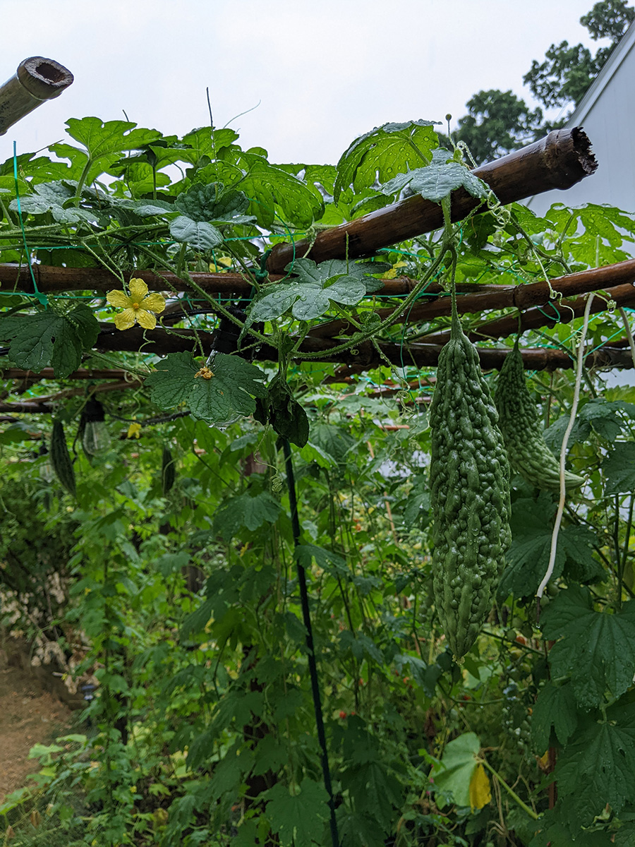 the rain brings hope that our backyard garden - approaching the end of the summer - can be renewed somehow. the bitter melon trellis looked very sad just a few days ago now looked like it was coming back to life, with plenty of yellow male flowers and a few new tiny bitter melons.