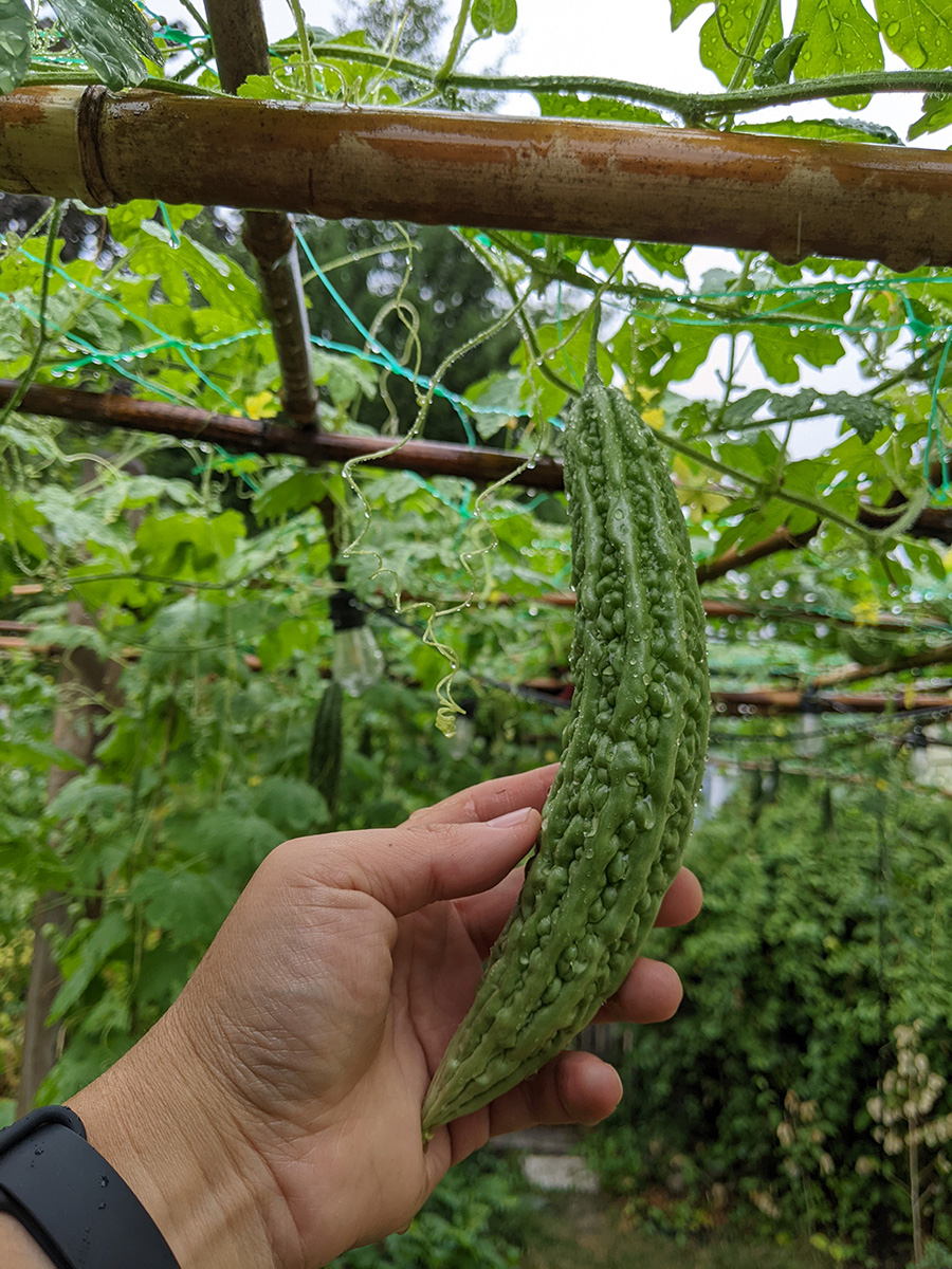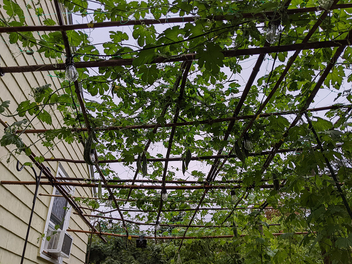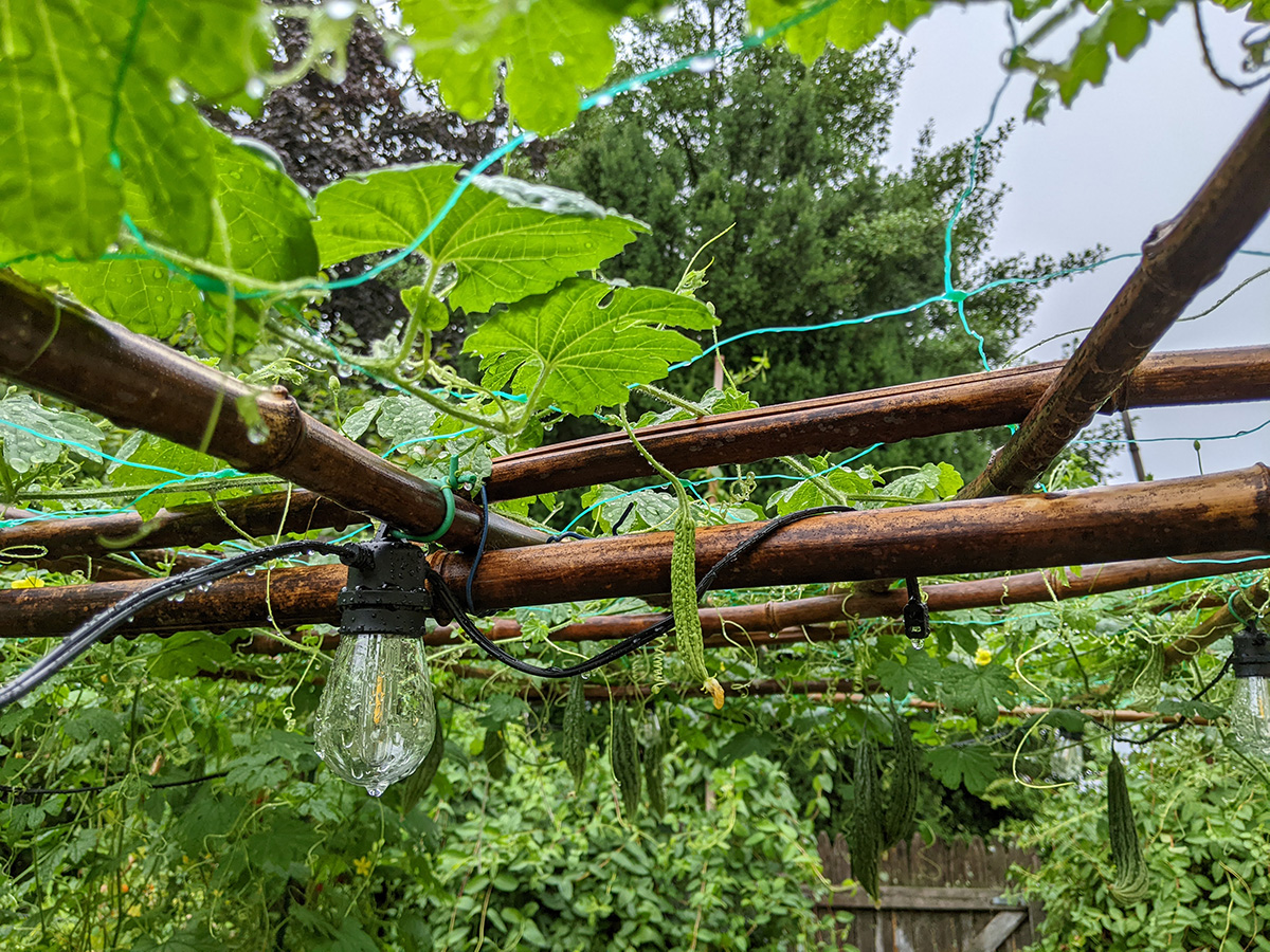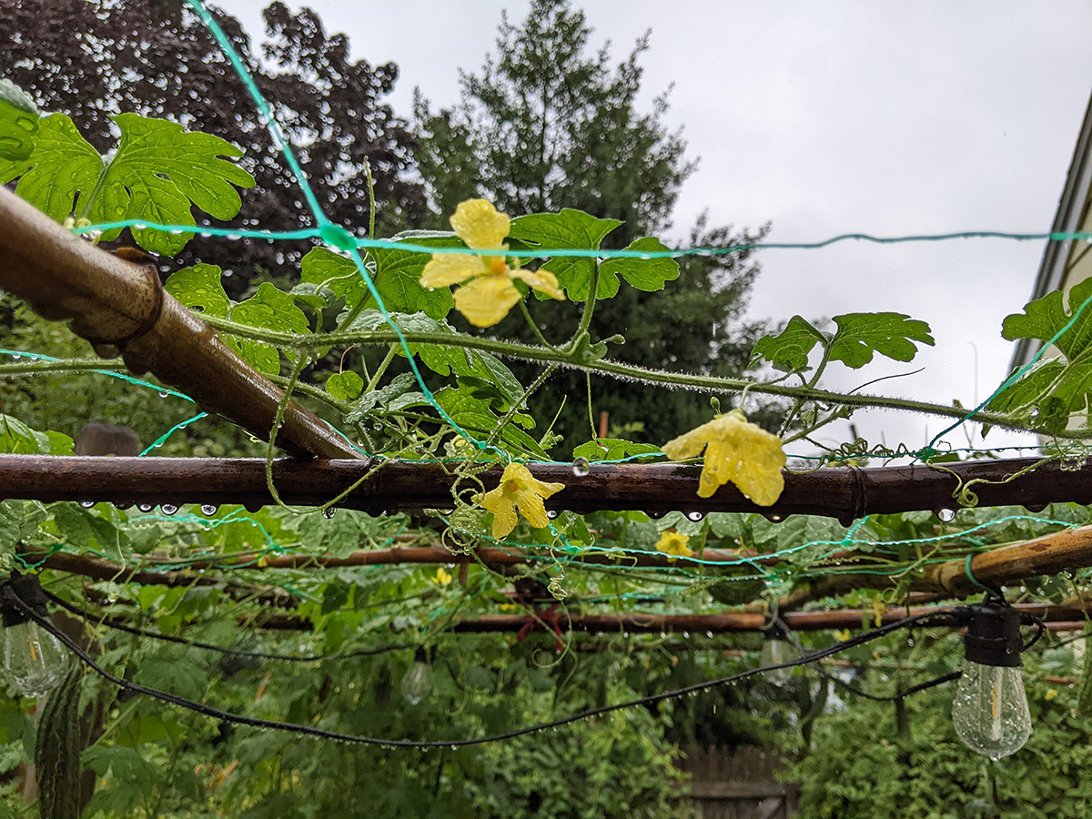 the rain brings hope that our backyard garden - approaching the end of the summer - can be renewed somehow. the bitter melon trellis looked very sad just a few days ago now looked like it was coming back to life, with plenty of yellow male flowers and a few new tiny bitter melons.