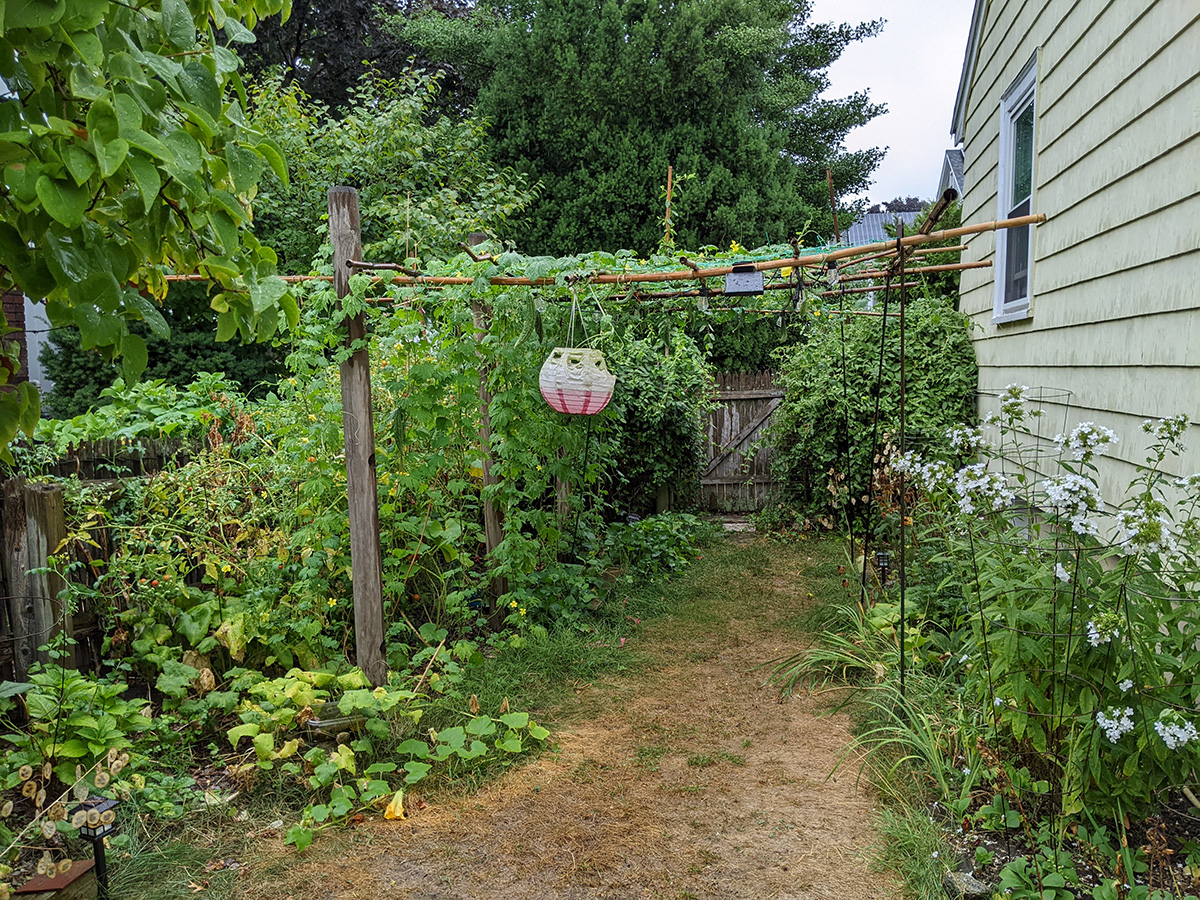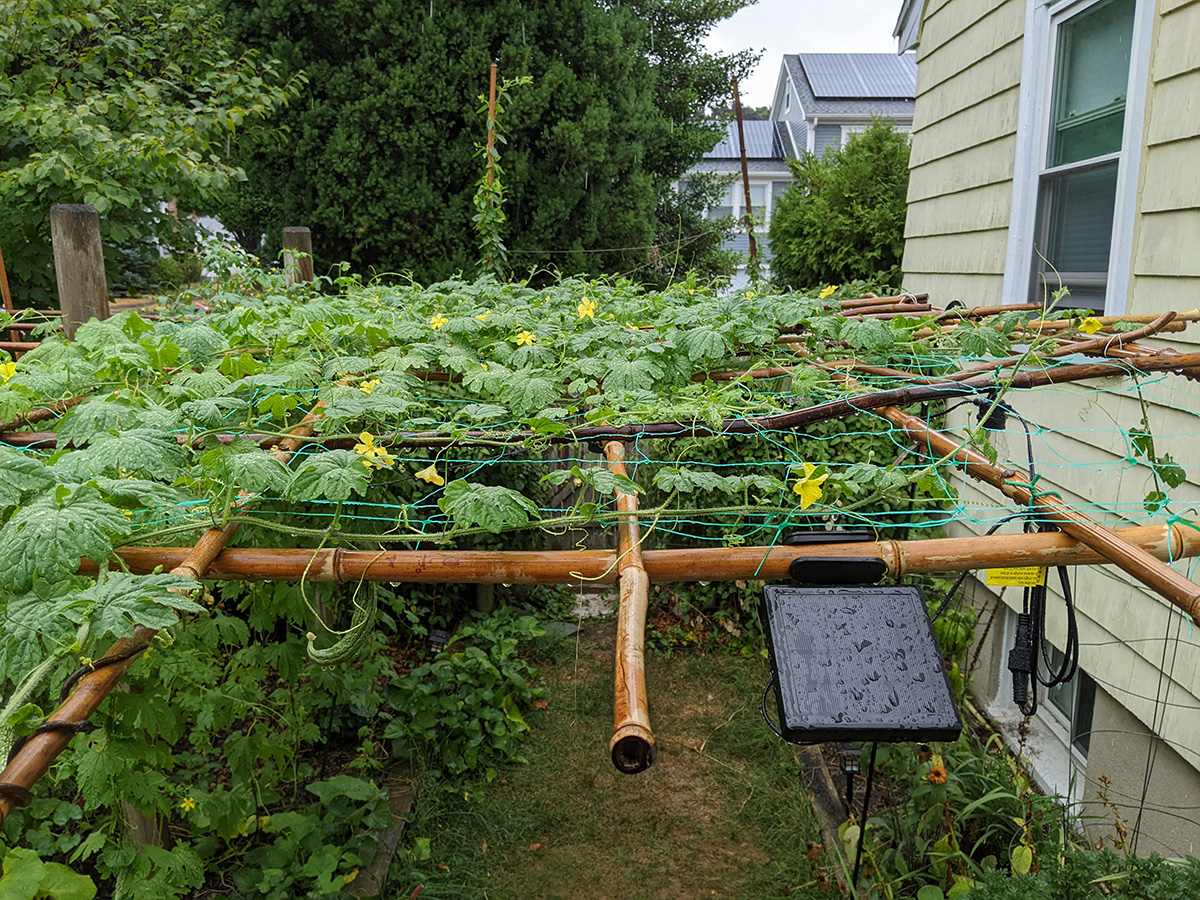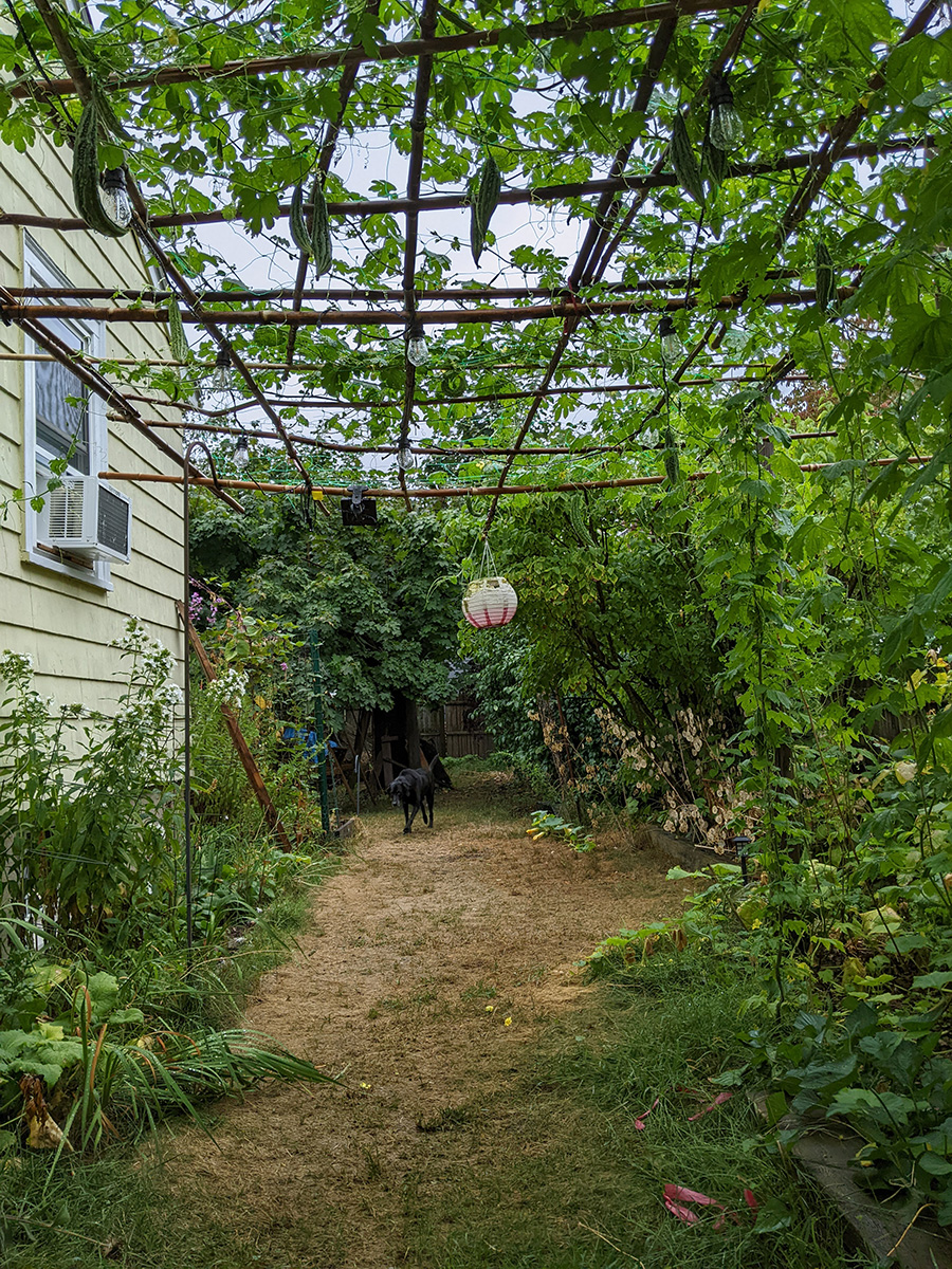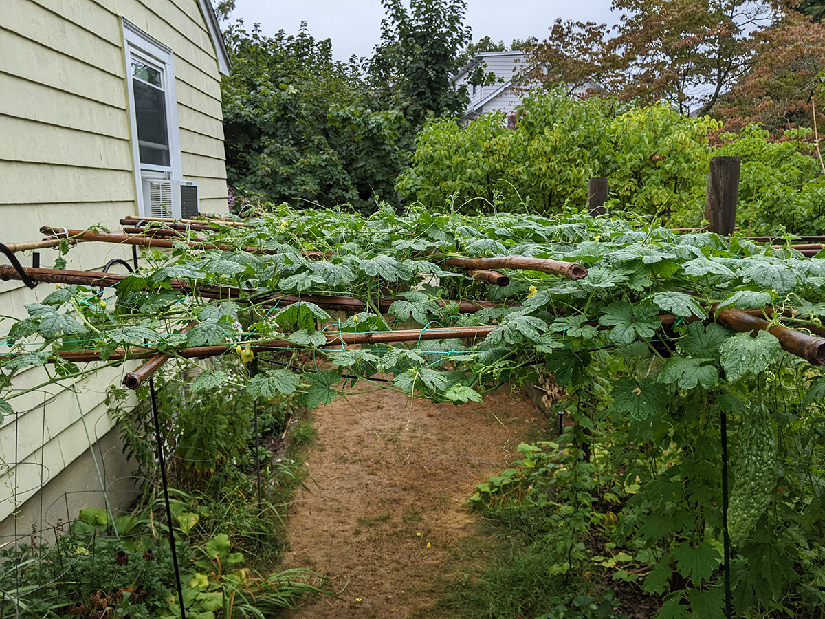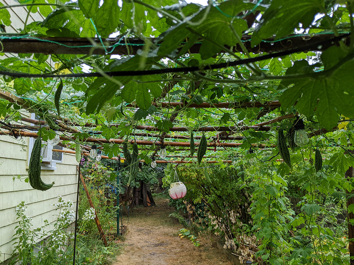 the rain brings hope that our backyard garden - approaching the end of the summer - can be renewed somehow. the bitter melon trellis looked very sad just a few days ago now looked like it was coming back to life, with plenty of yellow male flowers and a few new tiny bitter melons.