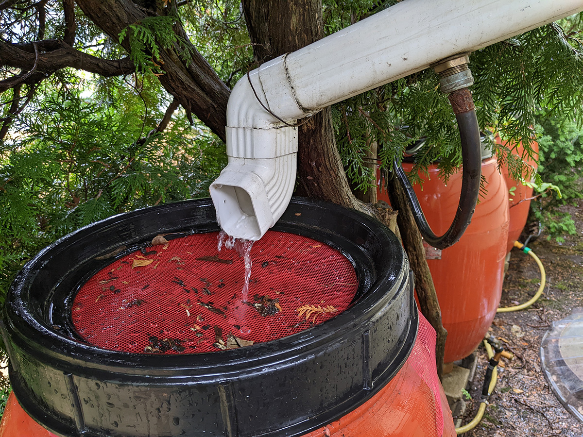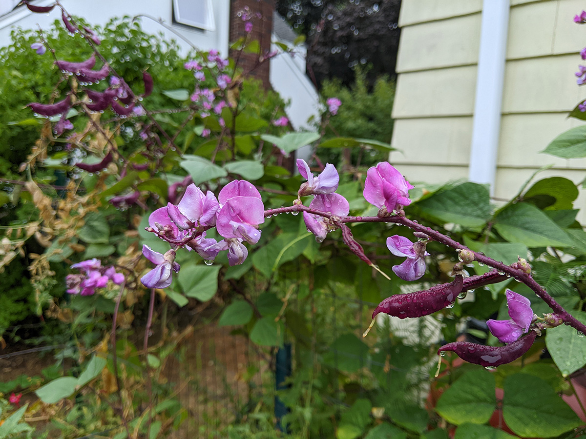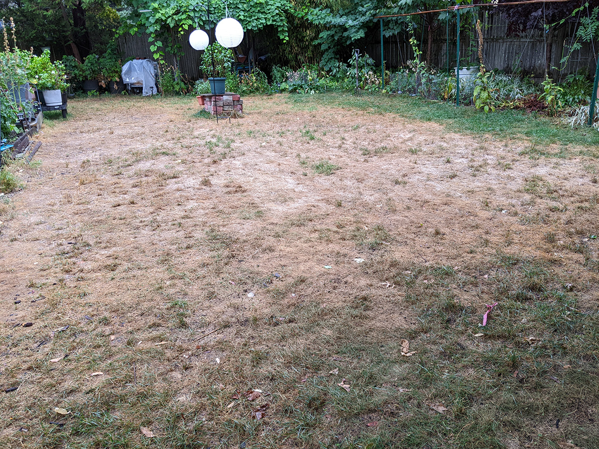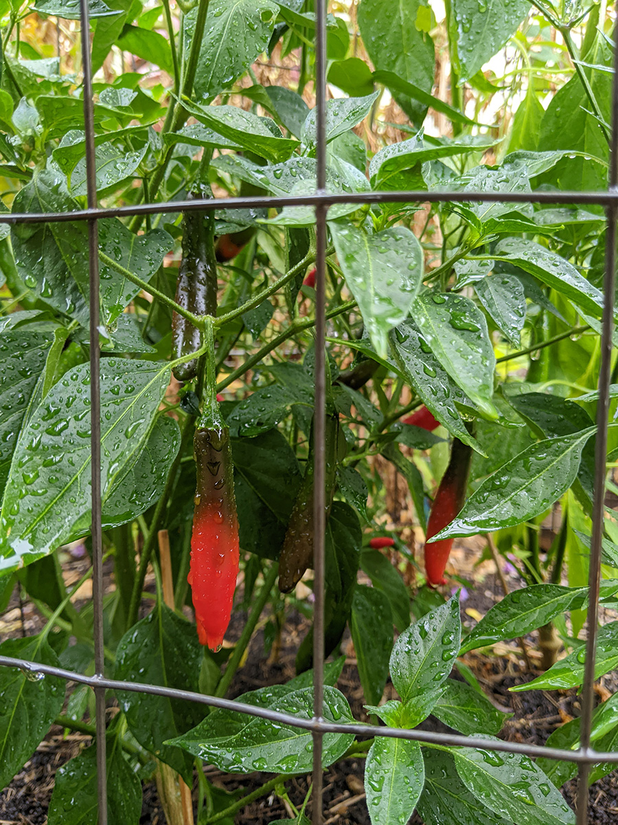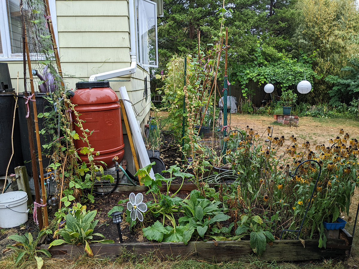 i went outside to inspect the filling rain barrels. this type of rain is the best - the slow and steady kind - for catching the water off the roof. by the end of the day, the barrels were 6" away from maximum capacity. slow and steady rain is also good for watering the plants and lawn, as the water can slowly soak into the ground instead of just running off. nevertheless, even though the garden soil looked soaked, digging into the dirt less than half a centimeter revealed still-dry soil underneath. it's going to take more than a day of rain to make up for months accumulation of drought.