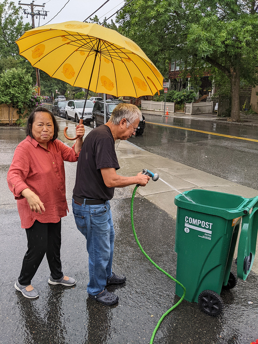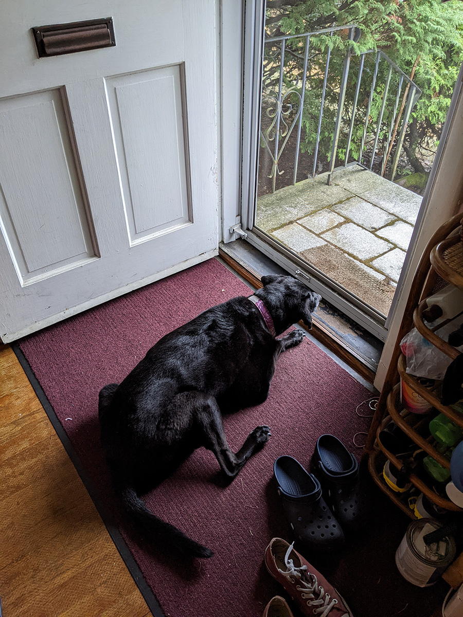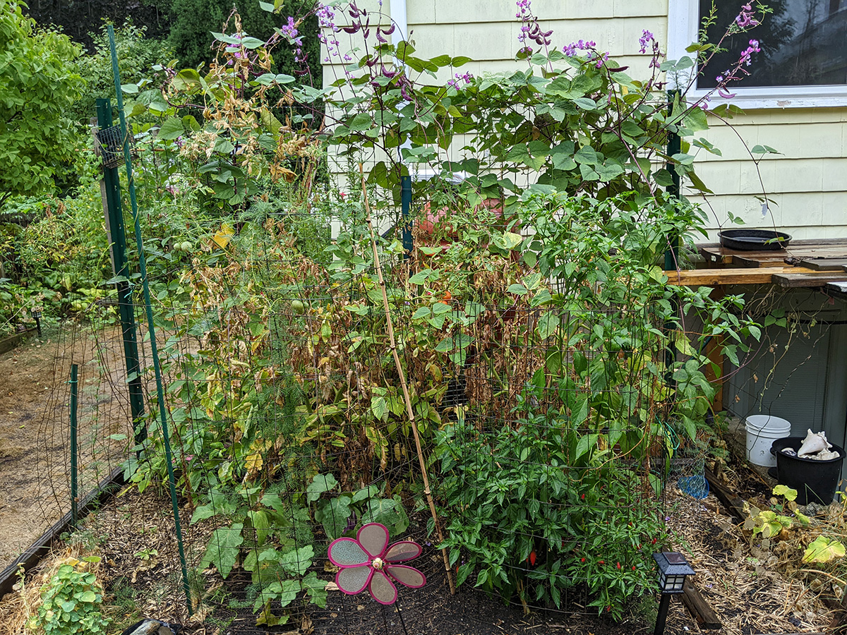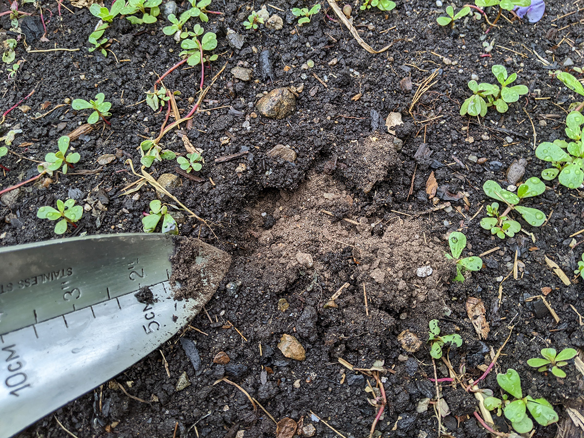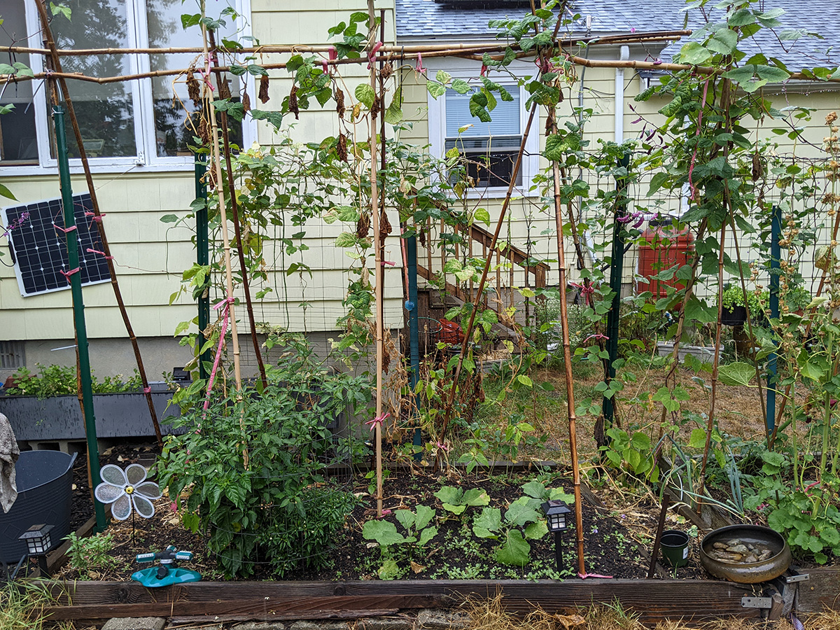 i went outside to inspect the filling rain barrels. this type of rain is the best - the slow and steady kind - for catching the water off the roof. by the end of the day, the barrels were 6" away from maximum capacity. slow and steady rain is also good for watering the plants and lawn, as the water can slowly soak into the ground instead of just running off. nevertheless, even though the garden soil looked soaked, digging into the dirt less than half a centimeter revealed still-dry soil underneath. it's going to take more than a day of rain to make up for months accumulation of drought.