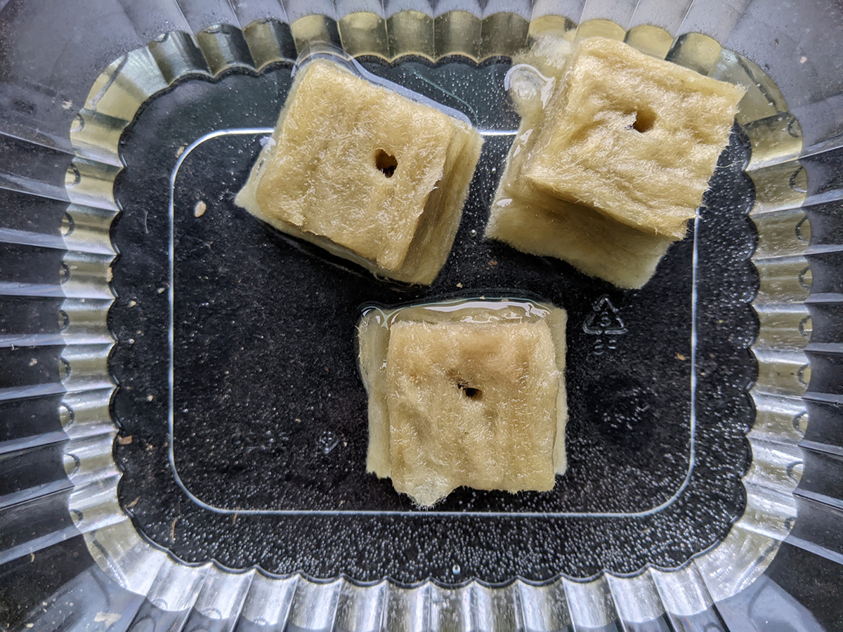 i bought another container for a third hydroponic kratky pot. along with it another rockwool cube, soaked before i dropped a few mustard seeds into the hole. i looked at the two rockwool cubes i prepared yesterday, i think i saw at least one of the mustard seeds had already started to germinate. the faster they grow and begin to form roots, the sooner i can put them in the nutrient bath.