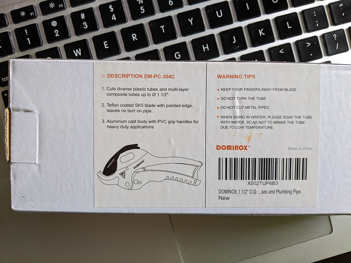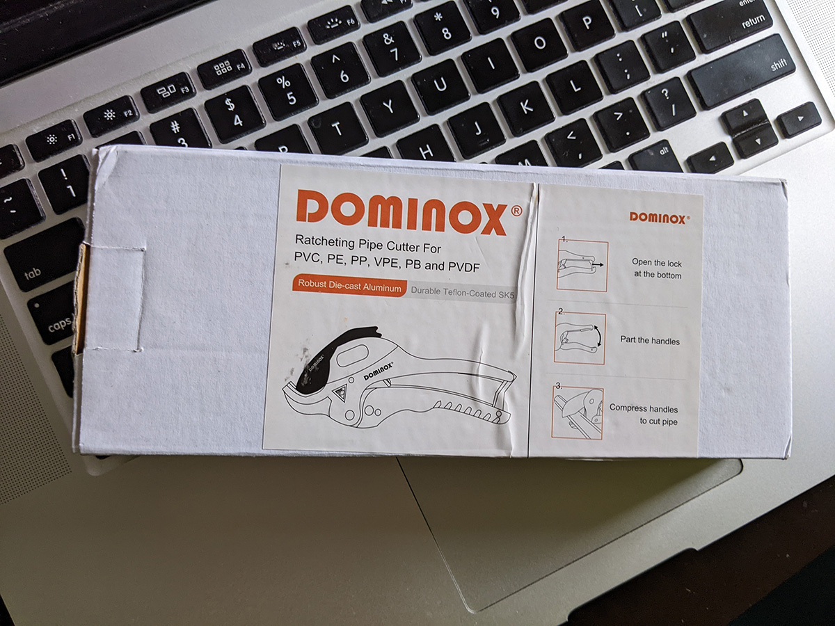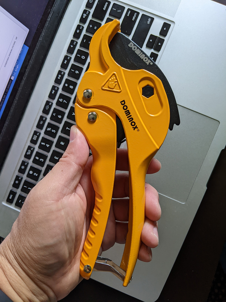 also on my doorstep when i came back from my run was my rachet PVC pipe cutter ($8). it was the cheapest one i could find online, and can only cut to a maximum outer diameter size of 1-1/2" which is more than enough (i'll be working with 1/2" PVC pipes to make my aeroponics spray manifold).