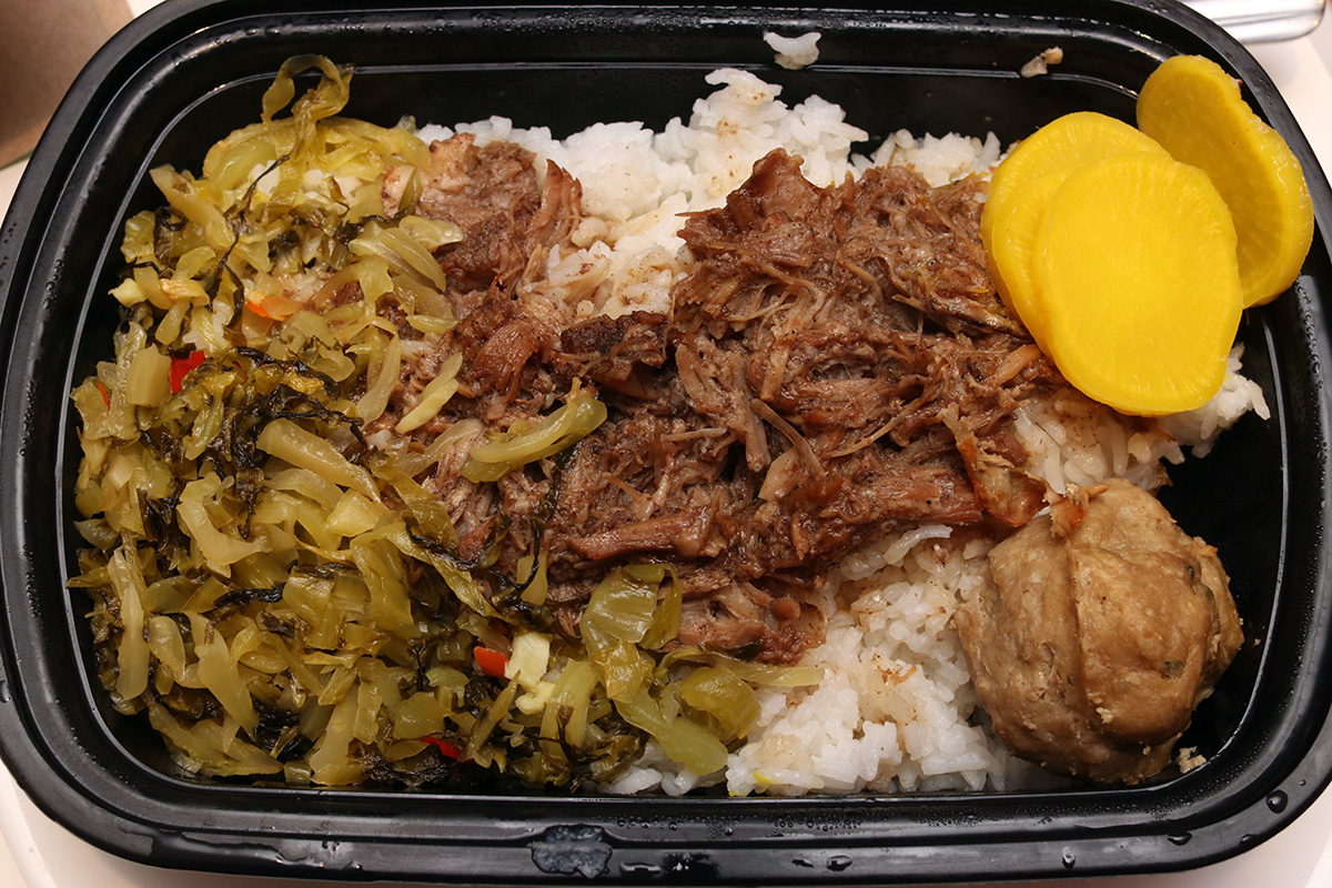 for dinner i heated the prepared meal in the microwave. it was rice from the new rice cooker (which my mother doesn't like, said it takes too long to cook, and the rice comes out soggy), combined with some pulled pork my sister had made, plus a meatball. there was also some sour mustard green and a few slices of pickled daikon radish.