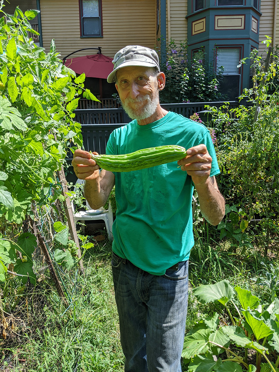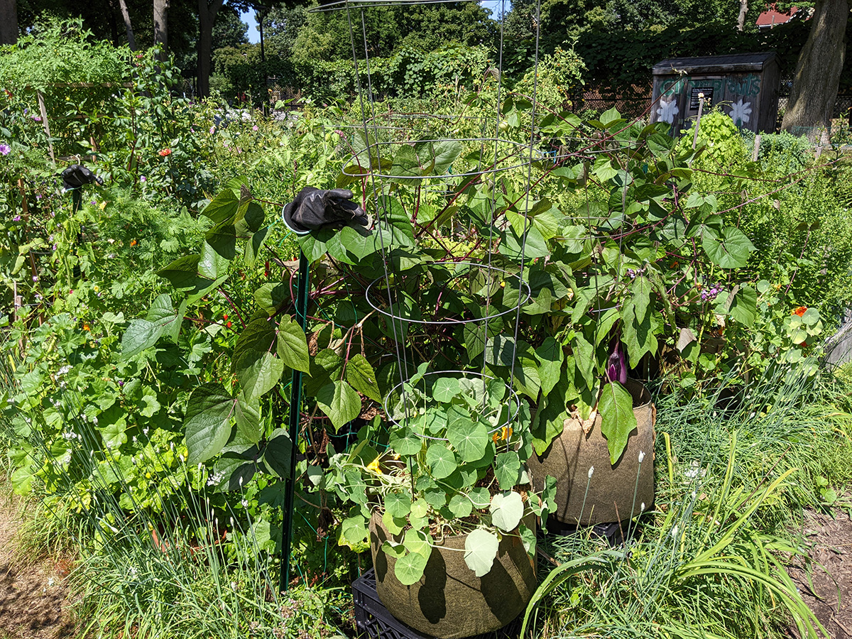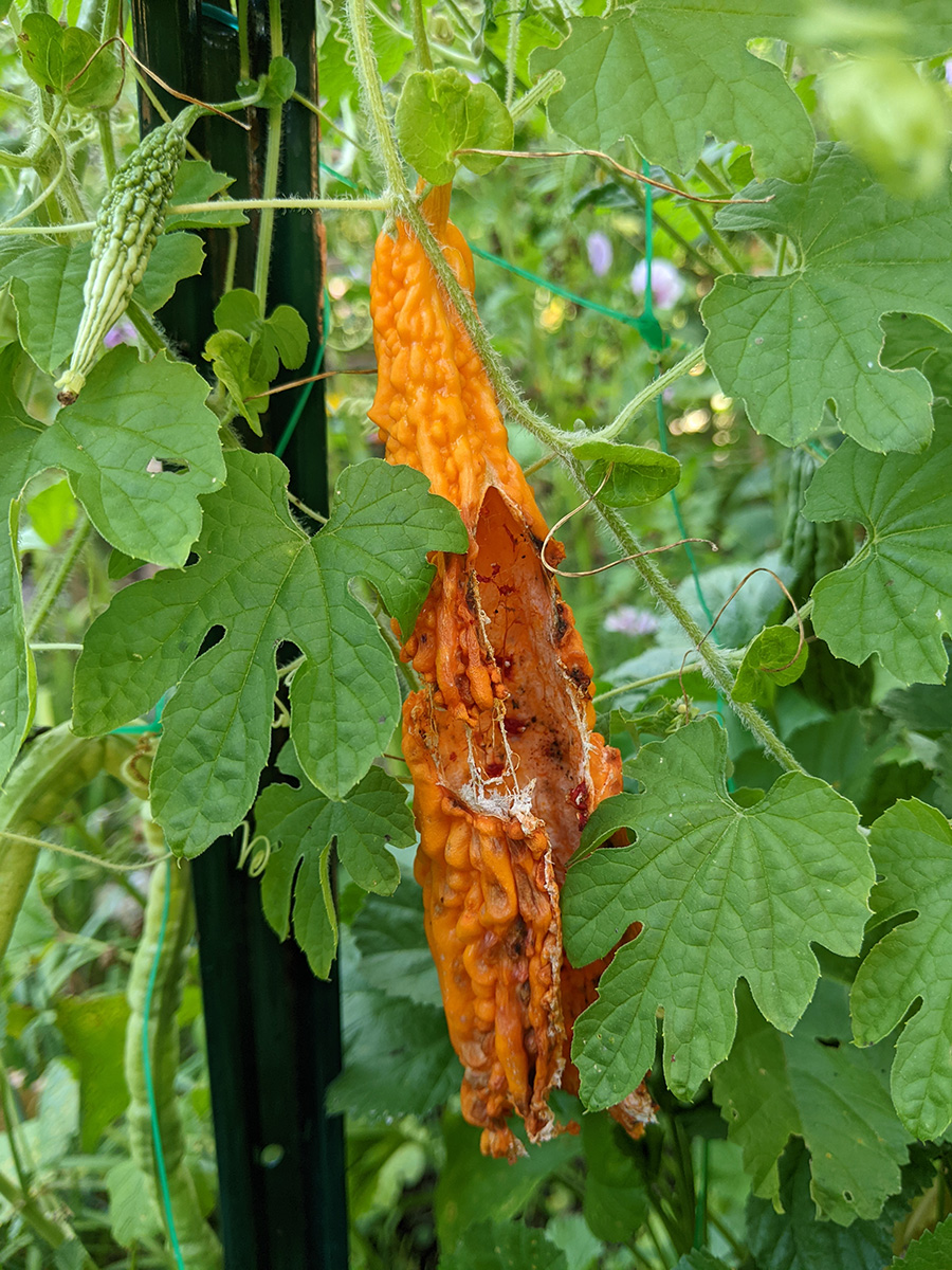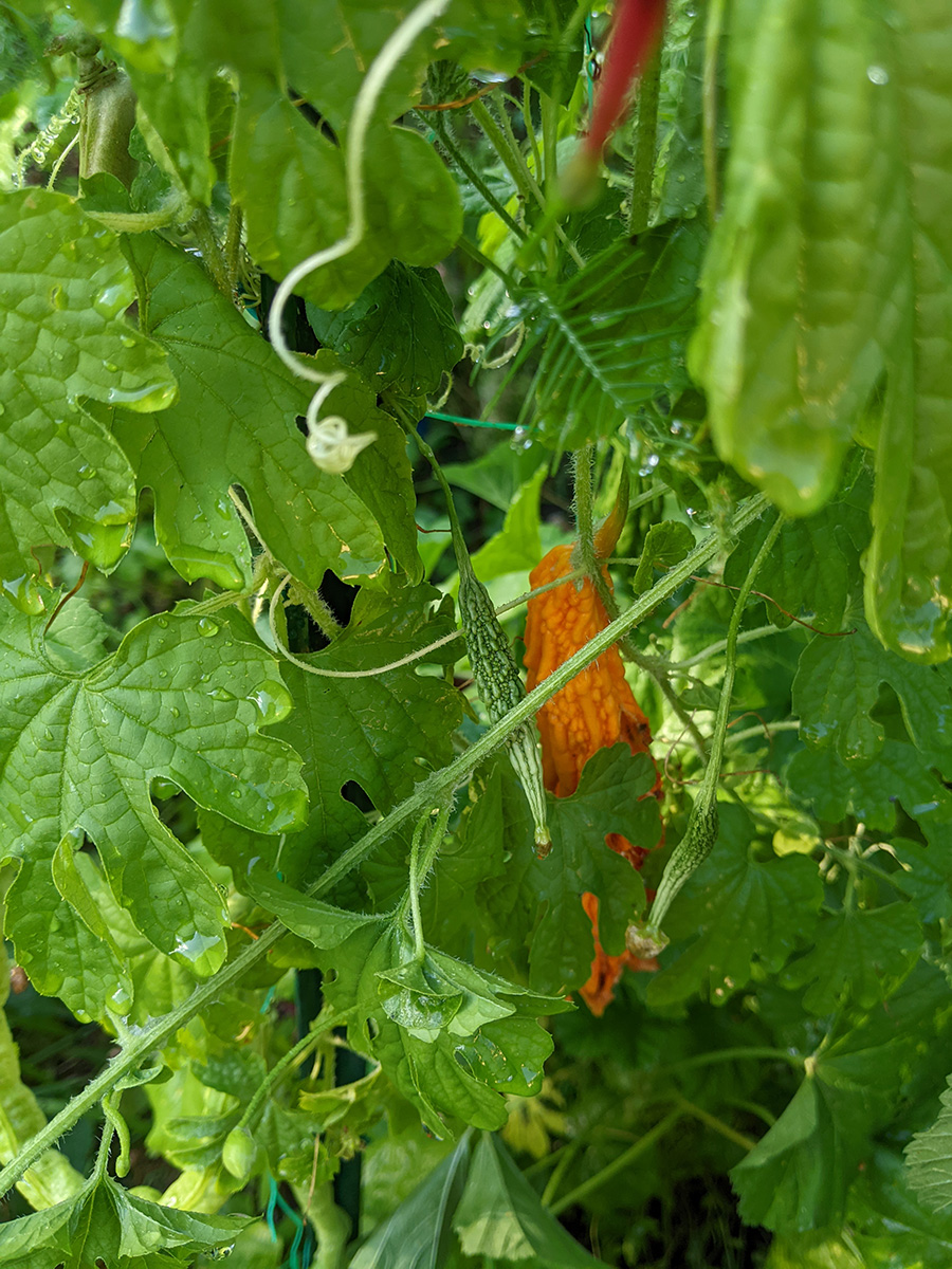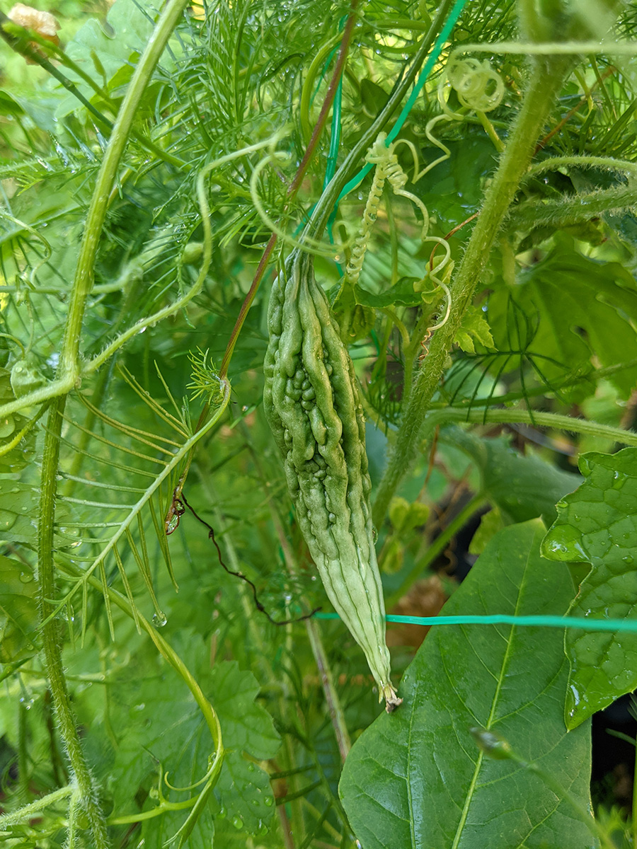i stopped by the community garden to do some watering. i hadn't been there in over a week, i was due for a visit. i set the cast-iron pan on a fence post and unfurled the hose. that's when i heard somebody talking to me: i didn't even notice dave was in his garden! he wasn't doing any watering (he already did that this morning), just came back to harvest his vegetables. i thanked me for the bitter melon plant i gave him, already harvested a few melons. he was showing me how much the plant had grown where i spotted a very large bitter melon hiding in the trellis. i myself had many ripe vegetables in my garden plot, but because i didn't bring a bag, i couldn't take any of them home. after i finished watering i grabbed my pan and got ready to leave. because it'd been sitting out in the sun for 20 minutes, it'd gotten so hot that i had hot-potato the pan back home, until it got cool enough to carry.