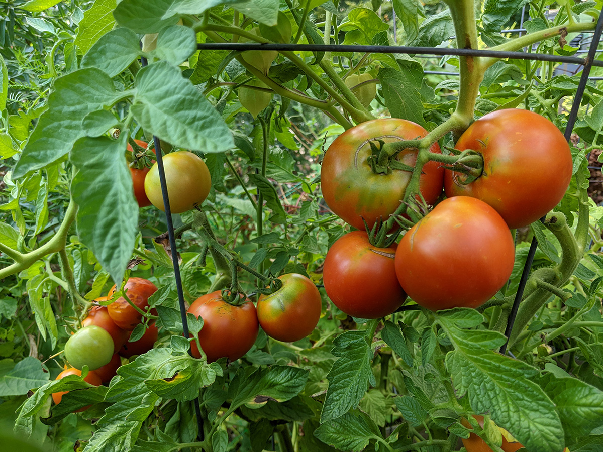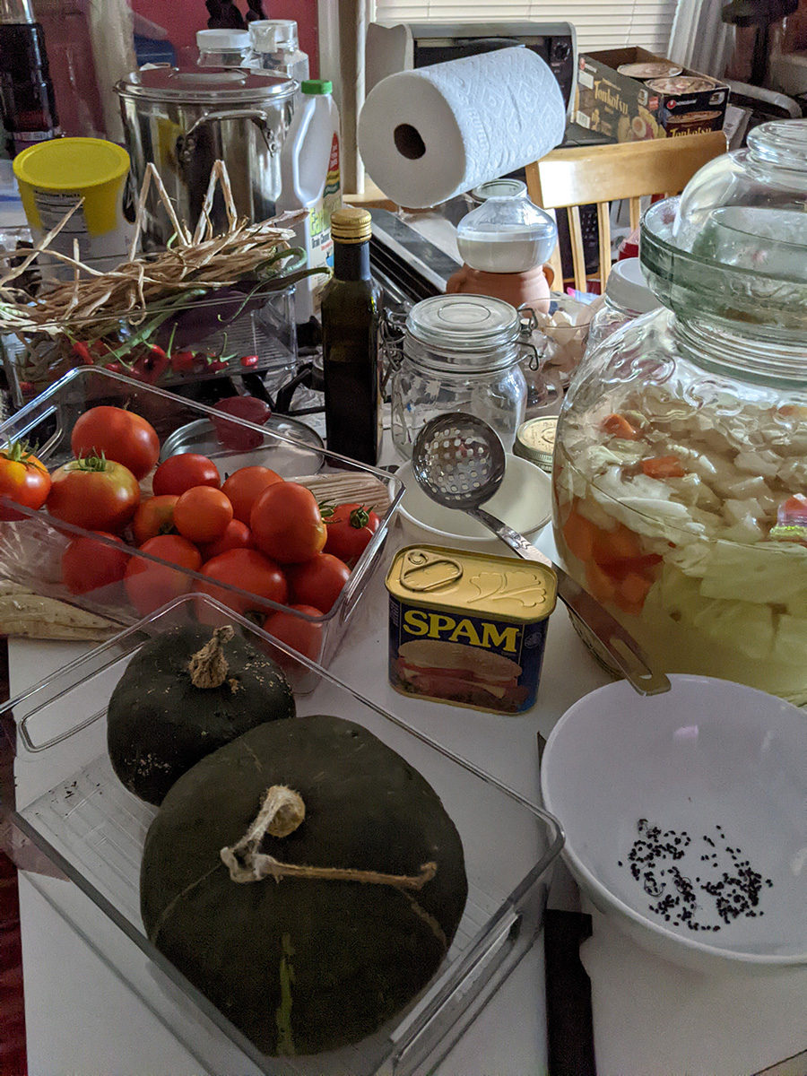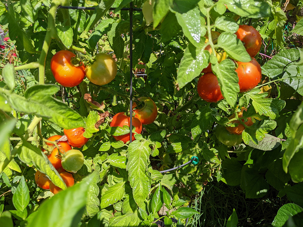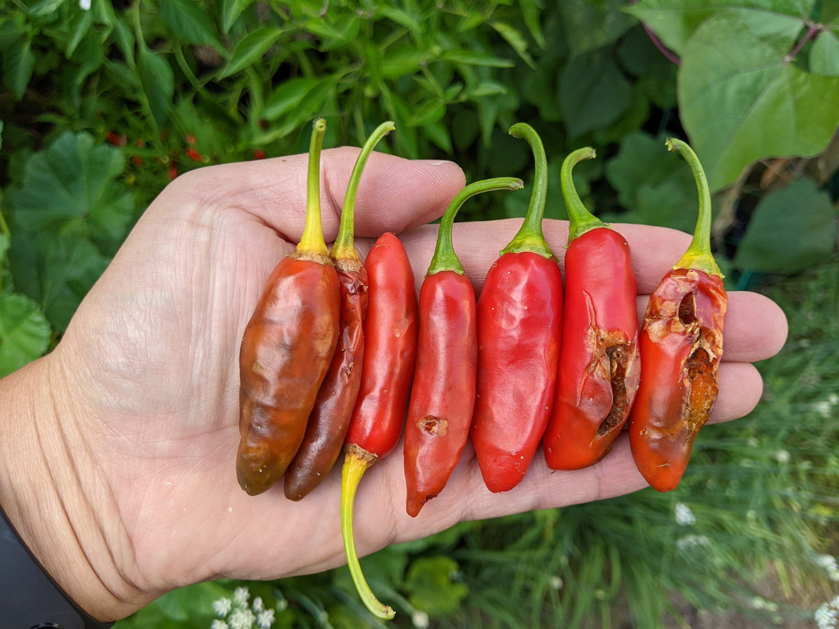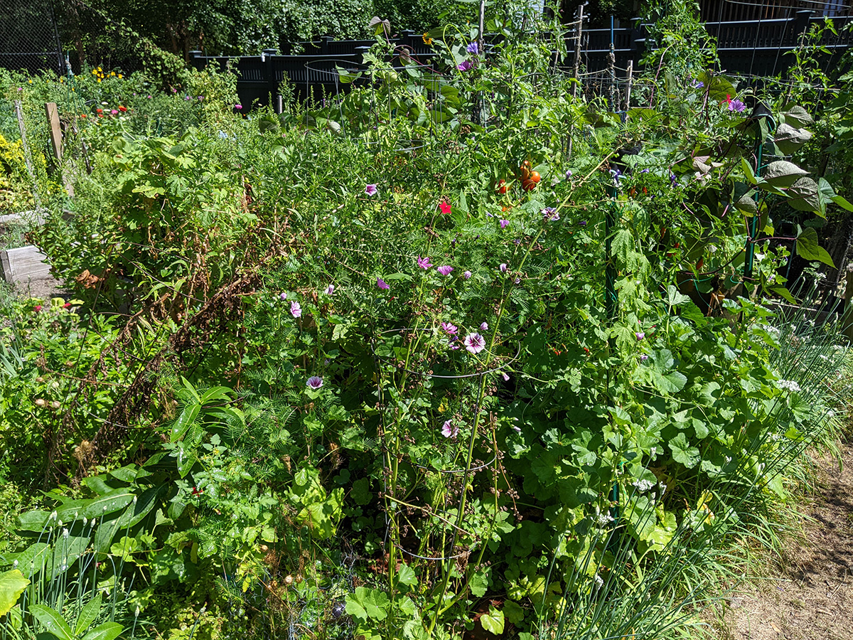 i stopped by the community garden to do some watering. i hadn't been there in over a week, i was due for a visit. i set the cast-iron pan on a fence post and unfurled the hose. that's when i heard somebody talking to me: i didn't even notice dave was in his garden! he wasn't doing any watering (he already did that this morning), just came back to harvest his vegetables. i thanked me for the bitter melon plant i gave him, already harvested a few melons. he was showing me how much the plant had grown where i spotted a very large bitter melon hiding in the trellis. i myself had many ripe vegetables in my garden plot, but because i didn't bring a bag, i couldn't take any of them home. after i finished watering i grabbed my pan and got ready to leave. because it'd been sitting out in the sun for 20 minutes, it'd gotten so hot that i had hot-potato the pan back home, until it got cool enough to carry.