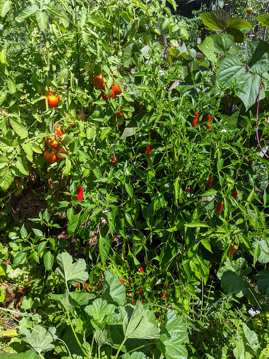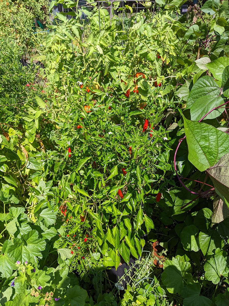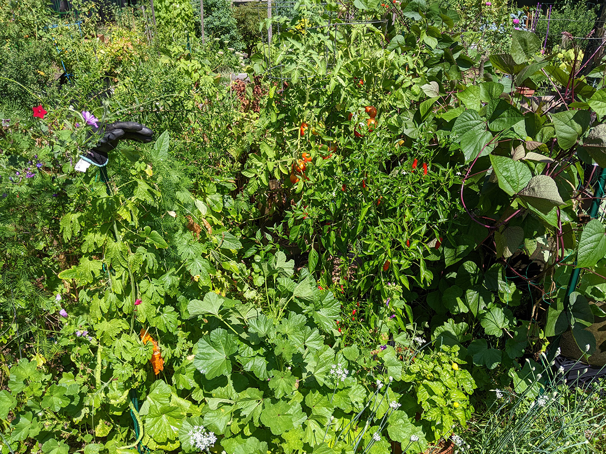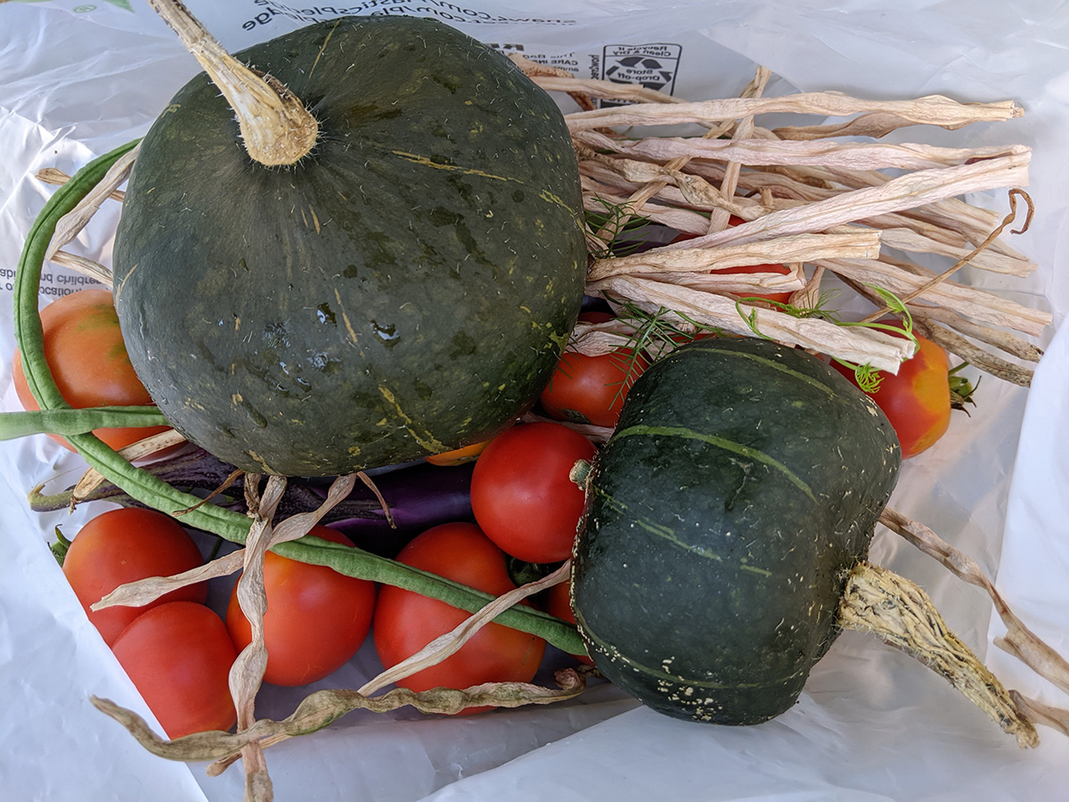 i left the cafe by 3:30pm and went to the community garden again. this time i had a plastic bag. i watered my plants again while at the same time harvesting the vegetables: 2 pingtung eggplants, bunch of serrano and thai chili peppers, 2 buttercup squashes, a bunch of tomatoes, and about a dozen dried long bean pods.