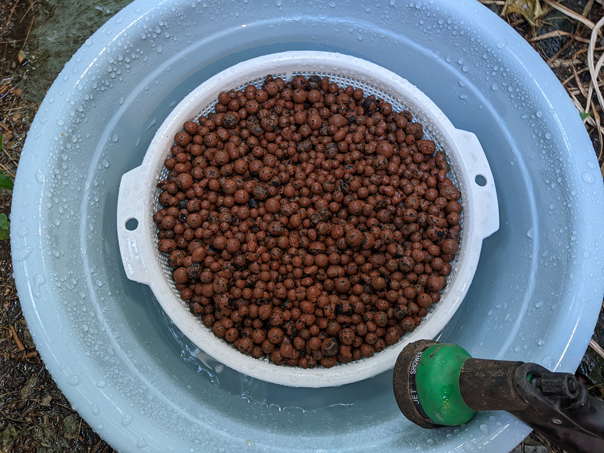 back in the house, i watered my outdoor potted plants on the backyard deck (umbrella plants, pileas, prayer plants) before taking my soaking leca and rinsing them off one last time.