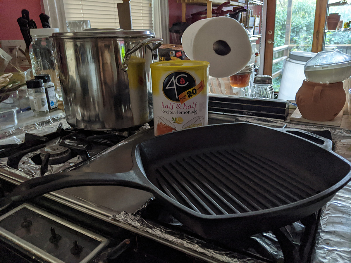 coming back from the run, i picked up an unwanted used lodge-brand cast-iron square grill pan. there was a few rust spots but it looked to be in good-shape. these things typically go for $22 online. that's another great reason to run: i've found so many cool things people have tossed out. plant jars, to books, and now a cast-iron pan.