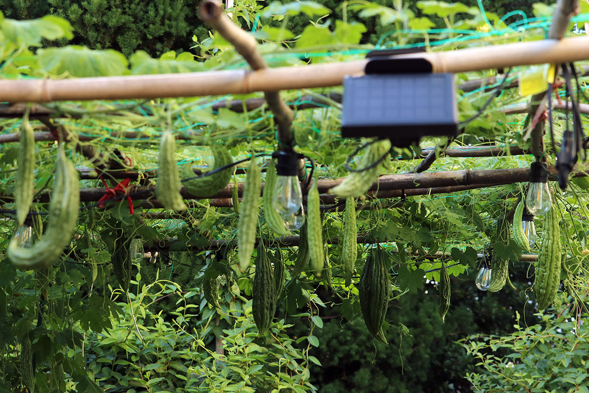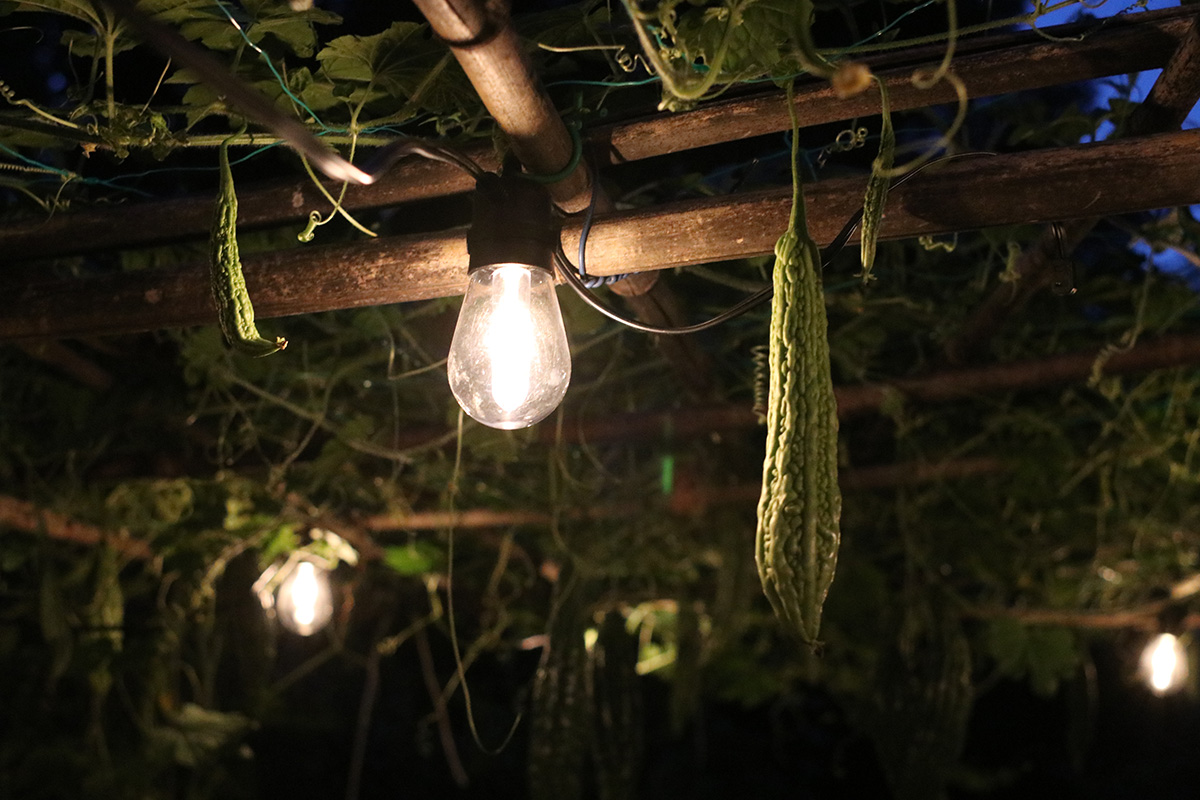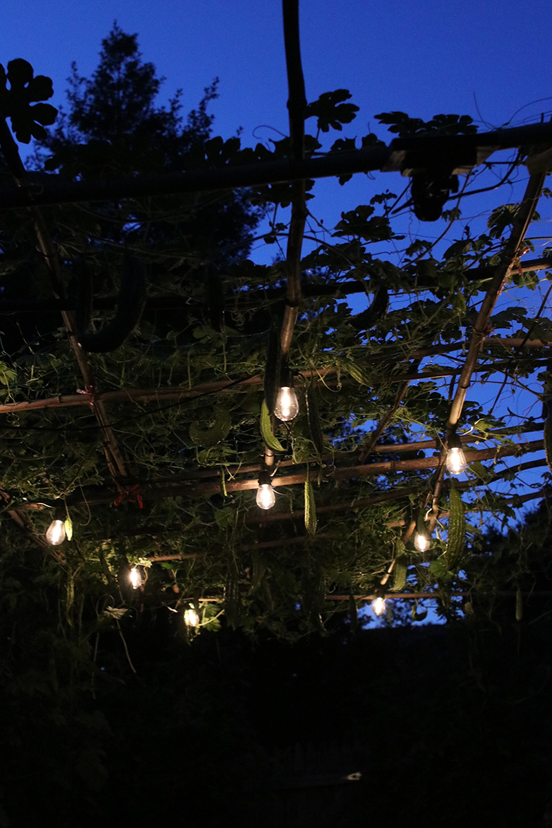 because i was chromecasting slow horse from my computer, my mother wouldn't let me leave until she finished all 6 episodes, which finally ended at 8pm. in the meantime i had a chance to go outside and take photos of the hanging bitter melons on the trellis illuminated by our led edison light bulbs.