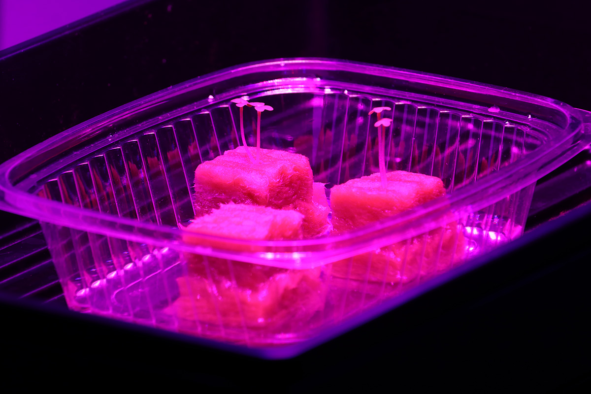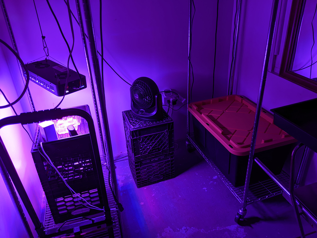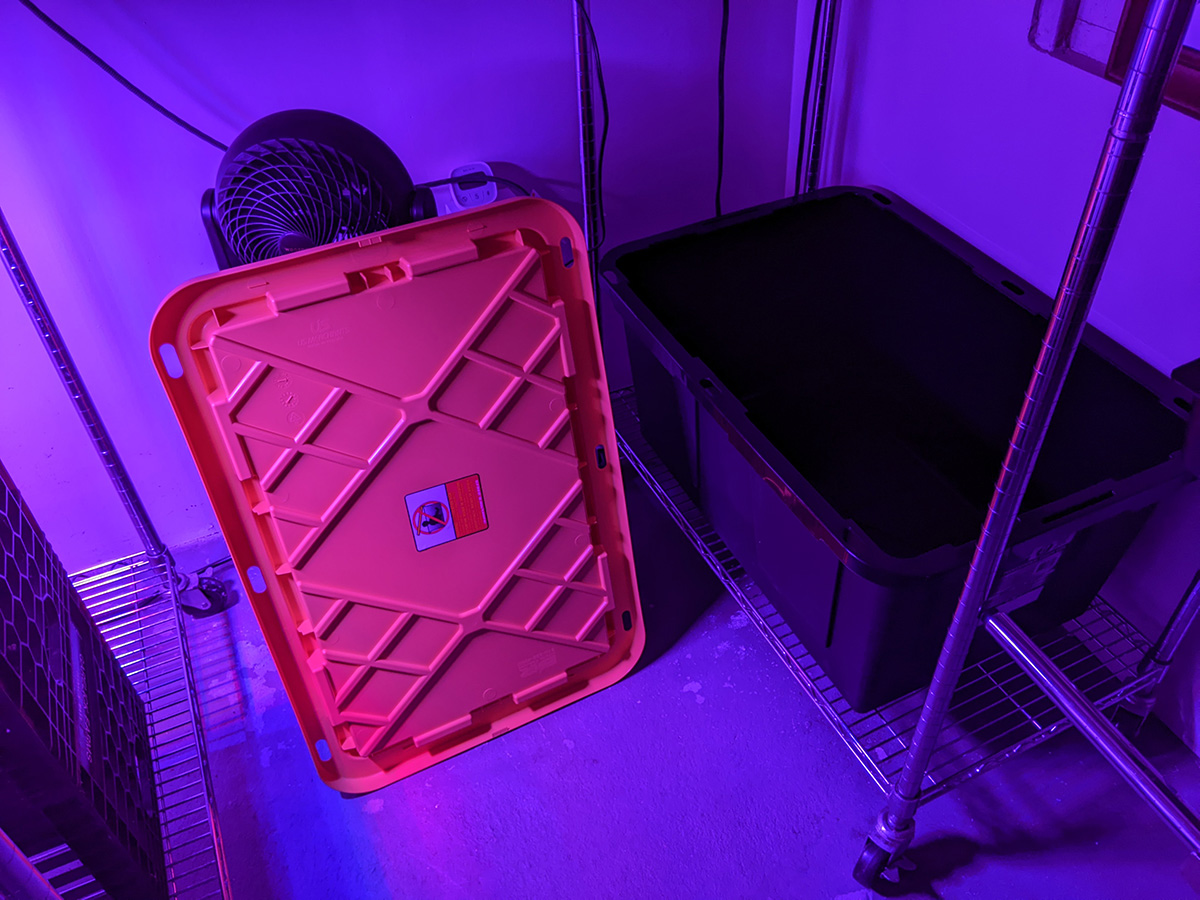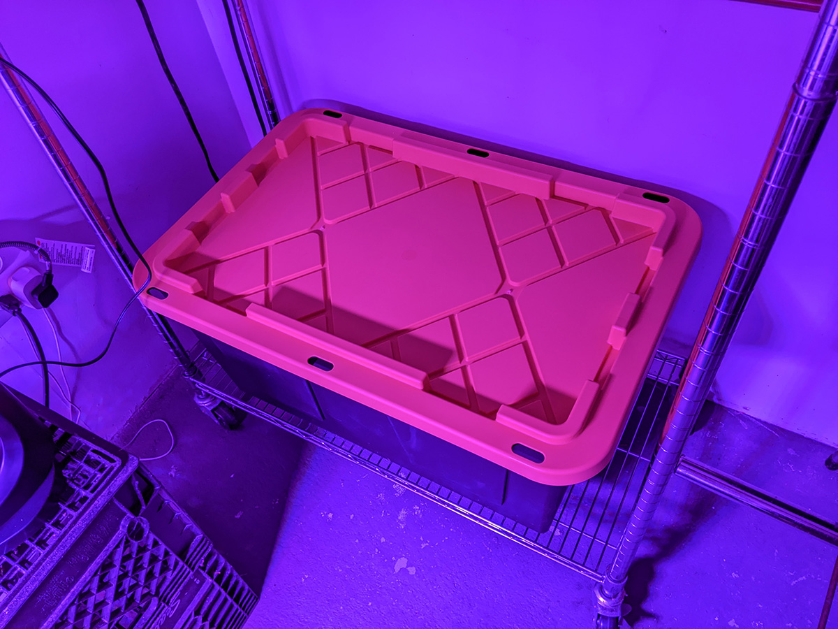 i went down to the grow room with the new tote container. it's a perfect fit for the 3ft long adjustable wire shelving unit. i better get started on my aeroponics project, because i don't know if i have the space to growing mustards when the grow room is filled with houseplants come the end of fall and throughout the winter. i thought i had a spare shelving unit but my father used it to make more storage space for the cafe work table. later i discovered two of the rockwool cubes with the mustard seedlings have already developed roots poking out the bottom. i'll need to come back tomorrow and set up my kratky hydroponics mason jars.