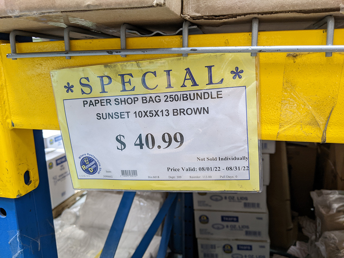 restaurant depot was our next stop. we bought a case of edamame beans, and some lids and containers for condiments. we also checked out their paper bag selection, but couldn't quite figure out what size we currently use, so we took photos instead. we were afraid we'd be waiting in line forever, but we actually got a pretty fast line, only waited a few minutes.