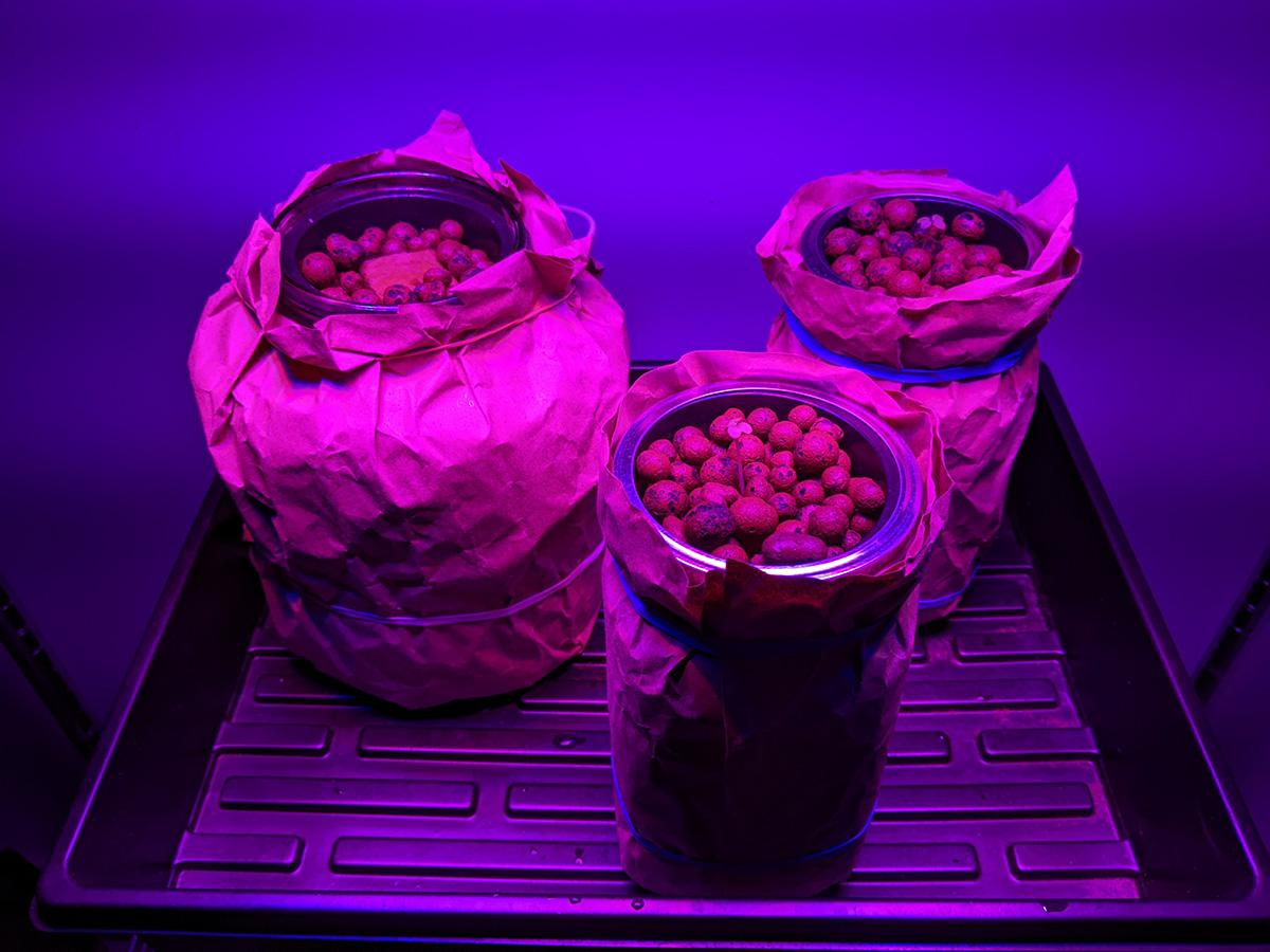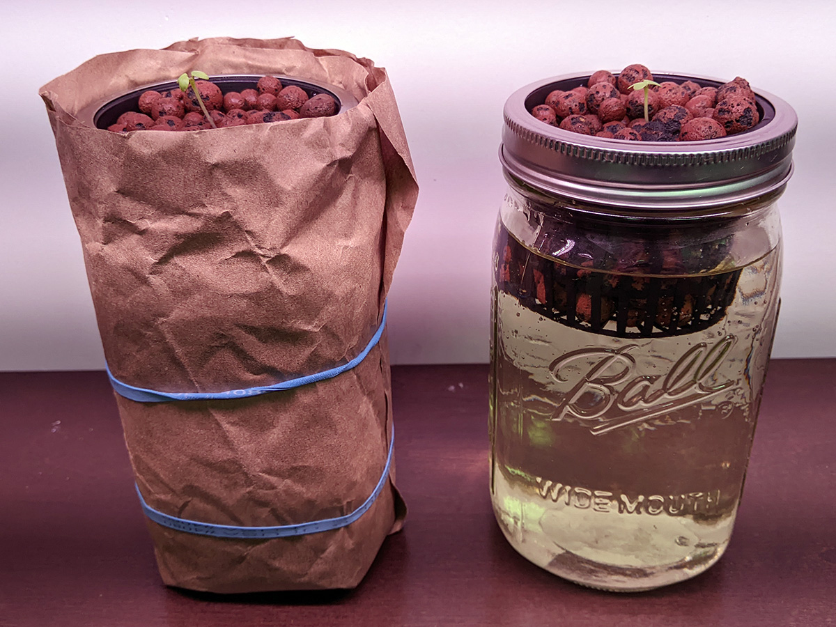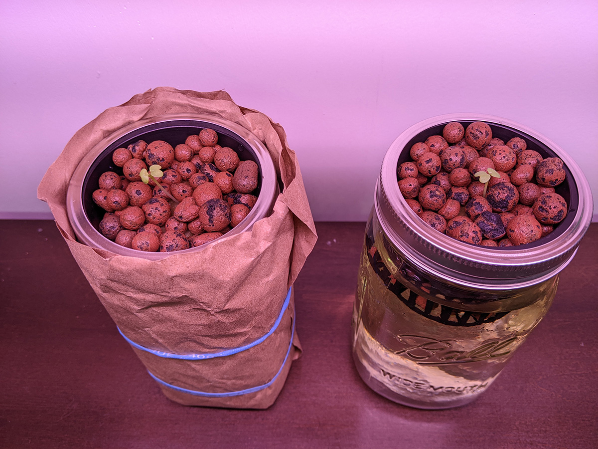 everything looked good and i put the jars underneath the led grow light, until i remembered i forgot a crucial step: covering up the jars so light can't shine into the nutrient solution, otherwise i'd get an algae bloom and that'll kill the roots. fortunately i had some crumpled brown paper packaging material that i used to make jar covers. with that i finally set the jars underneath the grow light.