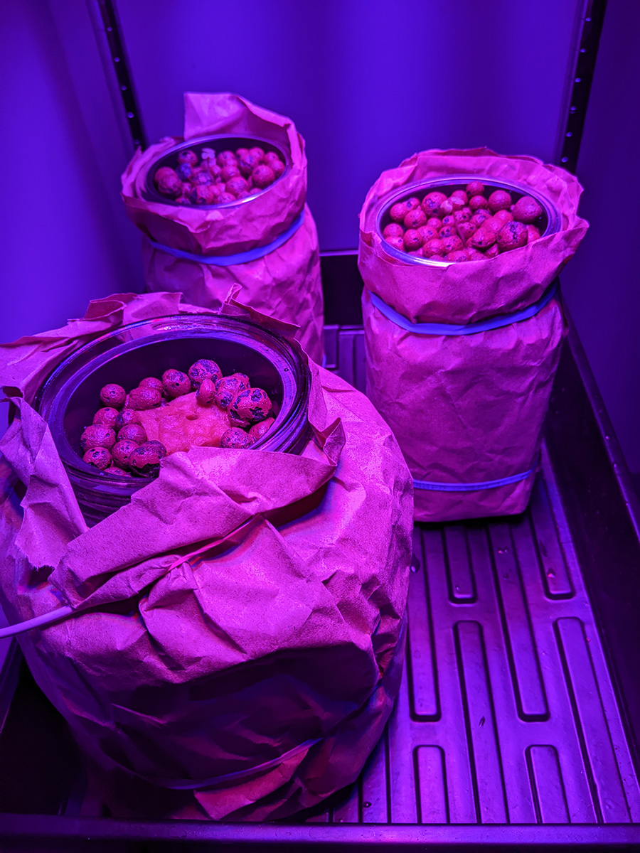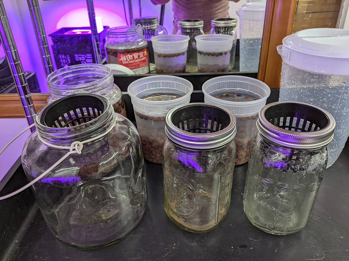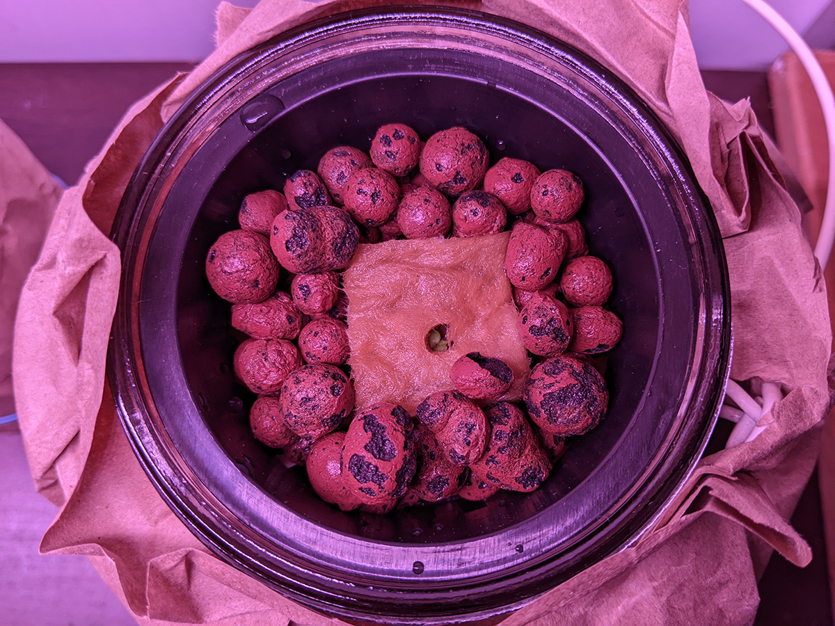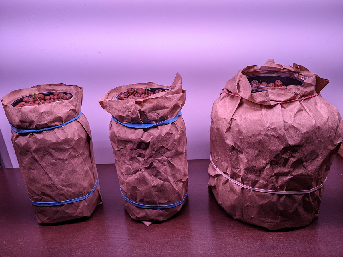 everything looked good and i put the jars underneath the led grow light, until i remembered i forgot a crucial step: covering up the jars so light can't shine into the nutrient solution, otherwise i'd get an algae bloom and that'll kill the roots. fortunately i had some crumpled brown paper packaging material that i used to make jar covers. with that i finally set the jars underneath the grow light.