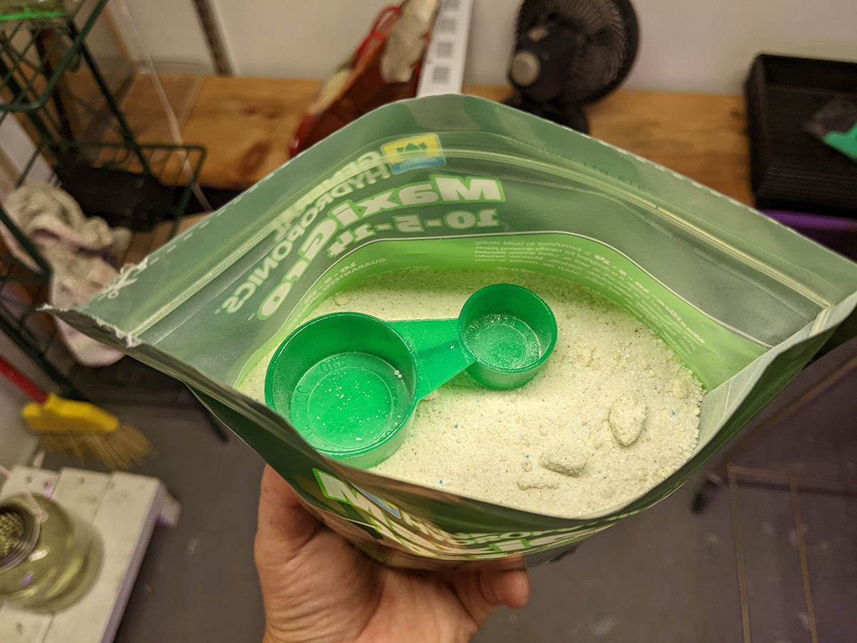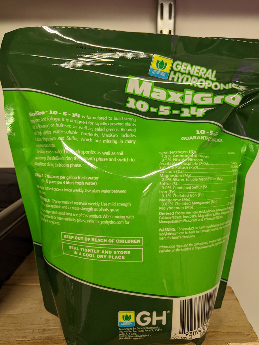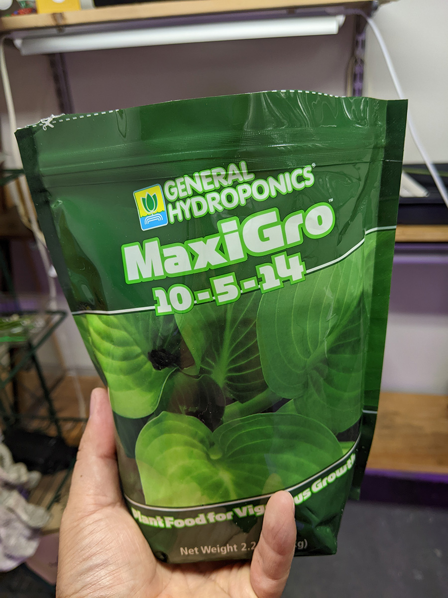 the next hurdle was how much hydroponics nutrient powder to use. i was using general hydroponics maxigro (10-5-14). the recommended value is 5-10 grams per 4L of water. i decided to use the smallest amount - 5g to 4L of water, and did some math to figure out 1.4L of water required 1.75g of maxigro powder. i got the kitchen scale and realized something: the lowest value was 1g, i couldn't get anything in the decimal range. i did the best i could, figured i'd slowly add to 2g and then reduce a pinch to get about 1.75g. i dumped the measured nutrients into the pitcher of rain water and took new readings: pH was now 3.5 with an EC of 1200ppm! later i found out that maxigro nutrients has a tendency to lower the pH. so in my case, pH 6 to pH 3.5, a 2.5 drop. had i known i would've just used tap water (pH 9 to pH 6.5). i could've diluted the solution but that thought did cross my mind. instead i figured i'd get some pH up and down chemicals and adjust the nutrients accordingly.