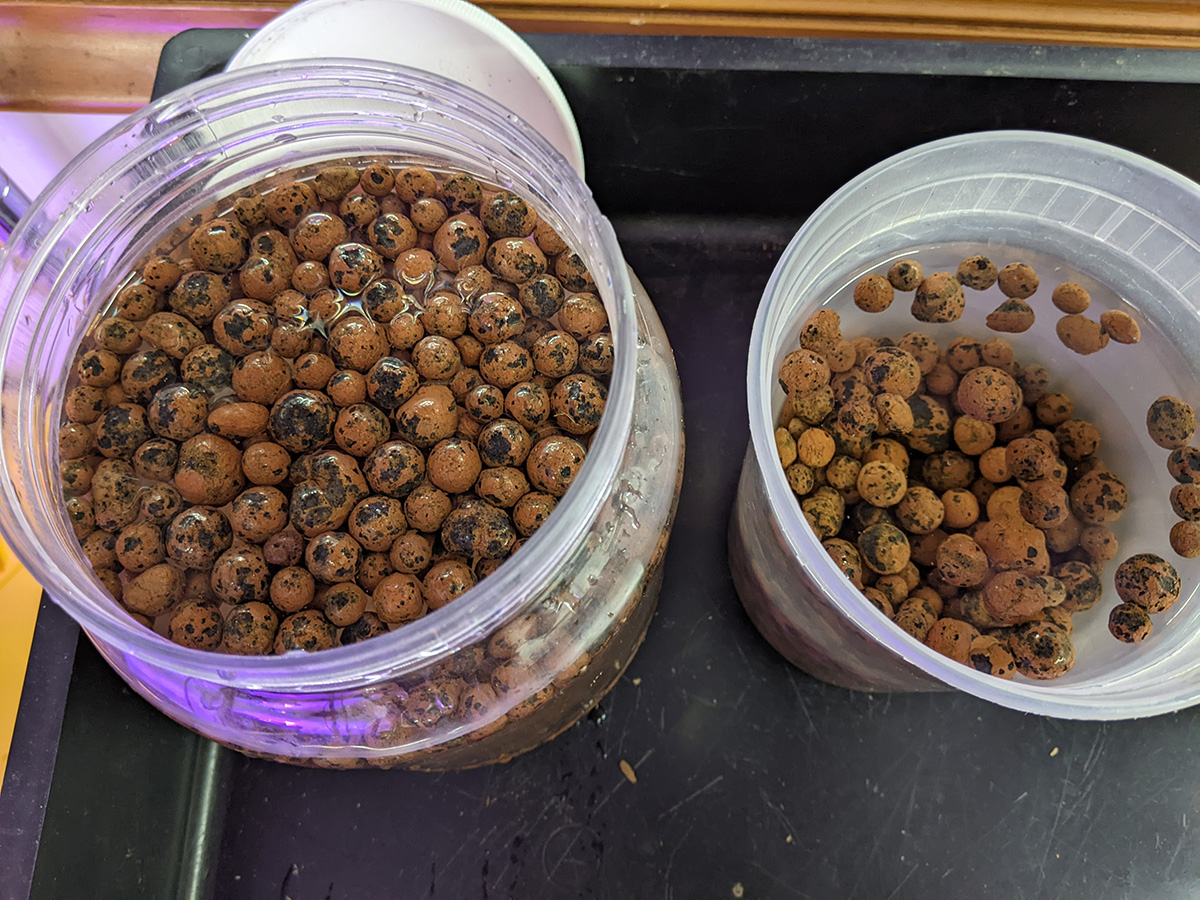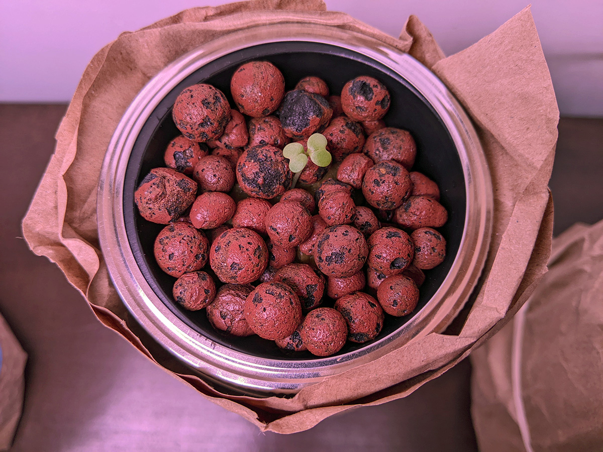 assembling the kratky hydroponic was a simple matter of putting the wet rockwool with mustard seedling into the net cups and using soaked leca balls to hold it in place. the two emerging rockwool seedlings i put in the mason jars, while the rockwool with the yet-to-emerge seedling (though i could see it already germinated inside the hole) i used on the larger jar.