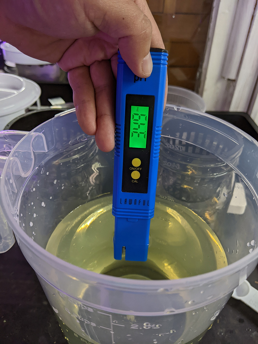 for the larger jar, instead of using all tap water, i used half tap water and half rain water. the pH was 7.7 and the EC 65ppm. after adding the maxigro powder, the new pH was 5.27 and the EC 758ppm; still not optimal but better than the mason jars.