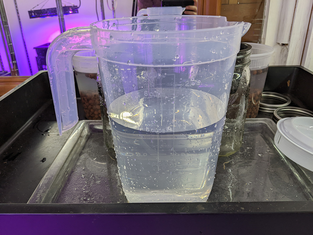 i moved everything to the basement grow room to work. i first measured how much water i needed. i had 2 quart-size mason jars and a large hanging jar. the mason jars required 3 cups of water for it to come up 1/4 on the 3" net cups (for a total of 6 cups or about 1.4L). the large hanging jar required 8 cups of water to come up to the same level on a 3" net cup. i took pH and EC measurements on the tap water. mustard green likes a pH between 6.0 - 7.5 and an nutrient EC of 600-1000ppm. the pH value for my tape water fluctuated, as high as 9.46 and as low as 8.70, so an average of pH 9. i wasn't sure how accurate my pH reader was, and i couldn't calibrate it with the pH buffer powders because i didn't have any distilled water. the EC reading for tap water was 91ppm. out of curiosity, i went outside and tested the rain water: pH 6 and EC 16ppm. i decided to use rain water since it had an optimal pH value.