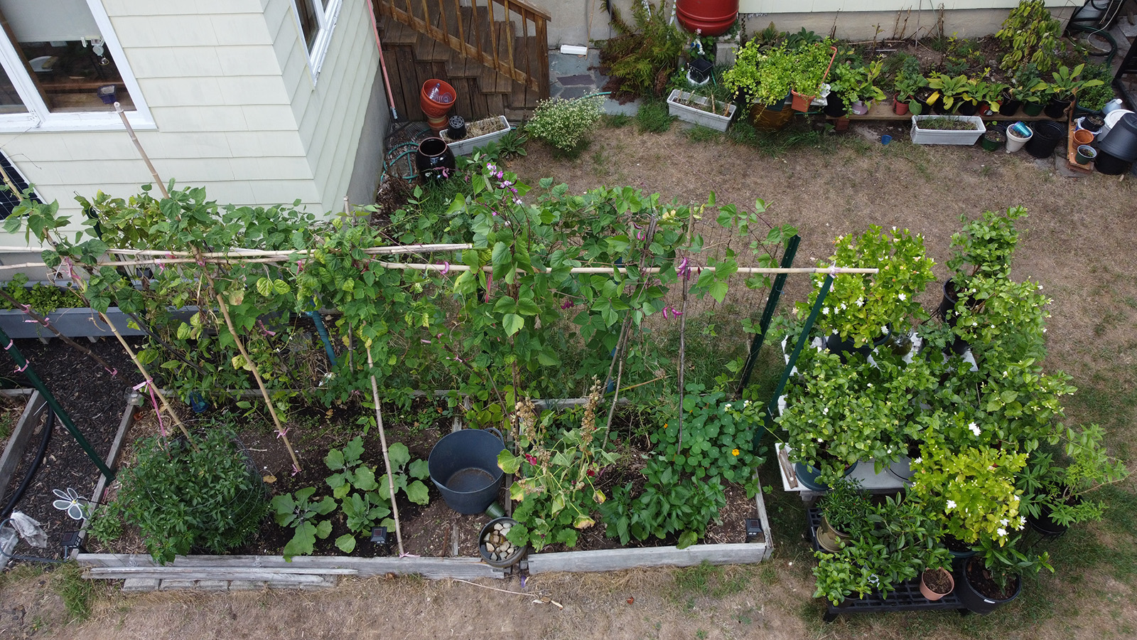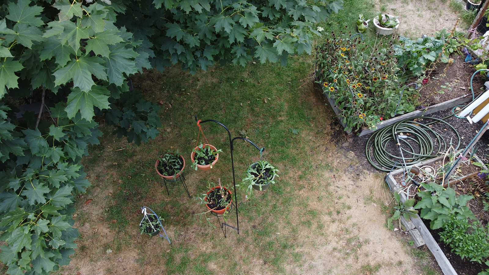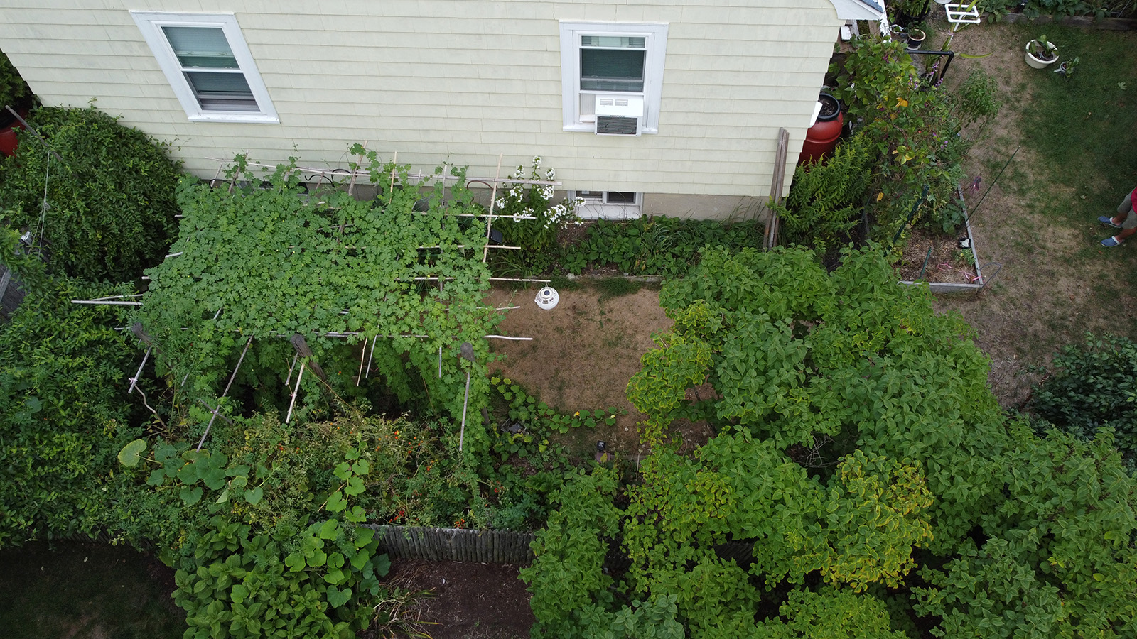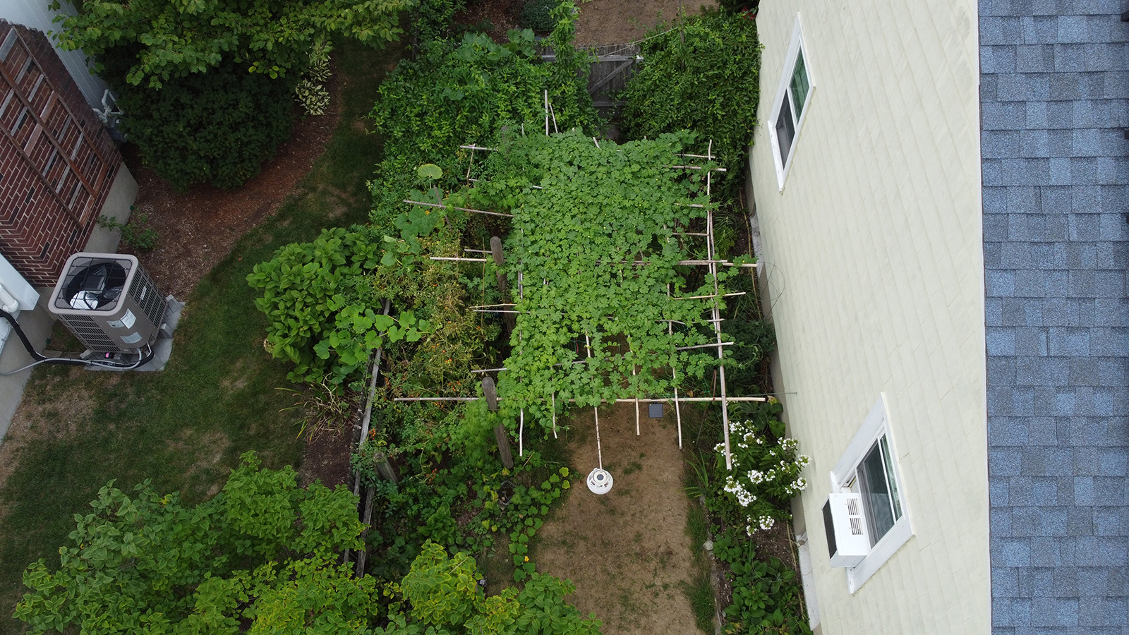 in the late afternoon with storm clouds beginning to assemble on the horizon, i grabbed my drone and sent it up in the sky to survey the clouds. i went as high as i could go (DJI has a limit of 1600ft) and took a panoramic photo before coming back down. i also managed to check out our western bed bitter melon trellis from the sky. the way it climbs and grows, it really does act like a green screen for shade. i also saw a squash that appears to be growing from our neighbor's garden climbing back into our yard.