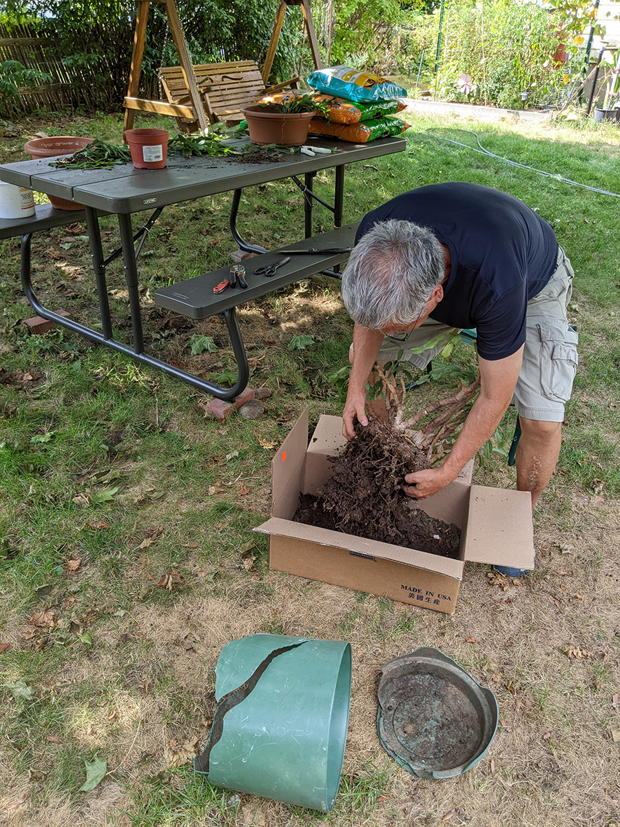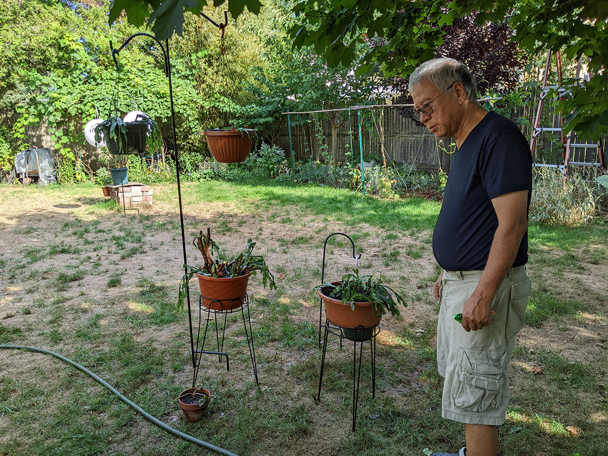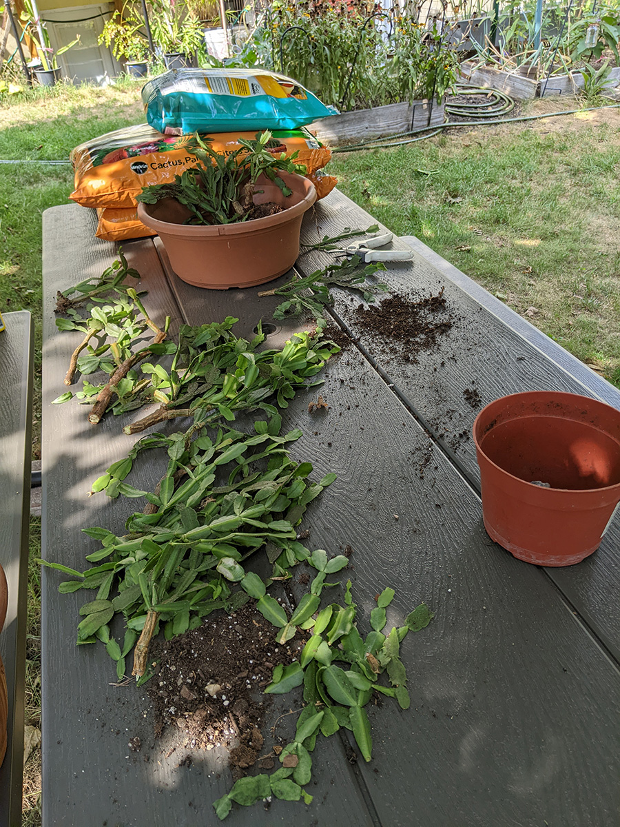 when i returned home, my father and i repotted the broken cactuses. we decided to use the cactus soil as-is, without adding additional perlite. the cactus soil seems like a blend of compost, sand, fertilizer pellets, and a bit of perlite (so we could've mixed our own essentially). the largest cactus - the christmas cactus - was also the one that sustained the most damage, most of the cactus "leaves" having been broken off when it fell from the shelf and tumbled down the cafe basement stairs. all that was left was the bare "trunks" of the cactus. we used that as the centerpiece and then planted the broken branches all around. it also left behind numerous small side shoots, which we managed to repot into 3 additional hanging containers. there was also a thanksgiving cactus. it broken into smaller pieces, we were able to repot all of it in a more shallow pot. to be honest, despite the damage, we managed to salvage most of it, and from original two large potted cactuses we managed to get 5 potted cactuses. we only used up a bag of cactus soil, but my father said to keep the 2nd bag as he's planning on repotted the dragon fruit cactuses before we move them into the basement in mid-fall.