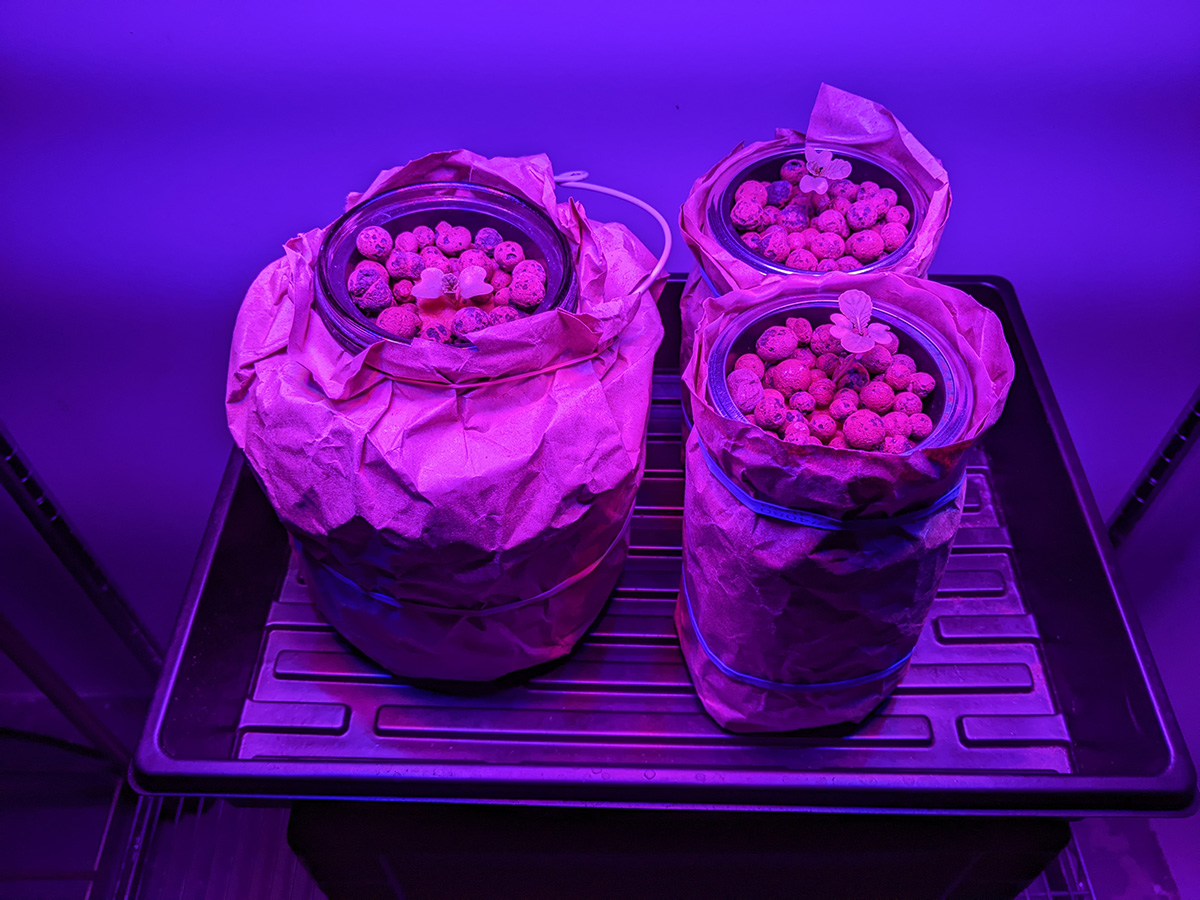 i went to the basement grow room to inspect the hydroponic mustards. that one plant in the large jar seemed to have doubled in size since i last saw it yesterday. i also had time to see what it'd look like to have 12 3" net cups on the tote storage lid. looks like a perfect fit, and each plant has about 6-7" diameter to grow before it hits a neighbor, so plenty of space.