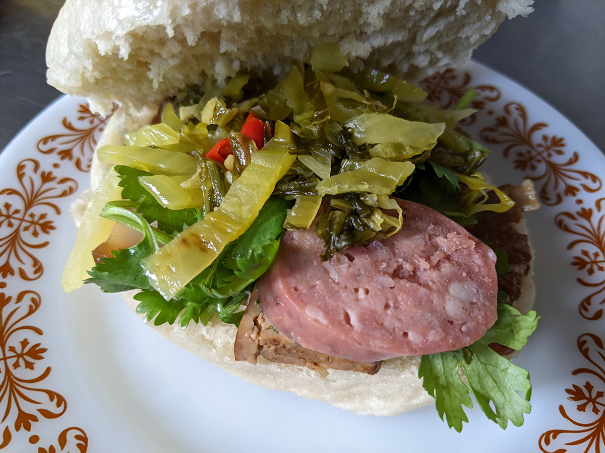 because i woke up so late, i had less than half an hour to get ready and go to the cafe to help out my parents. i took the bicycle, wore jeans because it was actually a little chilly. my sister was at the cafe making her catered meals for a few clients. it included a quiche pie that she was taking a long time to make. in my own experience, fresh quiche can be very gooey, hard to divide. but the type she made was more like a pie crust pizza with some eggs, cheese, and onions. it was also a recipe she'd never made before, kind of risky trying out new recipes on clients. i ended up having a leftover slice, it was very salty from the gruyere cheese and the crust. later my mother made me a mantou stuffed with chinese sausage.