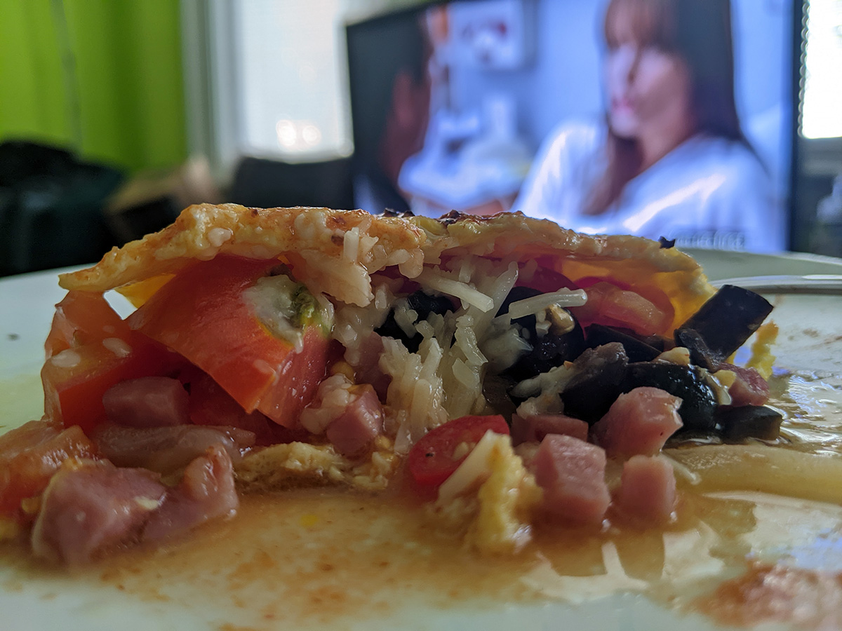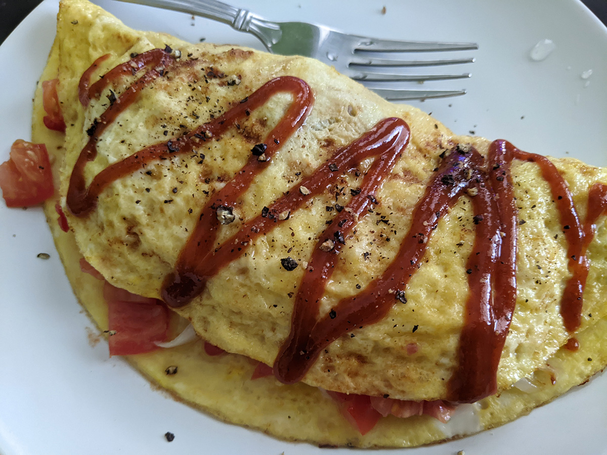 for lunch i made an omelette, after having been reminded by a photo that i can make a decent omelette. it's more about using up leftovers, especially garden vegetables. besides the eggs and some leftover frozen cubed ham, i also chopped up a garden tomato and a garden red serrano, sprinkled with some shredded parmesan cheese and sliced olives.