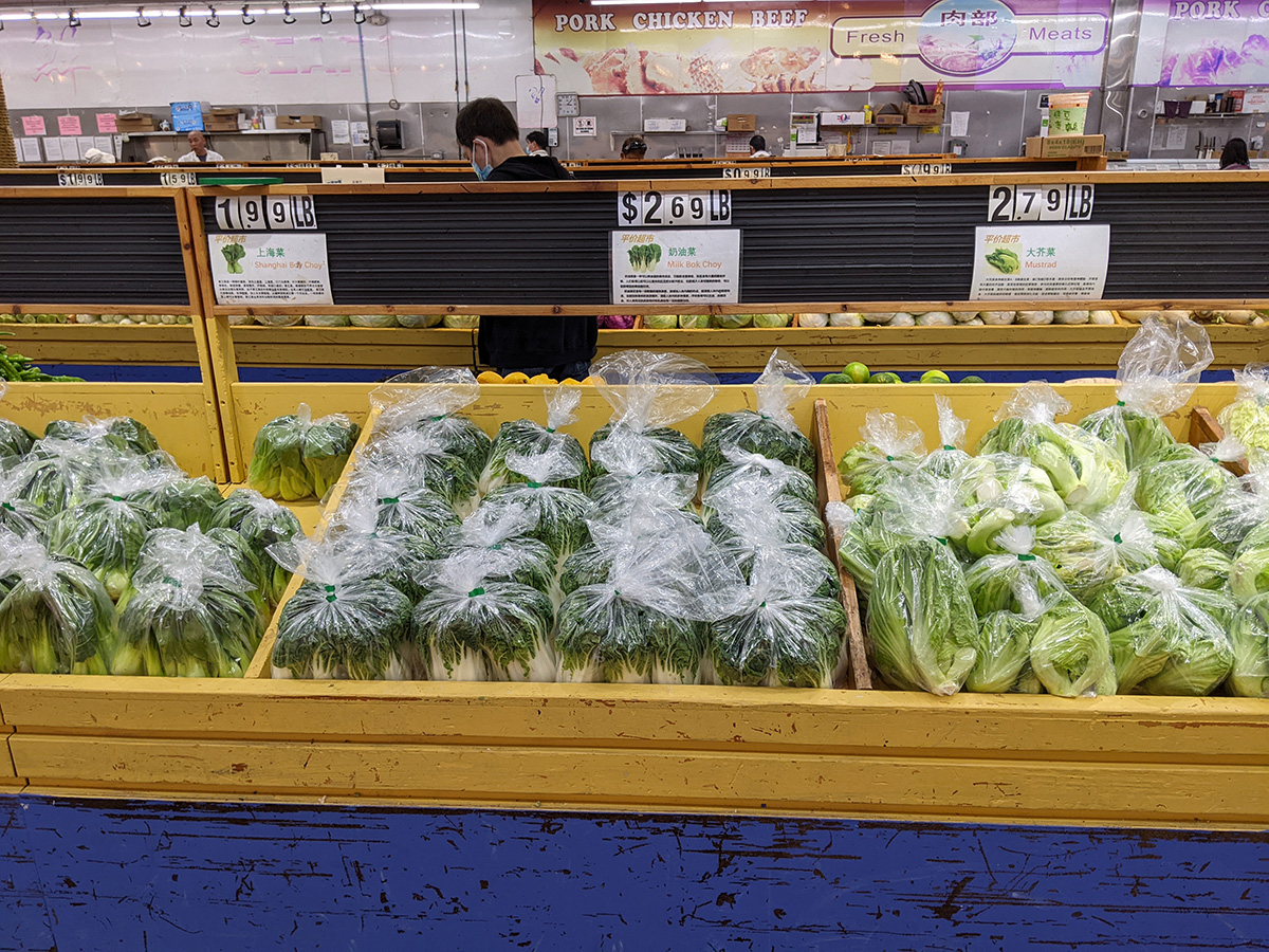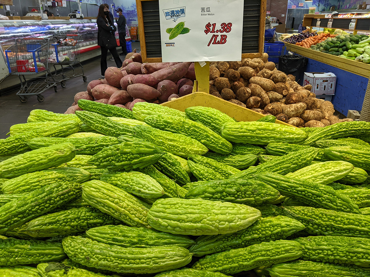 i went to ming's market to get some supplies: chinese cabbage, daikon, carrots, bokchoi. they also had fishnacks (i bought 4 packs, $2.79 each). it's definitely bitter melon season as they're on sale ($1.38/lbs), grown monstrously large. i bought another jar of fried chili oil ($5), this time 菜花香 brand.