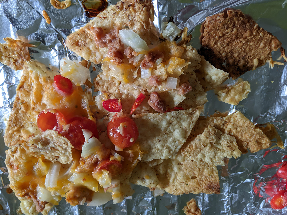 like i said, my mother made some nachos earlier, but then made a second batch when i came back inside with my guidance. i told her about the jar of salsa, as she added the refried beans, the jalapeno pepper, onions, and shredded nacho cheese. the only thing we forgot were the olives. my mother stacked the corn chips too high, so all the ones at the bottom had no toppings, and even some of the chips on top were missing toppings as well. plus she cooked everything in the small toaster oven, a plate of nachos demand the dignity of the big oven to properly cook! they were good though, the salsa i got super hot for some reason even though it said they were medium hotness.