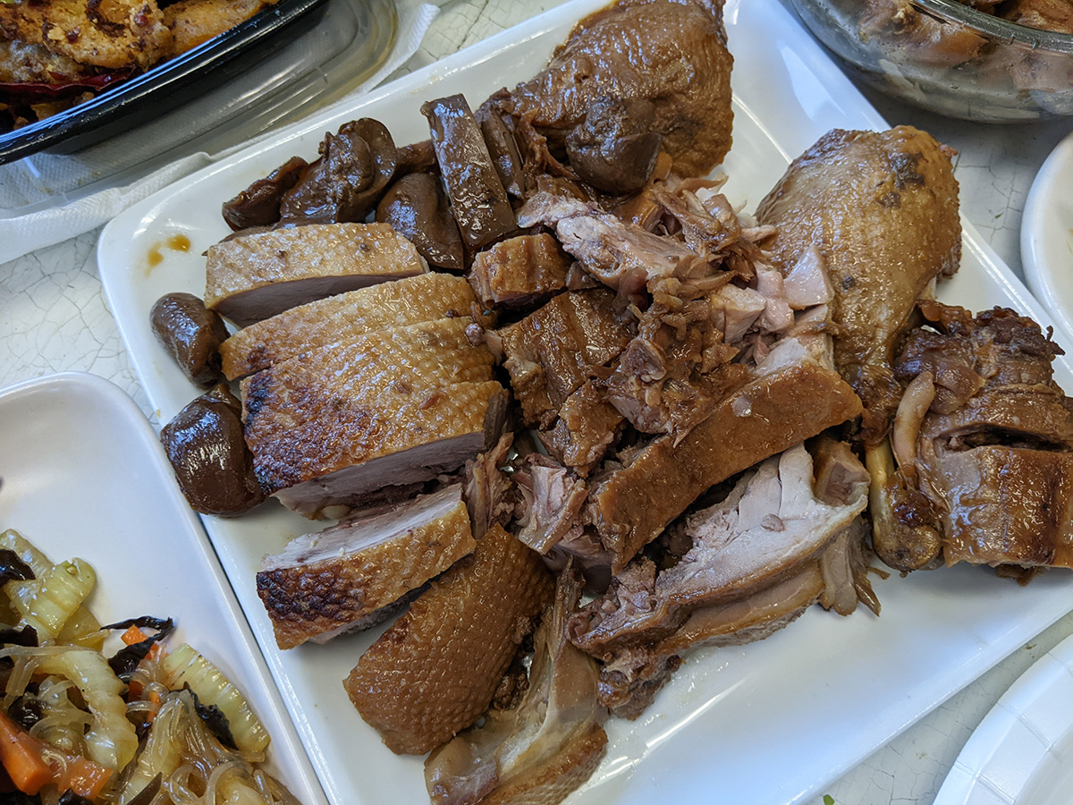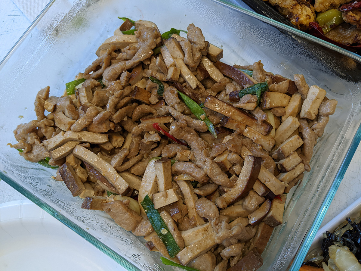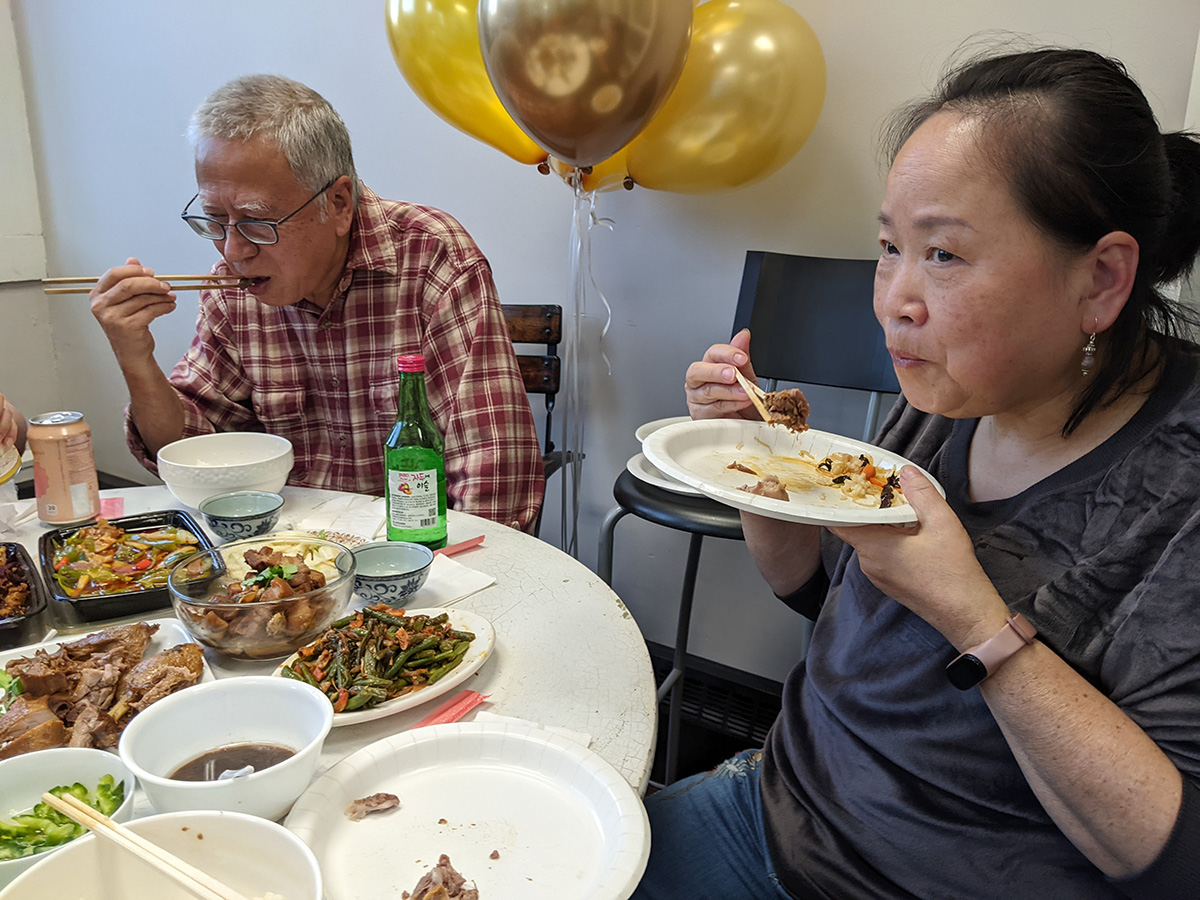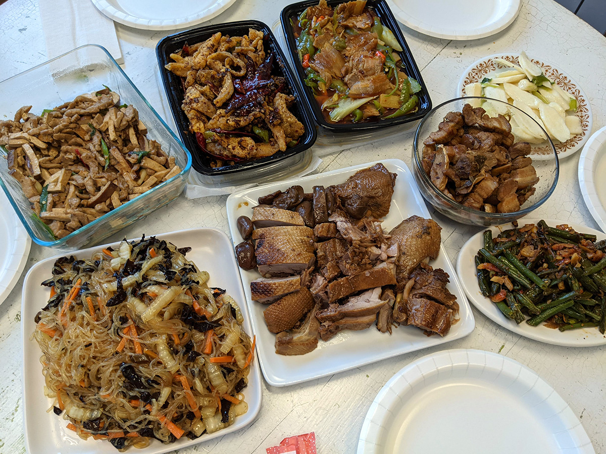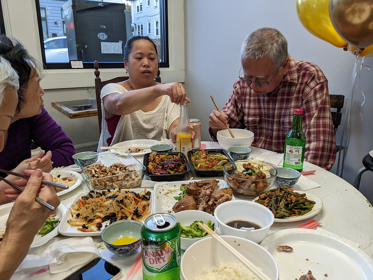 my godmother came with some braised duck along with a few other dishes. jack contributed a cake while alex gave my parents a bottle of chinese wine. we got dried-fried pork intestine and dried-fried smoked ham from zoe's. we closed an hour early so we could have dinner. a long-time customer actually knocked on the door and my sister and i stopped eating to prepare a bento box for her.