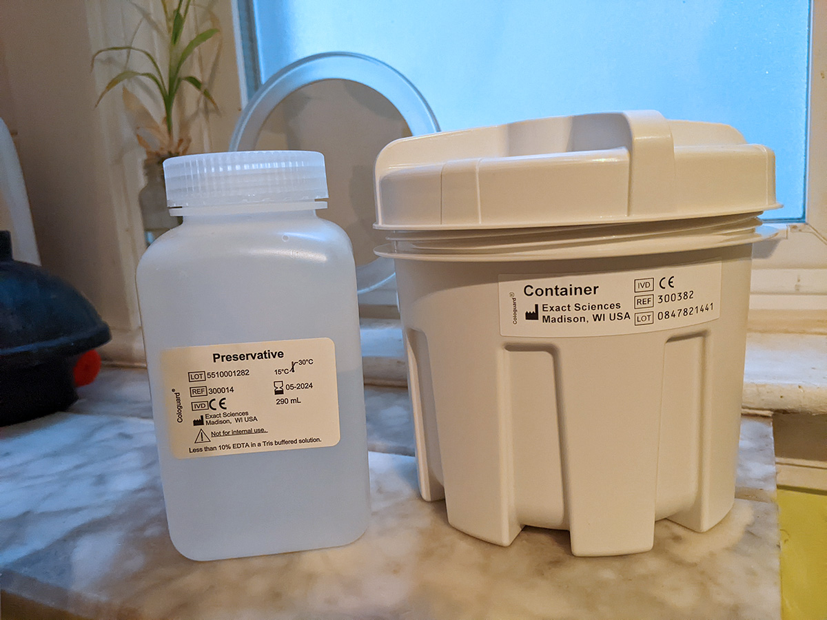 concerned about "giving too much," i pooped about half then removed the cup, so i could finish like normal. i then took my fecal sample and ran a swab over the poop and put the swab into a tube. i emptied the bottle of preservatives into the poop cup, before screwing on the lid. i put the samples into the original box, now with a new mailing label.