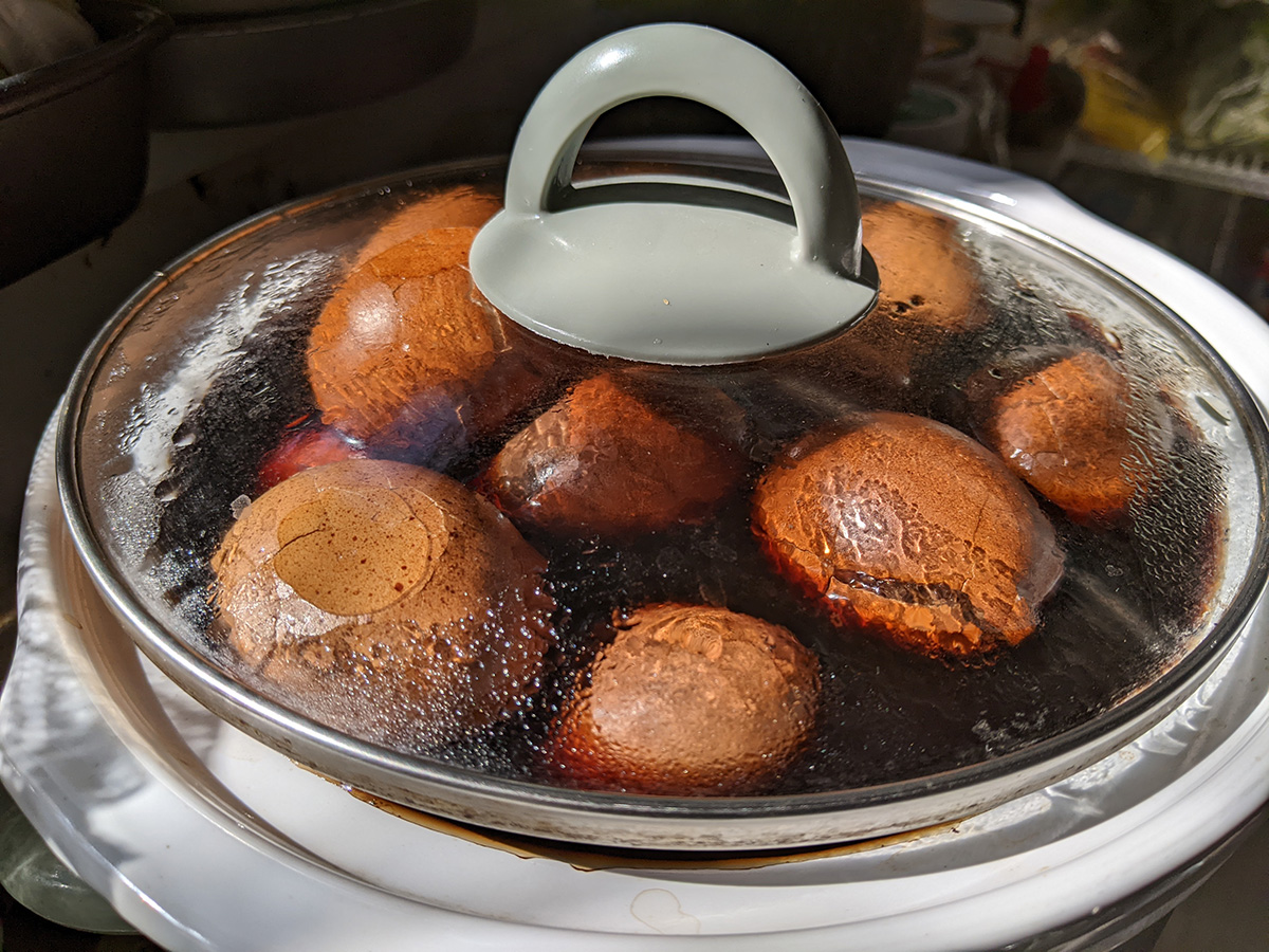 i remember my mother telling me yesterday that today would be a busy day, so i cooked 6 cups of rice. only later would i realize today would actually be a quiet day, as people disappeared for the columbus day long weekend. that similar siege mindset also made me cook another batch of tea eggs, when we only managed to sell a single egg today. i ended up eating one more because i was hungry (a dark egg that had its shell nearly falling off).