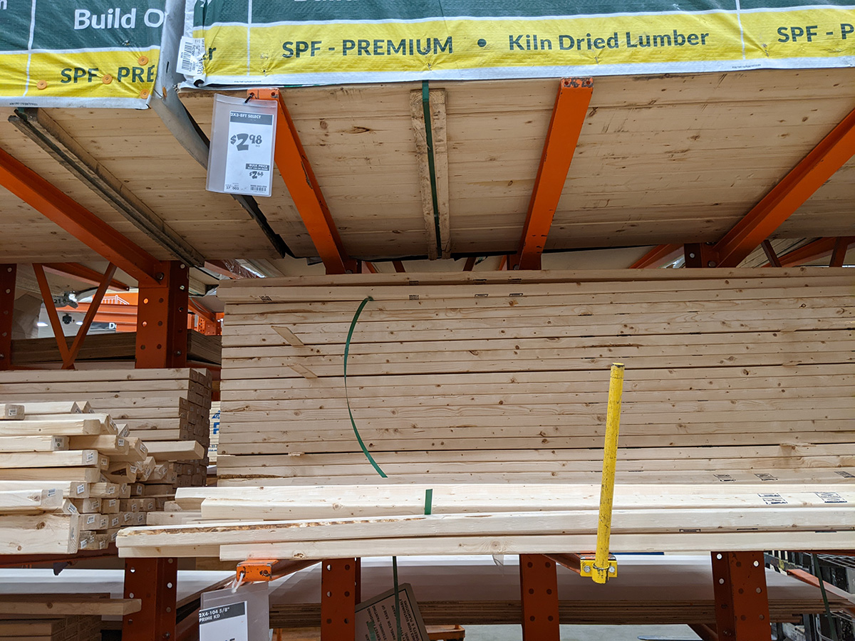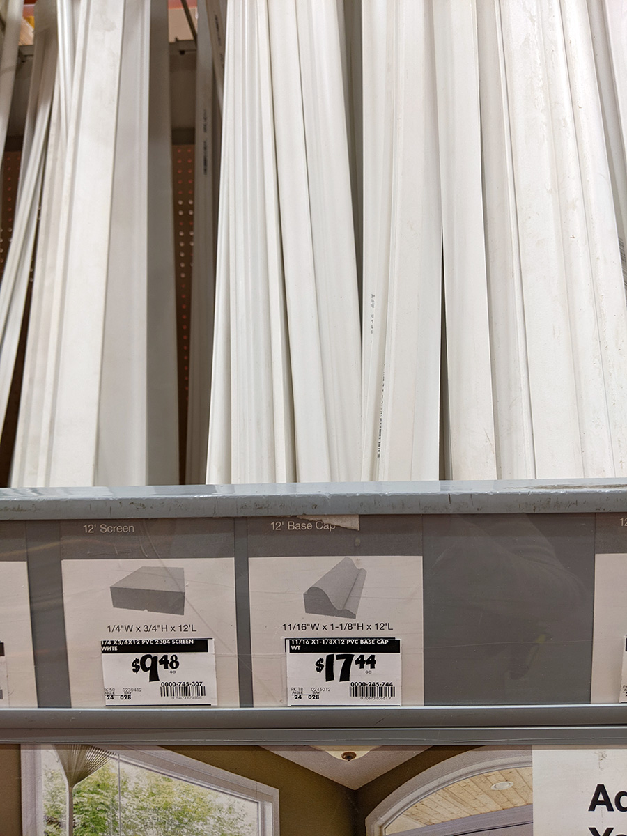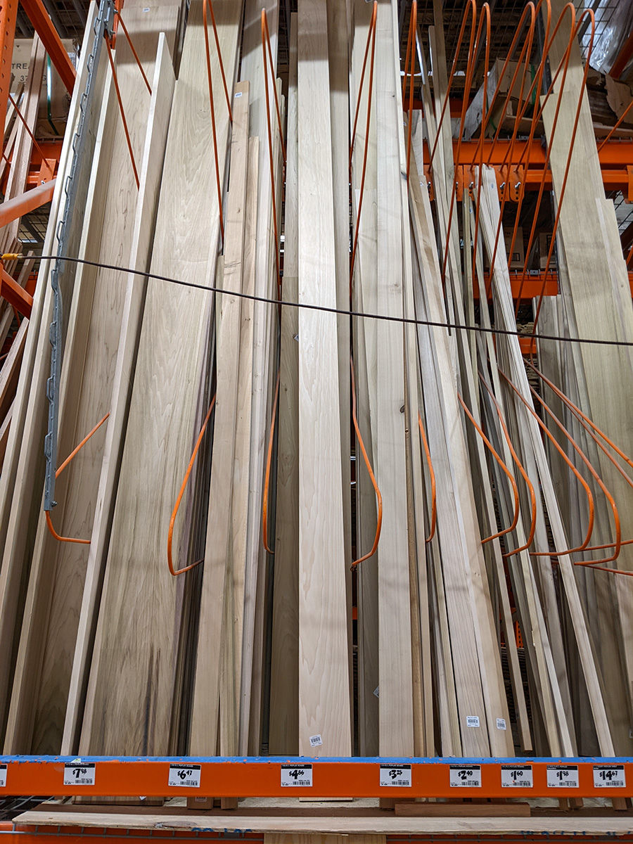 it started to rain a little bit by the time i left for watertown (the forecast wasn't until 3-4pm before we were supposed to start getting rain). i got one of the panel carts from the parking lot, so i could load the sheetrock and lumber. i then spent the next 1-1/2 hours scouring home depot for supplies. first thing on my list was for a 2x4 with the dimensions 1-1/2x2-1/2". i looked everywhere and finally it, they're called 2x3. unfortunately it was only 8ft long (which seems to be the standard length for construction lumber) and i needed a piece closer to 9ft. i grabbed one anyway ($2.98), hoping that i make a mistake measuring my bathroom, and that 8ft will fit. next i found the baseboard cap/moulding. they're sold by the foot ($2.34/ft), and there were cutting stations for customers to trim how long they wanted. i cut one 19" when i just needed 18". it was in that same aisle that i found baseboard wood, this one from poplar, the cheapest they had ($4.86/ft). i cut this to 20".