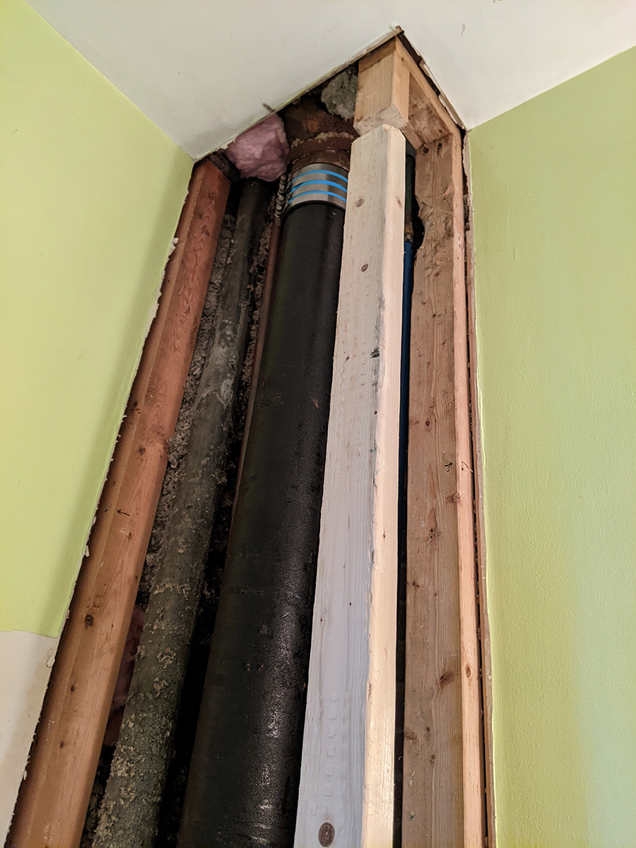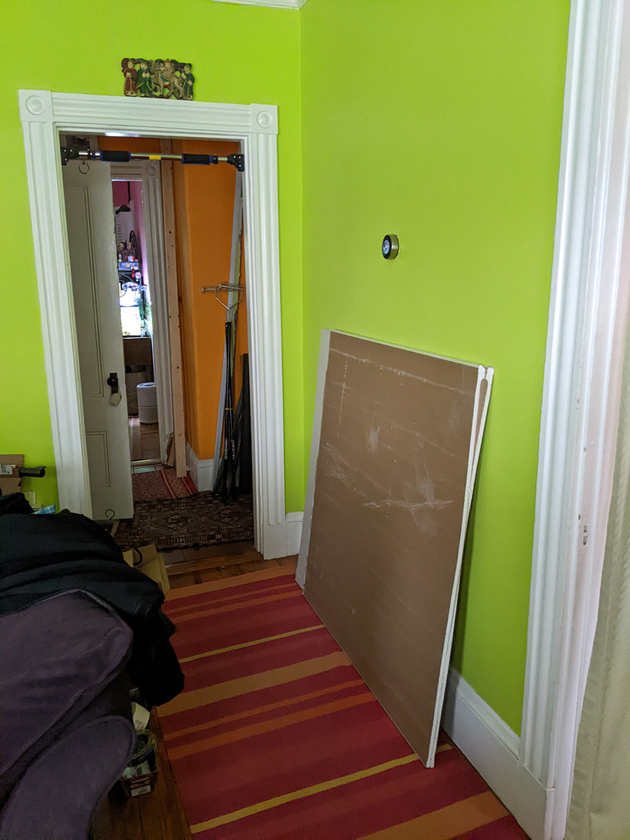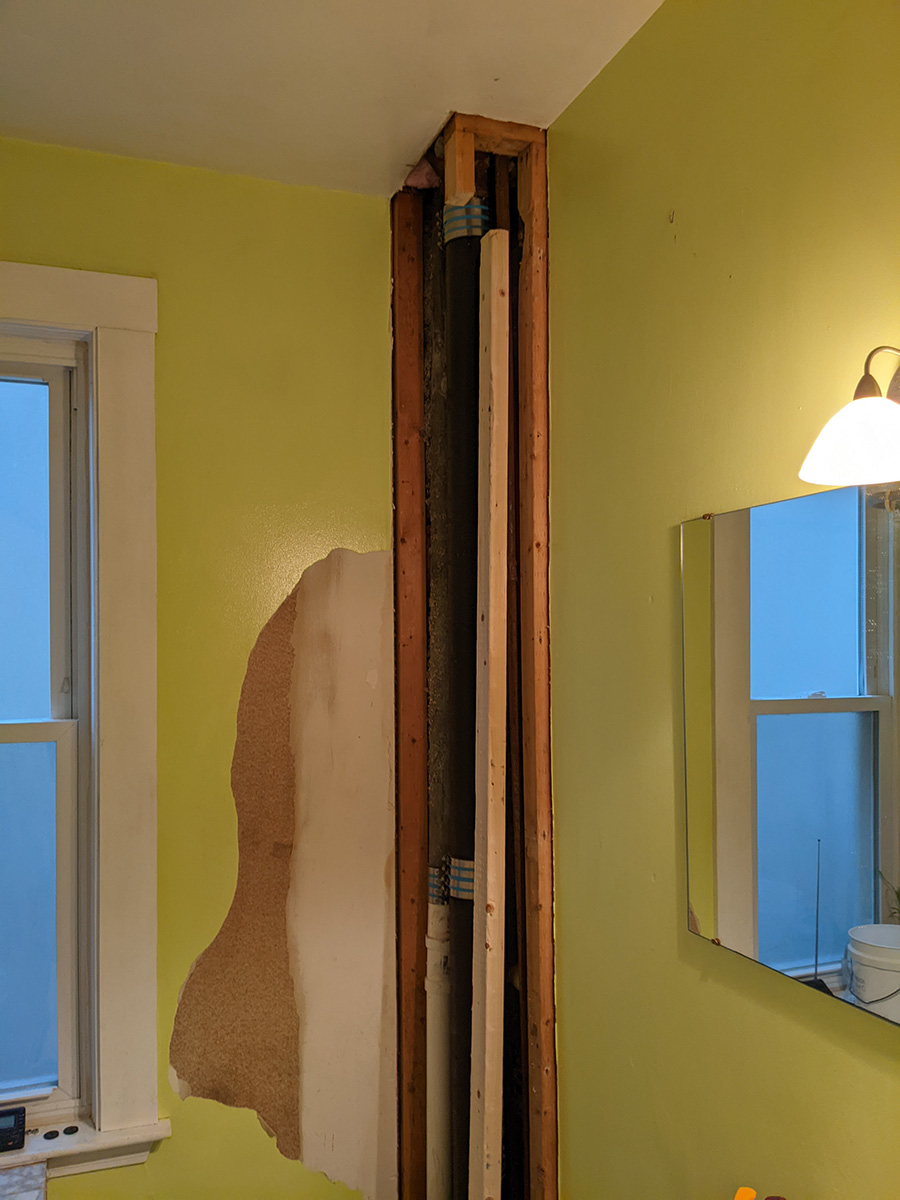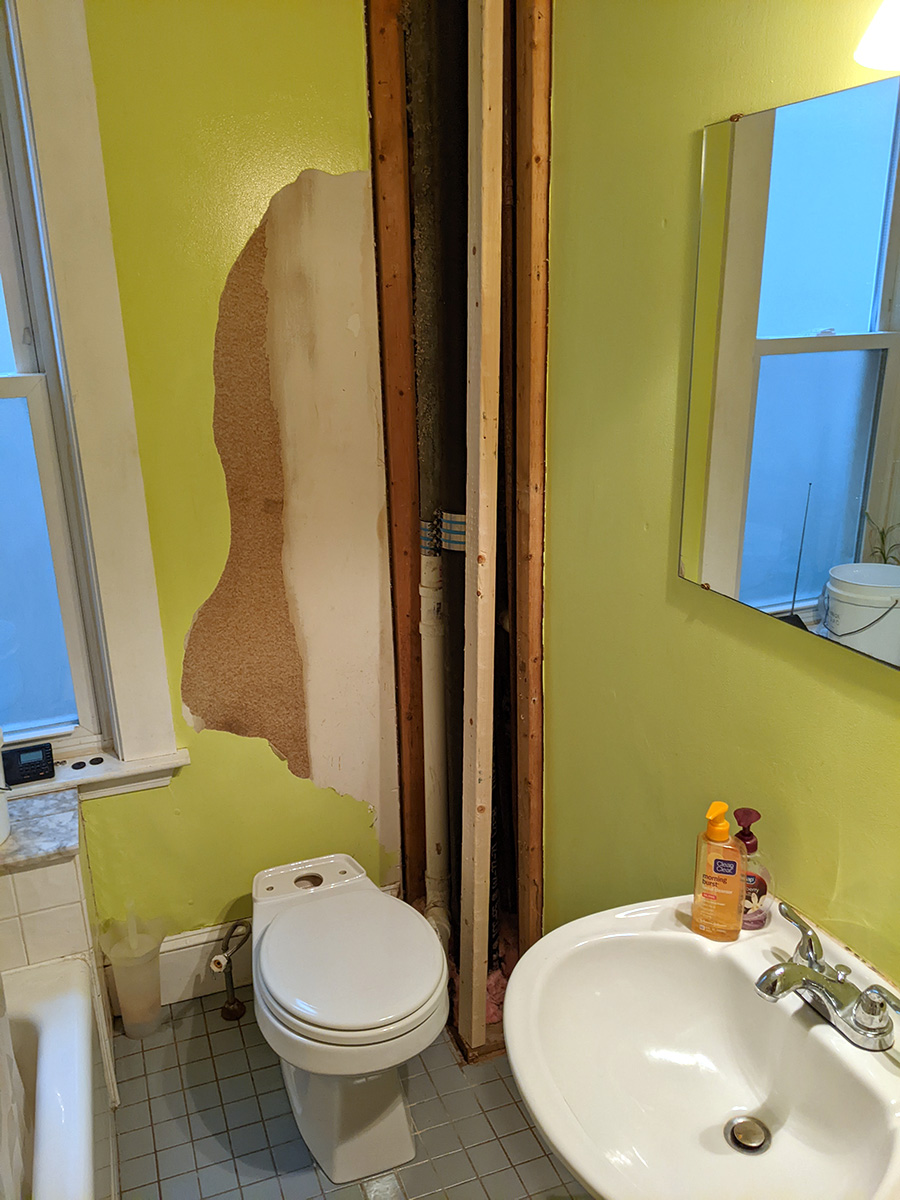 so i did just that, went home, dropped off the equipment and materials. my neighbor renee saw me lifting the huge sheet of drywall into my house, she didn't say anything, like it wasn't anything out of the ordinary (like a leafcutter ant lifting up an absurdly large piece of leaf). out of curiosity i placed the 2"x3"x8' inside the bathroom wall: it was short by 8 inches!
