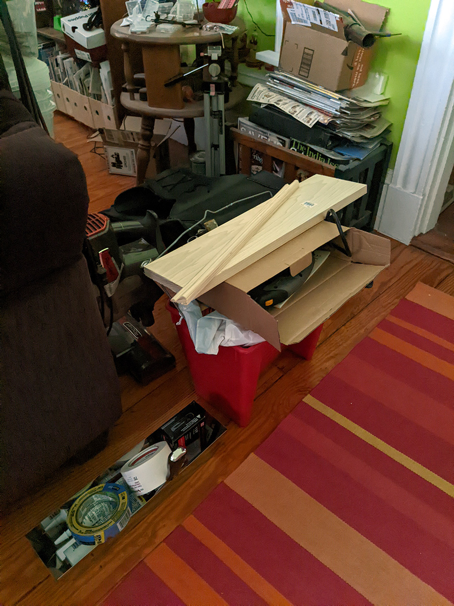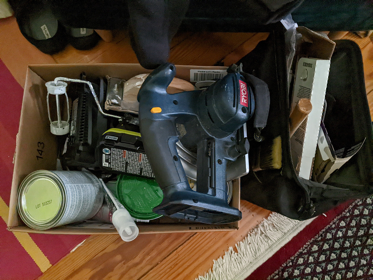 i left home depot by 1:30pm. thankfully it'd stopped raining, because i was worried about my sheetrock getting soaked. the folded sheetrock just barely fit inside the car. i then went to my parents' place to collect some more patching and painting equipment and materials. mostly importantly, i got the power tools: circular saw, jigsaw, and cordless drill. i also found a brand new can of zinsser 123, their water-based primer. i may end up using that instead of the BIN primer because i don't want to deal with cleaning shellac off my brush/roller.