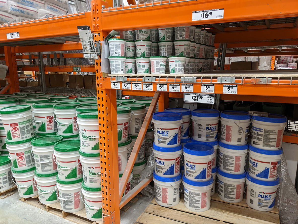 i also bought: a 14" stainless steel mud pan ($16.98, they also had a 12", but the 14" was just a $1 more so i went with the larger size), 6" joint knife ($10.48), 75ft joint tape ($2.78), 1-5/8" length fine drywall screws (1lb. $7.98), alex plus white acrylic caulk ($3.58 roll), kwik seal plus white caulk ($6.78 tube), scotch blue tape (0.94" $7.48), USG all purpose joint compound (3.5qt $5.20, i wanted the USG plus 3 which i heard is better, but they only sold it in multi-gallon buckets), and zinsser BIN shellac-base primer ($23.48). the grand total was $122. i kept the receipt in a safe place, figuring i might return a few things when it's all over and done.