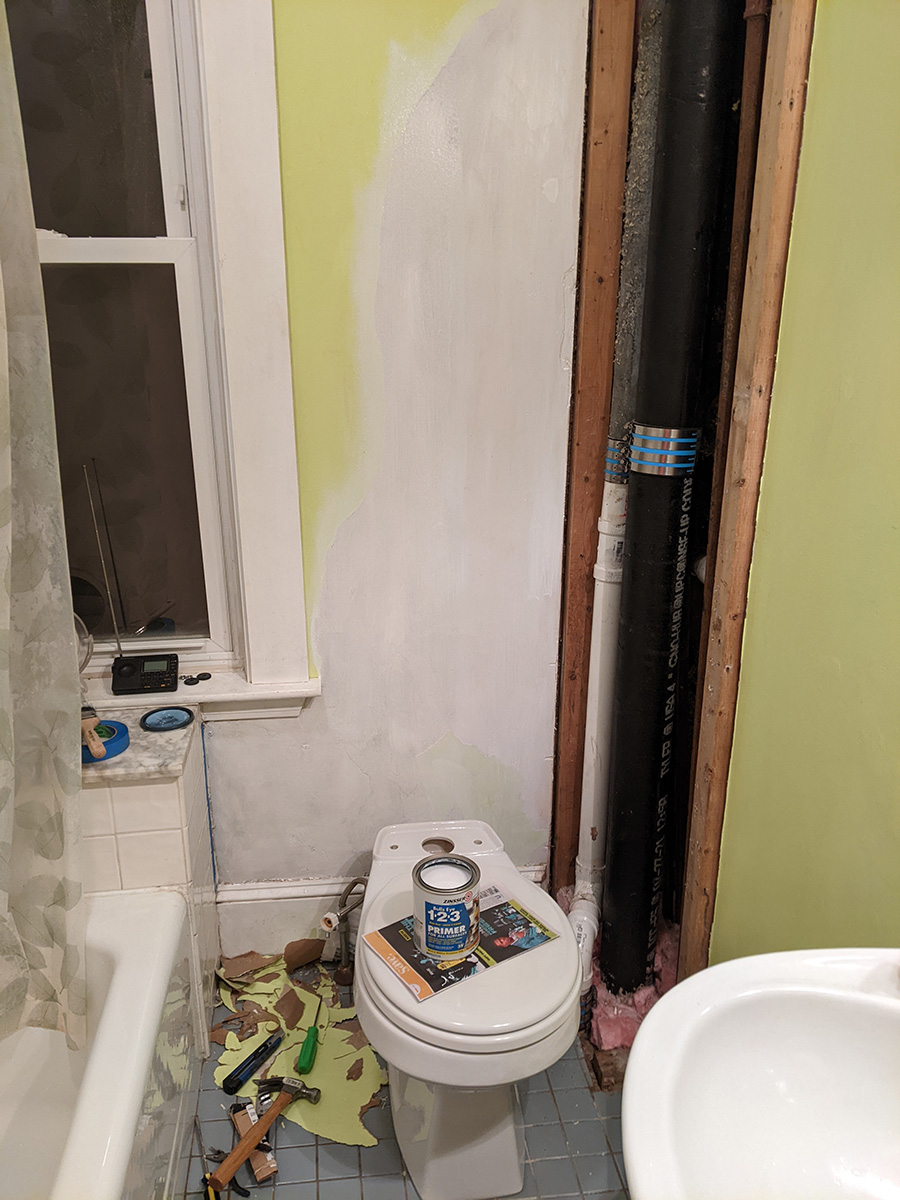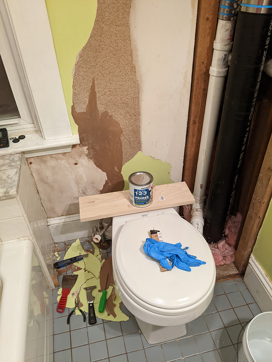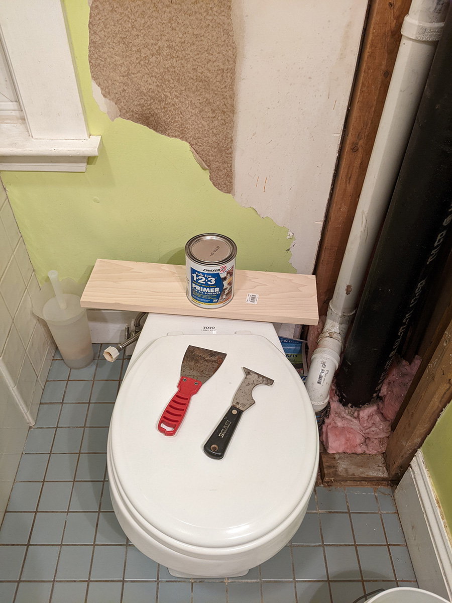 i'm excited to be finally working on my bathroom. it's ironic to be spending so much repairing a section of the bathroom that most people don't see anyway, since it'd be behind the toilet tank and the tall tiny bathroom shelving that's normally balanced on the tank. i think the hard part is the repair; once that's done, the painting will be quick.