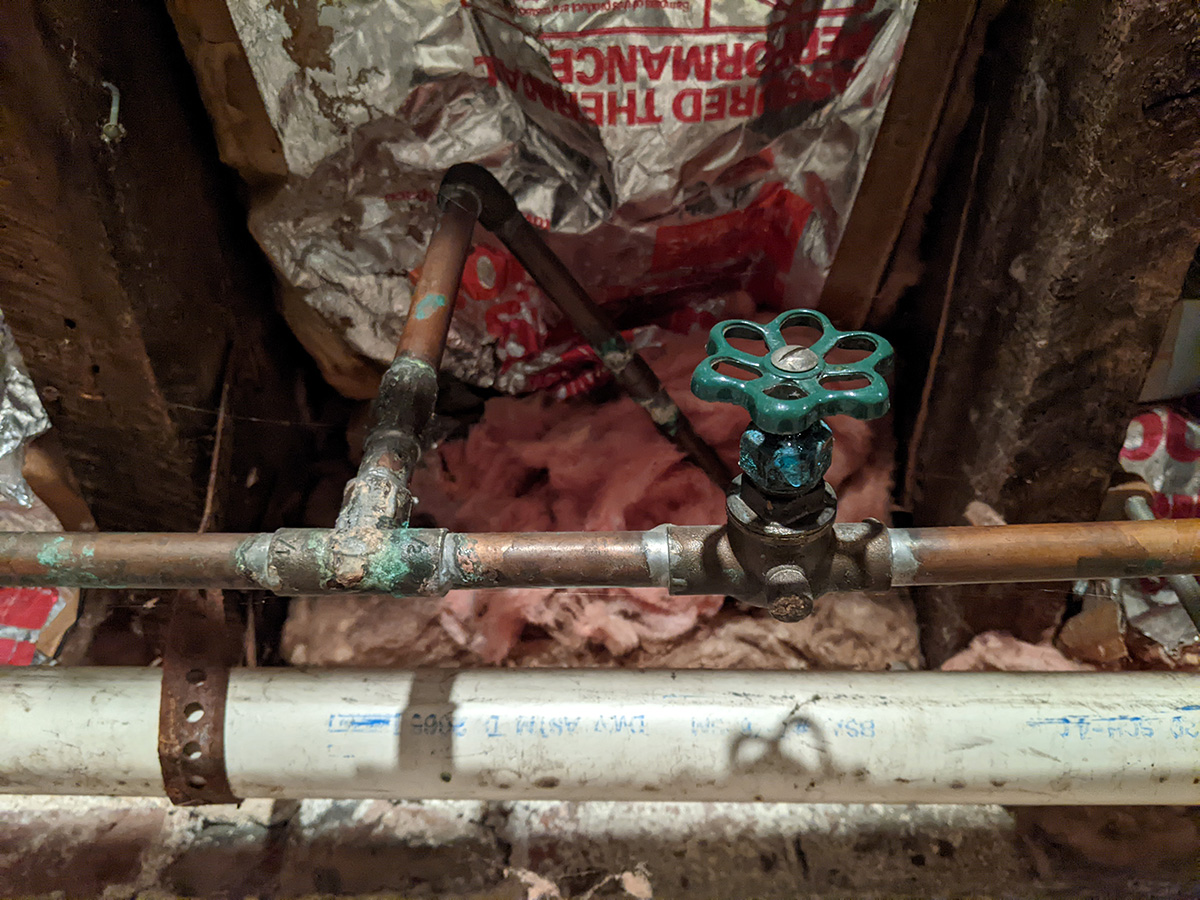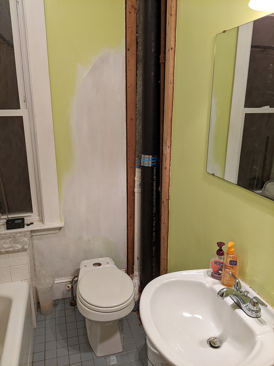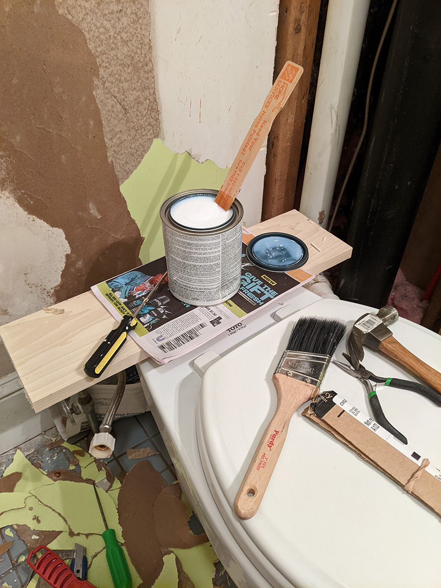 i'm excited to be finally working on my bathroom. it's ironic to be spending so much repairing a section of the bathroom that most people don't see anyway, since it'd be behind the toilet tank and the tall tiny bathroom shelving that's normally balanced on the tank. i think the hard part is the repair; once that's done, the painting will be quick.