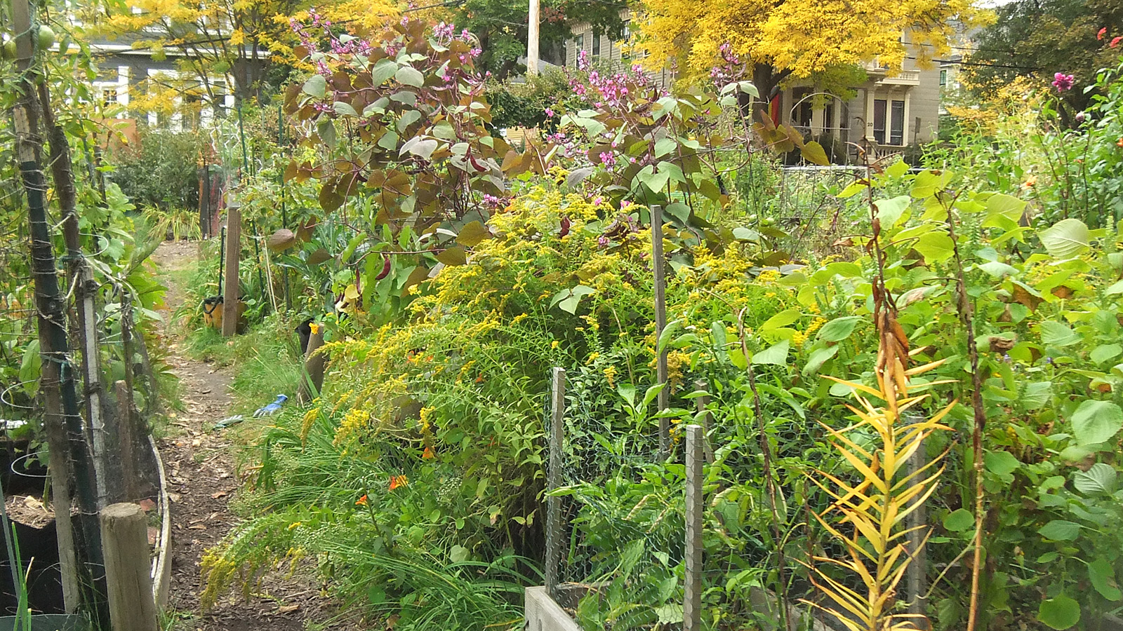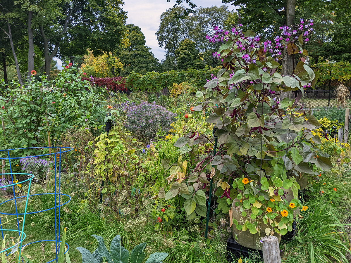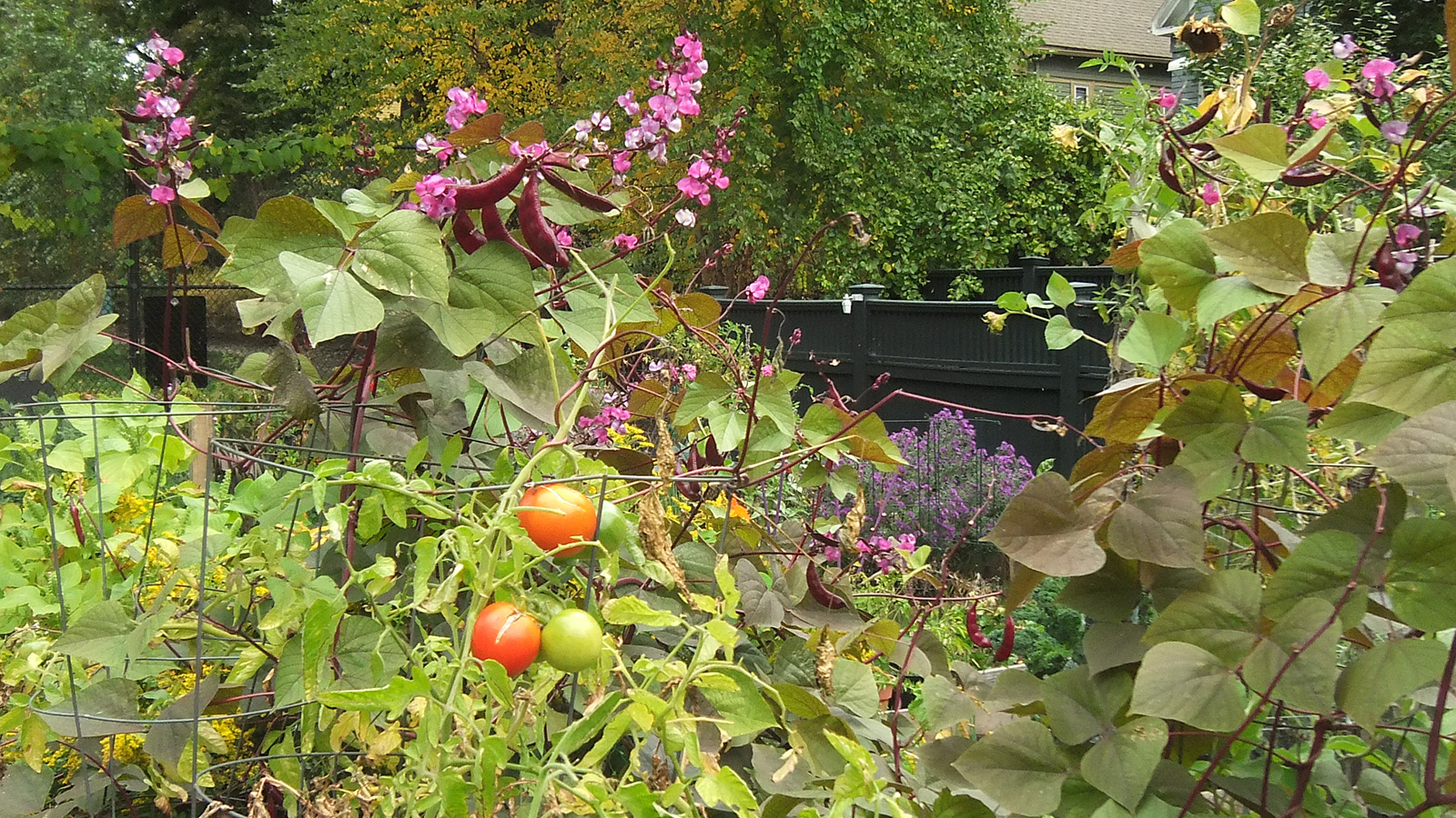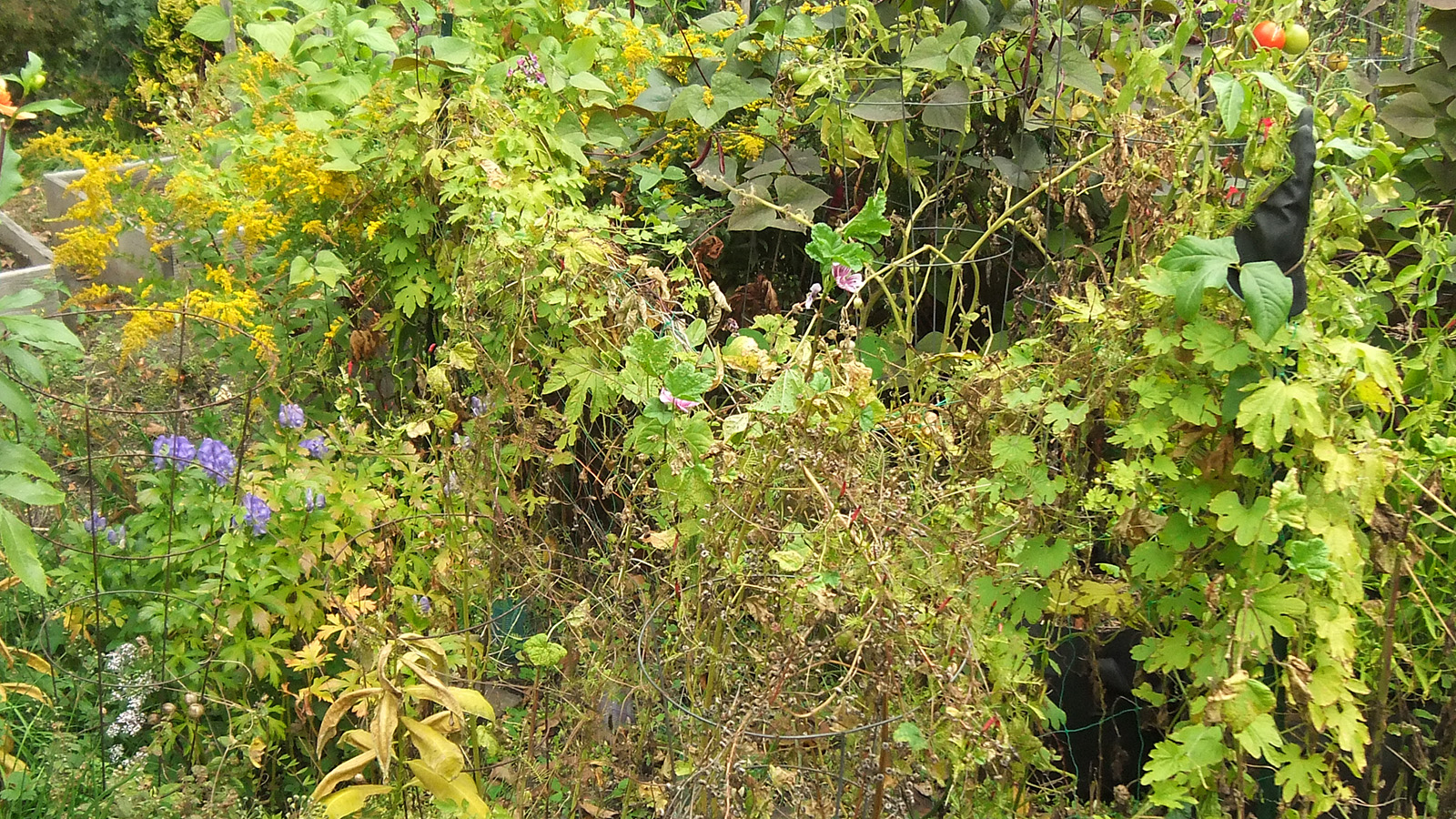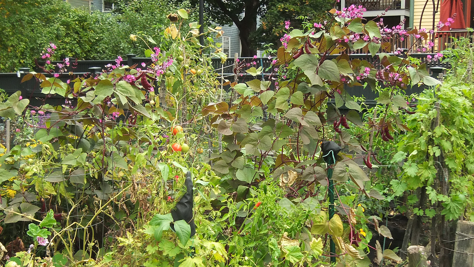 back at home, i walked down to the community garden to work on my plot. i got an e-mail from anne marie yesterday saying my garden was getting a little wild and suggested i trim it back from the paths. the last time i was there was 3 weeks ago. yes, my garden was a little crazy, but it wasn't that bad. i brought my 3D fuji camera to take some photos before starting to trim back the garlic chives and goldenrods, the main culprits. once that was done, i collected a few tomatoes and peppers (serrano and habaneros). there were tons of hyacinth beans but i wasn't in the mood to pick them, i'll do that some other time. besides, i felt some rain drops, and decided to head home before i got soaked.